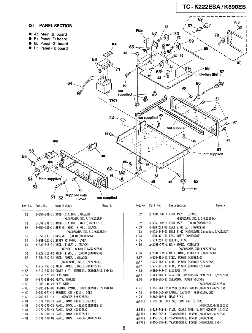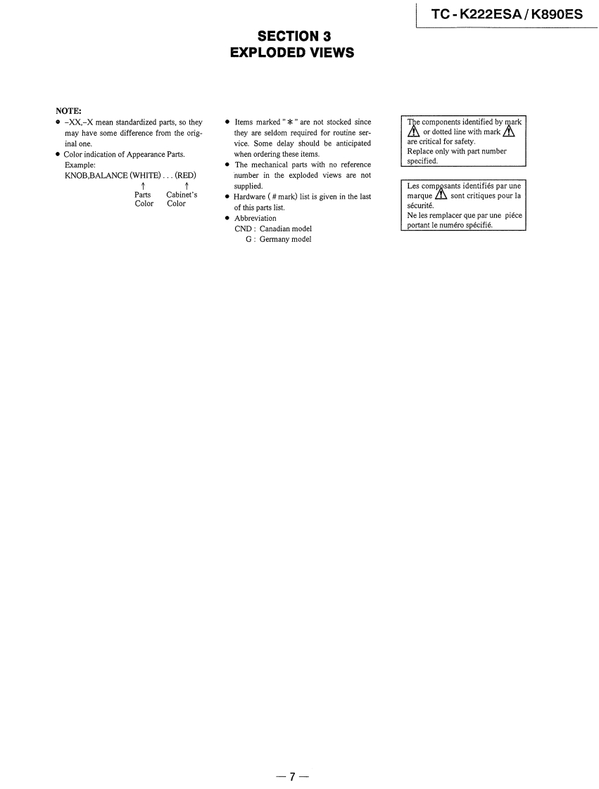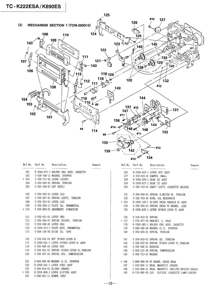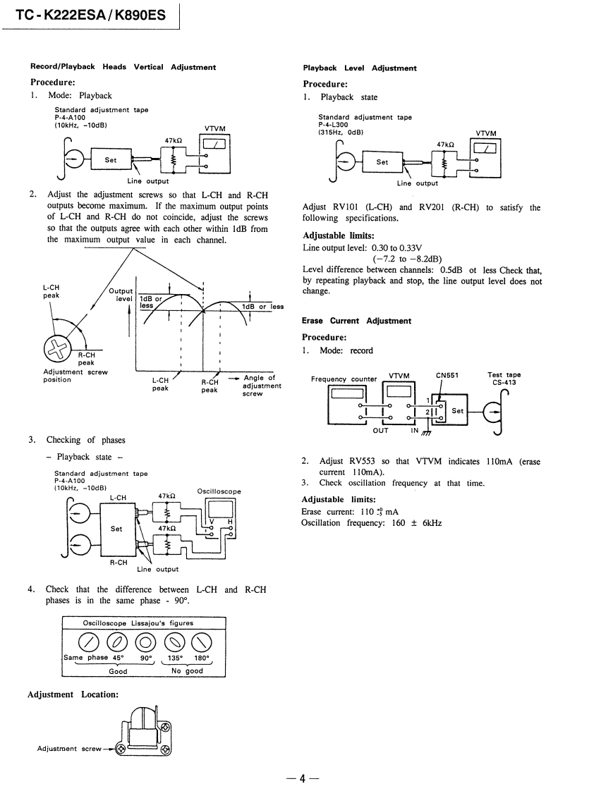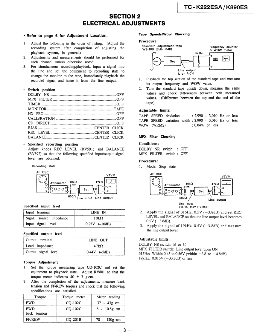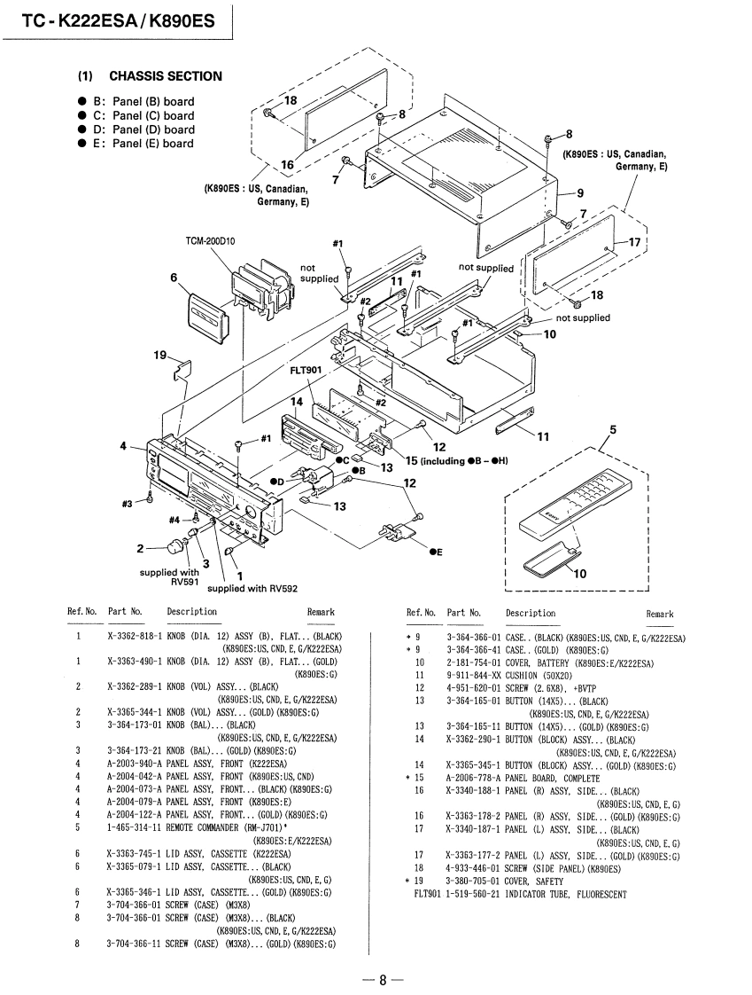 TC-K222ESA/K890ESSERVICE MA NUALUS ModelCanadian ModelGermany ModelTC-K890ESE ModelTC-K222ESA/K890ESPhoto TC-K890ESDolby noise reduction and HX Pro headroom extensionmanufactured under license from Dolby Laboratories LicensingCorporation.HX Pro originated by Bang Olufsen."DOLBY",the double-D symbol Do and "HX PRO"aretrademarks of Dolby Laboratories Licensing Corporation.Model Name Using Similar MechanismTC-K222ESGSPECIFICATIONSTape Transport Mechanism TypeTCM-200D10Recording system4-track 2-channel stereoFast winding timeApprox.90 sec.(with Sony C-60 cassette)BiasAC biasOutputsHeadsErasing head x 1(S&F head)Line outputsRated output level0.5 V at a load impedanceRecording head x 1 (LA head)(phono jacks)of 47 k ohmsPlayback head x 1 (LA head)MotorsCapstan motor x 1 (direct-drive linear torqueLoad impedanceOver 10 k ohmsBSL motor)Reel motorx1 (DC motor)HeadphonesOutput level0-3 mW at a loadWow and flutter±0.04%W.Peak(IEC)(stereo phone jack)impedance of 32 ohms0.024%W.RMS (NAB)±0.065%W.Peak(D1N)GeneralSignal-to-noise ratio (at peak level)Power requirementsUS,Canadian model:CassetteType IV (SonyType llType I120V AC,60Hz(Dolby NR OFF)Metal-S/Select)(Sony UX-S)(Somy HF-S)Germany model:220-230V AC (or 240V AC61 dB59 dB57 dBadjustable by Sony personall,50/60HzMeasured at peak level weighted without NR.The S/N is improved by about15 dB at 500 Hz and by about 20 dB about 1 kHz with Dolby-C NR on,and byE model:5 dB at 1 kHz and by 10 dB about 5 kHz with Dolby-B NR on.120,220 or 240V AC adjustable,50/60HzHarmonic distortion0.4%(with Sony Type 1.160 nWb/m.Power consumption23W315 Hz,3rd H.D.)DimensionsApprox..470×135×350mm(w/hd1.3%(with Sony Type IV,250 nWb/m,(18h×56×13/s inches)315 Hz,3rd H.D.)including projecting parts and controlsFrequency response(DOLBY NR OFF)WeightApprox.8.1 kg (17 Ibs 14 oz)Type IV cassette20-22,000Hz(仕3dB,1EC)Audio connecting cords (2)(Sony Metal-S/Select)20-16.000 Hz [3 dB.(-4 dB recording)]Supplied accessoriesScrews (4)Type ll cassetteWireless remote commander RM-J701 (1)*20-20,000Hz±3dB,1EC)(Sony UX-S)Sony SUM-3(NS)batteries(2)Not supplied with model for Canada and European countriesType I cassette20.17.000Hz(仕3dB,1EC)(Sony HF-S)Design and specifications are subject to change without notice.InputsNoteLine inputsSensitivity0.16VThis appliance conforms with EEC Directive 87/308/EEC regardinginterference suppression.(phono jacks)Input impedance47 k ohmsCD DIRECT INPUTInput impedance47 k ohmsSTEREO CASSETTE DECKSONY