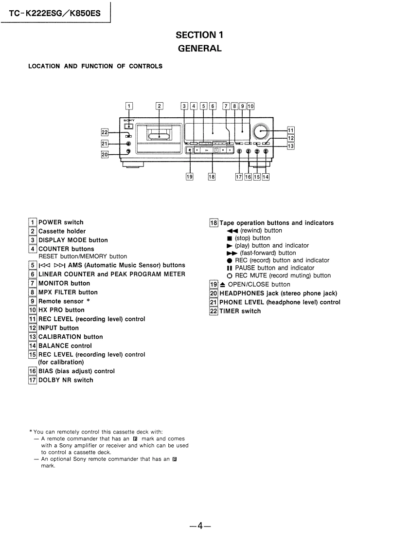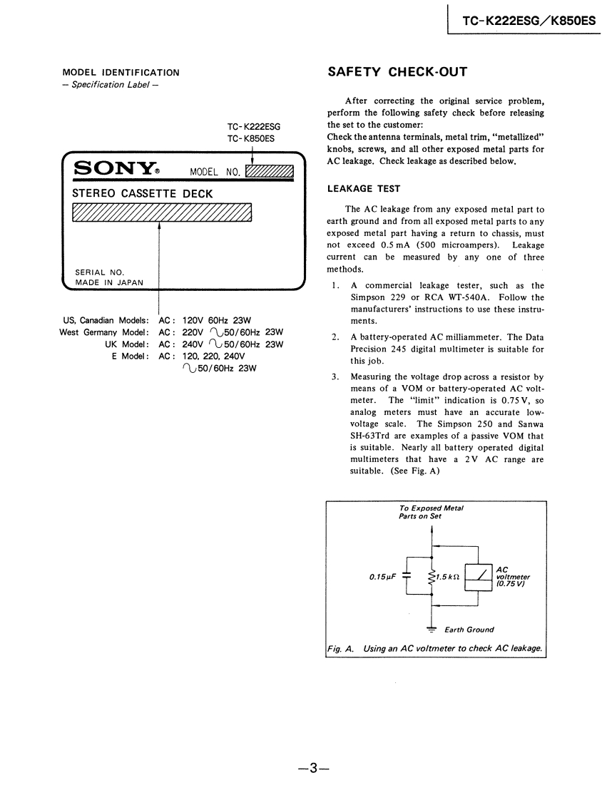 TC-K222ESG/K850ESSERVICE MANUALUS ModelCanadian ModelUK ModelWest Germany ModelTC-K850ESEModel0TC-K222ESGTC-K850ESDolby noise reduction manufactured under license fromDolby Laboratories Licensing Corporation"DOLBY"and the double-D symbol Do are trademarks ofDolby Laboratories Licensing CorporationModel Name Using Similar MechanismNewTape Transport Mechanism TypeTCM-200D2SPECIFICATIONSRecording system4-track 2-channel stereoOutputsBiasAC biasLine outputsRated output level0.44 V(-5 dB)at aHeadsErase head x1(S&F head)(phono jacks)Recording head x 1 (Permalloy head)load impedance47k ohmsPiayback head×1 LA headMotorsCaostan molorx 1Load impedanceOver 10k ohms(direct drive linear torque BSL motor)HeadphonesOutput levelReel motor x 1 (DC motor)(stereo phone jackDC motor×1ohmsWow and flutter0.024%WRMS (NAB).0.065%(DIN)Fast-forward and rewind timeGeneralApprox.90 sec.(with C-60 cassette)Power requirementsFrequency response (DOLBY NR OFF)W%e28c.stabeTYPE IV cassette15-21.000Hz±3dB.DNby Sony personnel),50/60 Hz(Sony METAL-ES)15-16,000 Hz (OVU recording)US.Canadian model:120 V AC,60 HzTYPE ll cassetteUK model:(Sony UX-S)15-19,000H2(±3dB,D1N15-17.000Hz(±3dB,DIME model:120.220,or 240 V AC adjustable.Signal-to-noise ratio (at peak level)50/60 HzDolby NR switchOFFB-TYPEC-TYPEPower consumption23WCassetteONONDimensionsTYPE IVSony METAL-ES)61 dB70d876 dBApprox.470 x 135 x 350 mm (wlhid)*(18%x5/13%inches)*TYPE II (Sony UX-S)59 dB68 dB74 dBWeightApprox.6.9 kg (15 lbs 4 oz)TYPE I(Sony HF-S)57 dB66 dB72 dBApprox.7.9 kg (17 Ibs 7 oz)*including projecting parts.controls and wooden side panelsTotal harmonic distortionSuppliedaccessoryAudio connecting cord (2)1.0%(with Sony METAL-ES cassette)Optional accessoryWireless remote control unit RM-J701Line inputsSensitivity77.5mW(-20cBDesign and specifications subject to change without notice.cksInput impedance50k ohmsNote(phono jacks)This appliance conforms with EEC Directive 87/308/EEC regardinginterference suppression.STEREO CASSETTE DECKSONY
