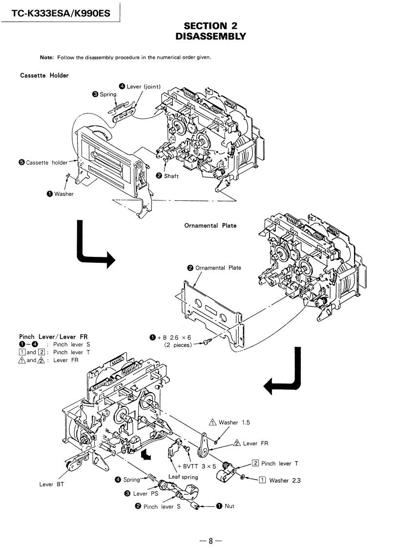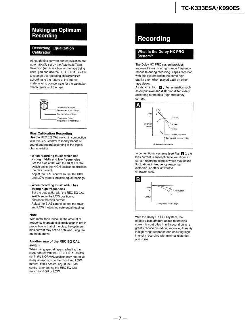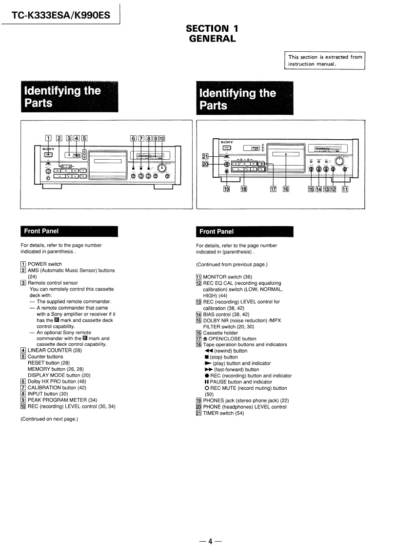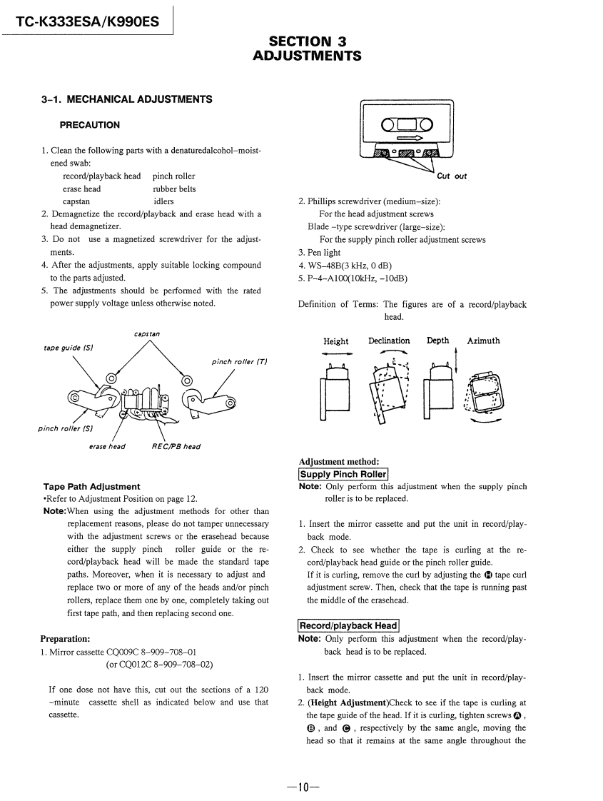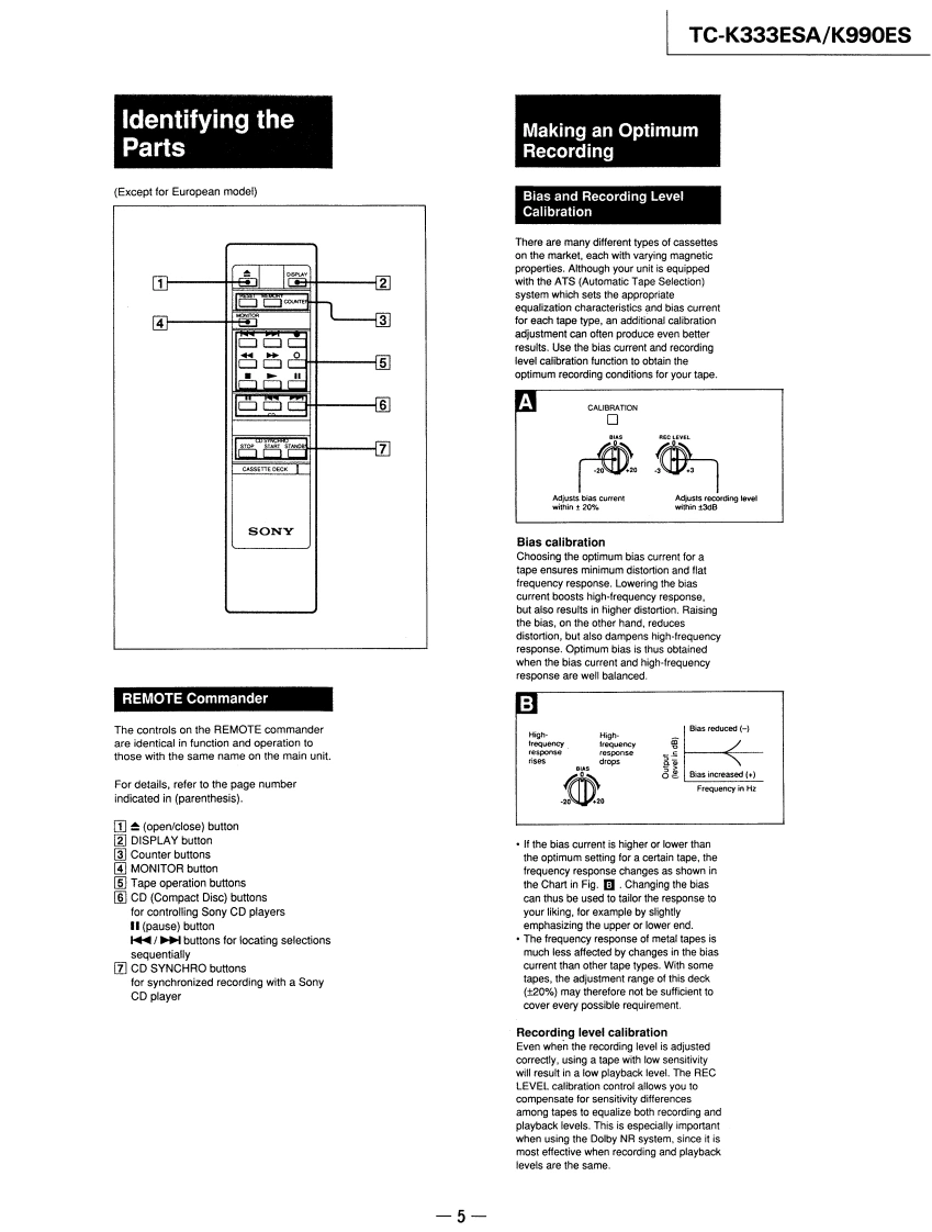 TC-K333ESA/K990ESSERVICE MANUALAEP ModelTC-K990ESEModelTC-K333ESADolby noise reduction and HX Pro headroom extensionmanulactured under license from Dolby Laboratories LicensingCorporation.HX Pro originated by Bang Olufsen.DOLBY",the double-D symbo D0 and "HX PRO'are trademarksof Doty Laboratones Licensing Corporation.Model Name Using Similar MechanismTC-K333ESGSPECIFICATIONSTape Transport Mechanism TypeTCM-200D10Recording system4-track 2-channel stereoOutputsFast winding timeApprox.90 sec.(with Sony C-60 cassette)BiasAC biasLine outputsRated output level0.5 V at a load impedanceHeadsErasing head x 1 (S&F head)(phono jacks)of 47 k ohmsRecording head x 1 (LA head)Load impedanceOver 10 k ohmsPlayback head x 1 (LA head)MotorsCapstan motor×1HeadphonesOutput level0-3 mW at a load(direct-drive linear torque BSL motor)(stereo phone jack)impedance of 32 ohmsReel motor x 1 (DC motor)Signal-to-noise ratio (at peak level)GeneralCassetteType IV(SonyType llType lPower requirementsAEP model:(Dolby NR OFFMetal-S)(Sony UX-S)Sony HF-S)220.230VAC.(or240VACadjustable by Sony personnel)61 dB59 dB57 dB5060HzE model:Measured at peak level weithted without NR.The S/N is improved by about120.220,or 240 V AC adjustable,15 dB at 500 Hz and by about 20 dB about 1 kHz with Dolby-C NR on,and by50/60Hz5 dB at 1 kHz and by 10 dB about 5 kHz with Dolby-B NR onPower consumption31WDimensionsApprox..470×140×380mm(whd)Harmonic distortion1.3%(with Sony Metal-S 250 nWb/m,315 Hz(18h×5h×15 inches)3rd H.D.)including projecting parts and controlsFrequency response(Dolby NR OFF)WeightApprox.12.0 kg (26 bs 8 oz)Type IV cassette15-22,000 Hz (3 dB,IEC)Model for other countries:Approx.11.2kg(Sony Metal-S)15-16.000 Hz [3 dB (-4dB recording)]Supplied accessoriesAudio connecting cords(2)Type ll cassette15-20,000Hz3dB.lEC)Screws (8)(Sony UX-S)Wireless remote commander(1)Sony SUM-3(NS)batteries (2)"Type I cassette15-18,000Hz3dB.IEC)Not supplied with model for European countries(Sony HF-S)Design and specifications are subject to change without notice.Wow and flutter±0.04%W,Peak(IEC)0.022%W.RMS (NAB)Note±0.0B5%W.Peak(DiN)This appliance conforms with EEC Directive 87/308/EEC regardingInputsinterference suppression.Line inputsSensitivity0.16V(phono jacks)Input impedance47 k ohmsCD DIRECT INPUTInput impedance47 k ohmsSTEREO CASSETTE DECKSONY