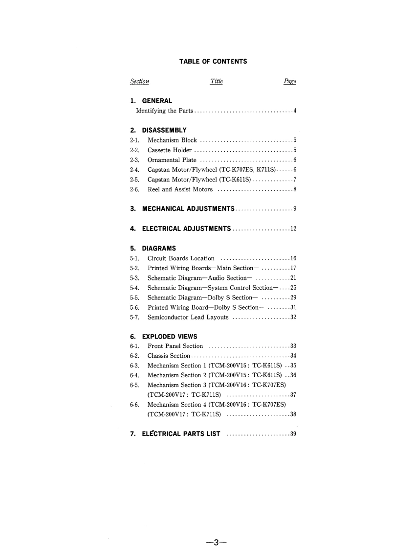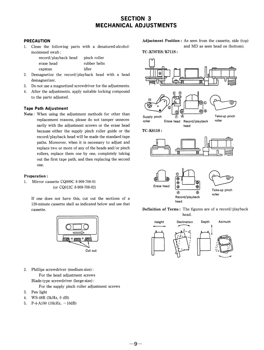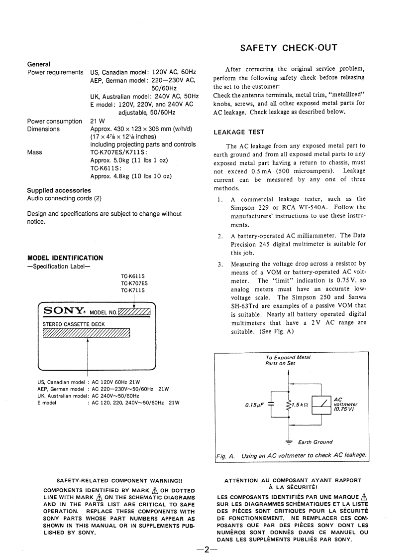TC-K611S/K707ES/K711SSERVICE MANUALUS ModelCanadian ModelTC-K611S/K707ESAEP ModelTC-K611S/K711SUK ModelTC-K611SE ModelTC-K707ESAustralian ModelPhoto:TC-K611STC-K611S/K707ESDolby noise reduction manufactured under license fromModel Name Using Similar MechanismTC-K679ES/K690Dolby Laboratories Licensing Corporation."DOLBY"and the double-D symbol Do are trademarks ofTC-K611STCM-200V15Dolby Laboratories Licensing Corporation.Tape TransportTC-K707ESTCM-200V16Mechanism TypeTC-K711STCM-200V17SPECIFICATIONSRecording system4-track 2-channel stereoFrequency response(Dolby NR off)Fast winding timeApprox.90 sec.(with Sony C-60Type IV cassetteTC-K707ES:20-21,000Hz (3dB,IEC)cassette)(Sony ES-IV)TC-K611S/K711S:20-20.000HzBiasAC bias(±3dB.IEC)20-16,000Hz [+3dB(-4dB recording)]HeadsErasing head x 1Type ll cassetteTC-K707ES:20-19,000Hz (3dB,IEC)(TC-K707ES/K711S:S&F(Sony UX-S or UX)TC-K611S/K711S:20-18.000Hzhead,K611S:F&F head)(±3dB,IECRecording head x 1(SD head)Type I cassettePlayback head×1(Sony HF-S)20-17,000Hz(±3dB,1EC)(TC-K611S/K711S:SDWow and flutter±0.09%W,Peak(lEC)head,K707ES:LA head)0.05%W.RMS (NAB)MotorsCapstan motor x 1(DC servo motor)±0.14%W.Peak(DIN)Reel motor x 1 (DC motor)InputsAssist(mechanism drive)motor x 1Line inputsSensitivity0.16V(DC motor)(phono jacks)Input impedance47 k ohmsSignal-to-noise ratio(at peak level and weighted)OutputsCassetteType IVType llType lLine outputsRated output0.5 V at a load(Dolby NR off)(Sony ES-IV)(Sony UX-S(Sony HF-S)(phono jacks)levelimpedance ofor UX)47 k ohms61 dB59 dB57 dBLoadOver 10 k ohmsimpedanceS/N ratio improvement (approximate values)HeadphonesOutput level0-3 mW at a loadWith Dolby B NR on 5 dB at 1 kHz;10 dB at 5 kHzstereo phone jack)impedance ofWith Dolby C NR on 15 dB at 500 Hz;20 dB at 1 kHz32 ohmsWith Dolby S NR on 10 dB at 100 Hz;24 dB at 1 kHzContinued on next pageHarmonic distortion0.4%(with Sony HF-S,160 nWb/m,STEREO CASSETTE DECK315 Hz,3rd H.D.)1.5%(with Sony ES-IV,250 nWb/m,315 Hz,3rd H.D.)SONY