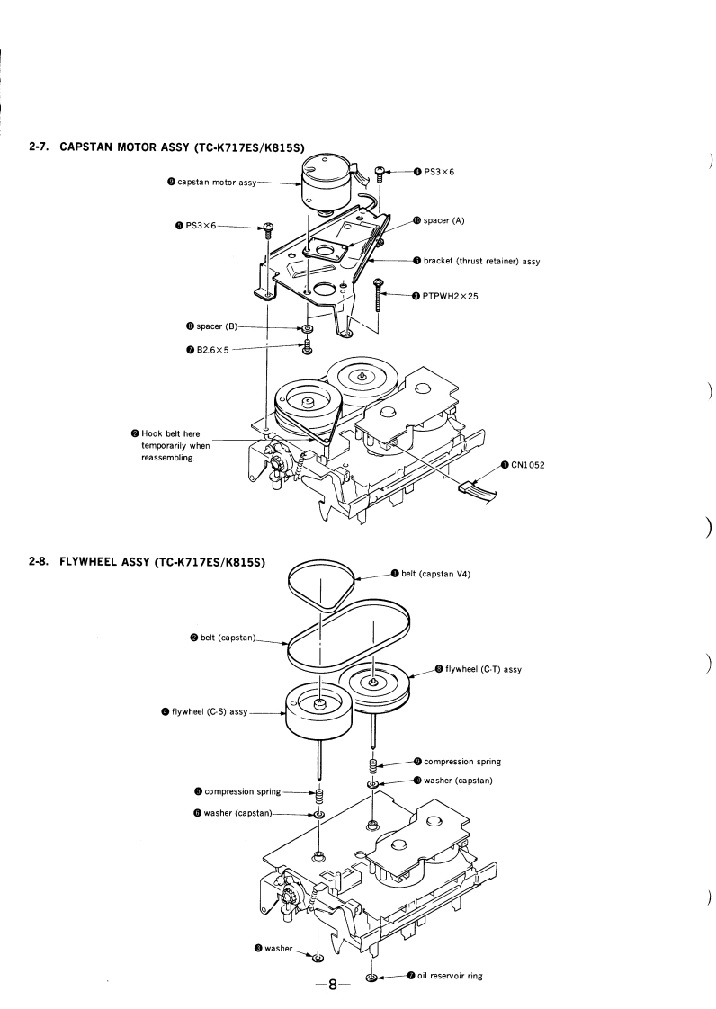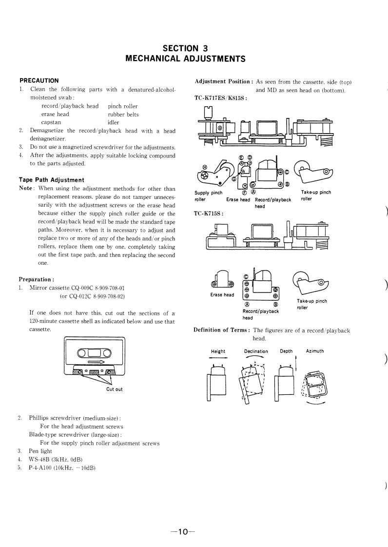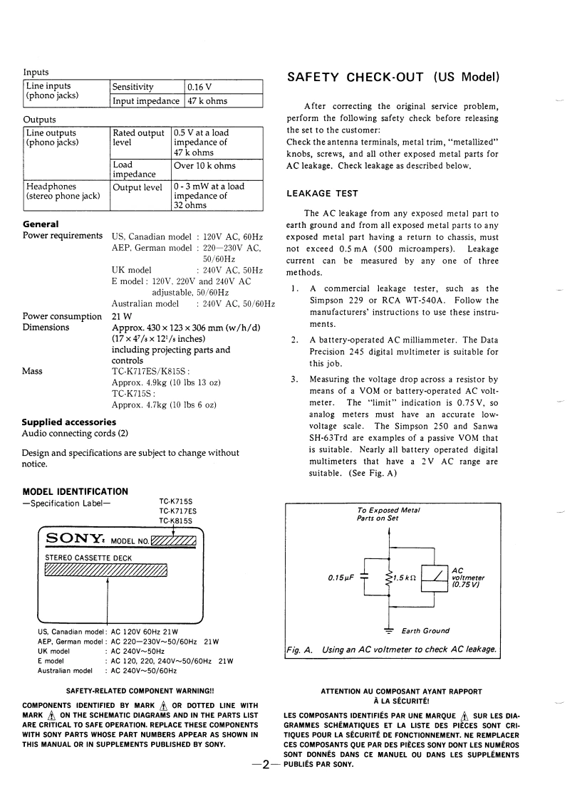 TC-K715S/K717ES/K815SSERVICE MANUALUS ModelCanadian ModelVer1.12001.06TC-K717ESAEP ModelTC-K715S/K815SUK ModelTC-K715SE ModelTC-K717ESPhoto:TC.K717ESAustralian ModelTC-K715SDolby noise reduction manufactured under license from Dolby Laboratories Licensing Corporation.Model Name Using Similar Mechanism TC-K611S/K707ES/K711S"DOLBY'and the double-D symbol O are trademarks of Dolby Labora-TC-K715STCM-200V18tories Licensing Corporation.Tape TransportTC-K717ESTCM.200V19Mechanism TypeTC-K815STCM.200V20SPECIFICATIONSRecording system4-track 2-channel stereoFrequency response (Dolby NR off)Fast winding timeApprox.90 sec.(with Sony C-60cassette)Type IV cassetteTC.K717ES:20-21,000Hz (+3dB,IEC)T℃-K715S/K815S:20-20.000HzBiasAC bias(±3dB.IECHeadsErasing head×l(TC-K717ES/K815S S&F20-16,000Hz [+3dB (-4dB recording)head.K715S:F&F head)Type II cassetteTC.K717ES:20-19,000Hz (+3dB,IEC)Recording headx1 (SD head)T℃-K715S/K815S:20-18.000Hz(±3dB,IEC)Playback headx1(TC-K715S/K815S:SDType I cassette 20-17.000Hz (+3dB,IEC)head,K717ES:LA head)Type IV:Sony Type IV (METAL)MotorsCapstan motor x 1 (DC servo motor)TypeⅡ:Sony Type II(HIGH)Reel motor x 1(DC motor)Type I Sony Type I (NORMAL)Assist (mechanism drive)motor x 1(DC motor)Wow and flutter +0.06%W.Peak (IEC)(TC-K717ES/K815S)+0.065%W.Peak (IEC)(TC-K715S)Signal-to-noise ratio(at peak level and weighted)0.04%W.RMS (NAB)(TC-K717ES/K815SCassetteType IVType IIType I0.045%W.RMS (NAB)(TC-K715S)(Dolby NR off)61 dB59 dB57 dB+0.11%W.Peak (DIN)(TC-K717ES/K815S)0.12%W.Peak (DIN)(TC-K715S)S/N ratio improvement (approximate values)With Dolby B NR on:5 dB at 1 kHz;10 dB at 5 kHz-Continued on next page-With Dolby C NR on:15 dB at 500 Hz;20 dB at 1 kHzWith Dolby S NR on 10 dB at 100 Hz;24 dB at 1 kHzHarmonic distortion 0.4%(with Type I,160 nWb/m,315 Hz,3rd H.D.)STEREO CASSETTE DECK1.5%(with Type IV,250 nWb/m,315 Hz,3rd H.D.)SONY