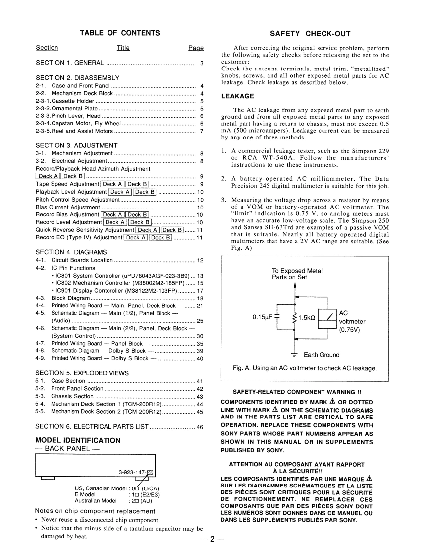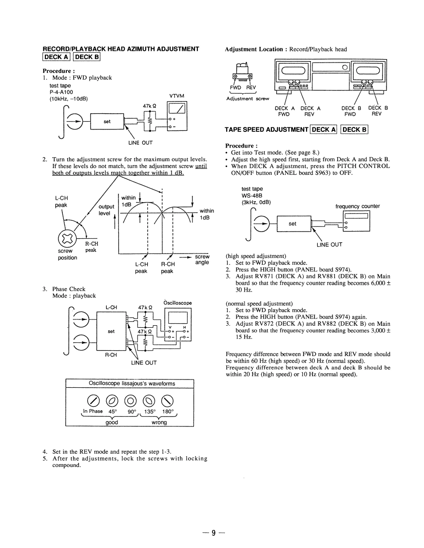 TC-WA9ESSERVICE MANUALUS ModelCanadian ModelEModelAustralian ModelDolby noise reduction and HX Pro headroom extensionmanufactured under license from Dolby Laboratories LicensingModel Name Using Similar MechanismNEWCorporation.HX Pro originated by Bang Olufsen.Tape Transport Mechanism TypeTCM-200R12"DOLBY",the double-D symbol 0 and"HX PRO"are trademarksof Dolby Laboratories Licensing Corporation.SPECIFICATIONSSystemOutputsRecording system4-track 2-channel stereoLine outputs (phone jacks)Rated output level:05 V at a load impedance ofFast winding time (apprer.)47 kilo90 sec.(with Sony C-60 cassette)BiasAC biasSignal-to-noire rati(at peak level,weighted,and with)32 ohmsGeneralypePower requirementsSN ratie imecovement lapproximate values)US,Canadian model 120 V AC,60 HzWith Dolby B NR on:5dB at 1 kHz,10dB at5 kHzAustralian model240VAC,5060HzWith Dolby C NR on:15 dB at 500 Hz,20 dB at 1 kHzE model120220240VAC.5060HzWith Dolby S NR on:10 dB at 100 Hz,24 dB at 1 kHzPower coHarmanic distertion04(with Type 1 tape,Sony Type i (NORMAL160 nWb/m 315 Hz,3rd H.D)Dimensions (apprex)(wih/d)器化Typ IV (METAL430×135¥350mm{w/h/017×5A×13 Th inches)Freqency response (Dolby koff)including projecting parts and controisType I tape,Sony Type 1 (NORMAL):25-16,000 HzMass (approx.)dB,IEC)65kg140s602doyTypel HGH0Supplied accessoriesType IV tape,Sony Type IV (METAL):25-20,000 Ha(2phono plugs-2 phono(US,Canadian model).25-19,000 Hz (E.Australian model)mander RM-J903 (1)*(,IEC)Souy size AA (R6)batteries (30-15.000 Hx (3 dB,-4 dB recording)not supplied with the US,Canadian modelsWow and flutter±0.09%W.Peak (IEC)0.05察W.RM5NAt0.16%W.Peak (DIN)Variable pitch range (appror300303hpu地Line inputs (phono jacks到Sersitivity 0.16VInput impedance:47 kllohmsSTEREO CASSETTE DECKSONY
