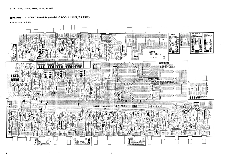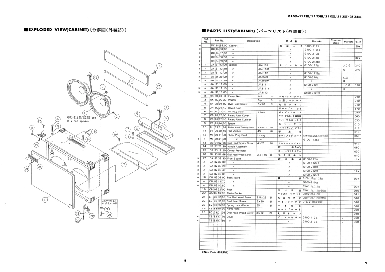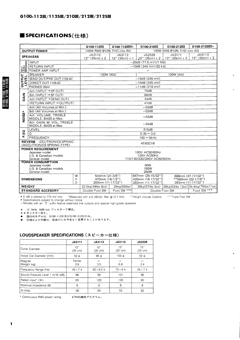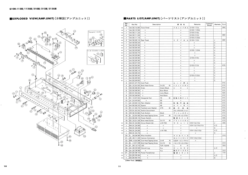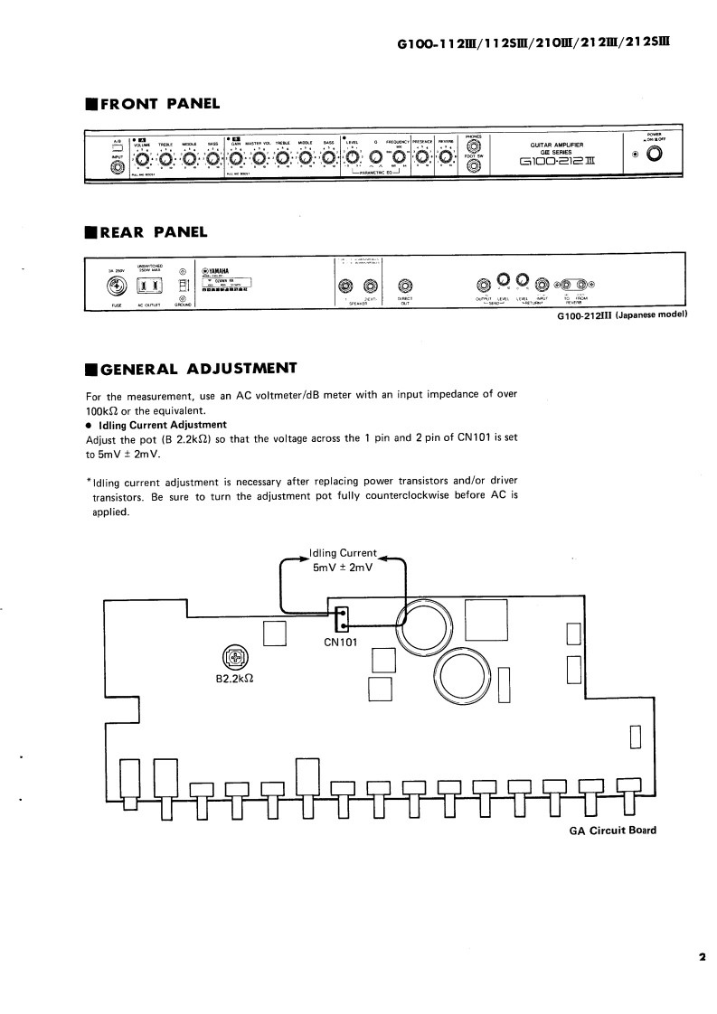 GUITAR AMPLIFIERG100-112Ⅲ/112SⅢ/210Ⅲ/212Ⅲ/212SⅢExcept U.S.SERVICE MANUAL8。…。·……8:YAMAHAYAMAHAG100-112I1G100-2121Π■CONTENTS(目次)SPECIFICATIONS(仕楼)..···,,······1PARTS LIST (AMP.UNIT)FRONT PANEL.,,············-yyx(7>1=y卜).1/12REAR PANEL,·········EXPLODED VIEW (FOOT SW ASSEMBLY).....13GENERAL ADJUSTMENT2〔分解☒(7y下又亻y于Ass'y)〕绸整····3PARTS LIST (FOOT SW ASSEMBLY)....,13PRINTED CIRCUIT BOARD.............47〔-y刂又卜(7y卜又y于As5y)EXPLODED VIEW(CABINET)8PARTS LIST (ELECTRICITY)14/15〔分解☒(外装部))〔一以刂又卜(霉气部))PARTS LIST (CABINET)SCHEMATIC DIAGRAM(回路☒),,······,16〔-y)又卜(外装部))EXPLODED VIEW (AMP.UNIT)10〔分解☒(了>ブ1二y卜)〕SINCE 1887YAMAHA[006593NIPPON GAKKI CO.,LTD.HAMAMATSU.JAPAN'84.4 1.8K-292 Printed in Japan