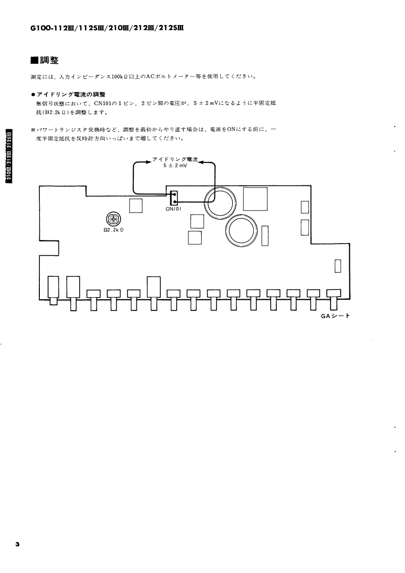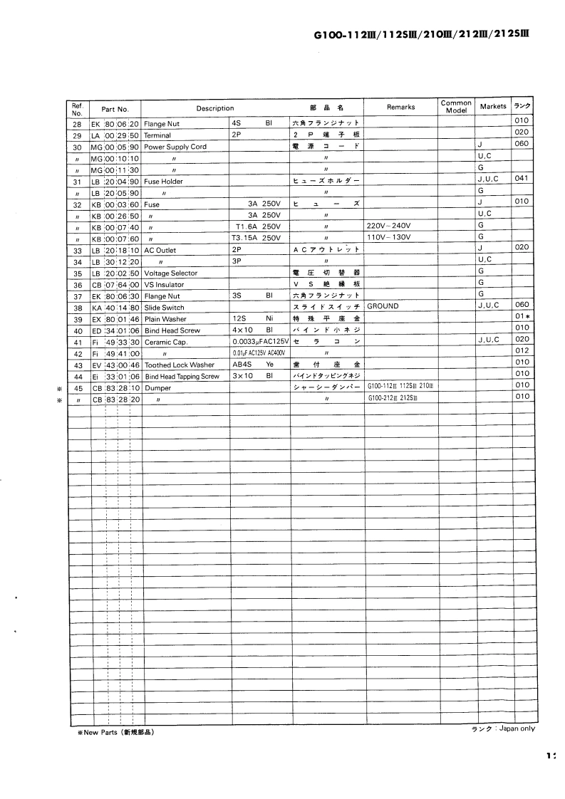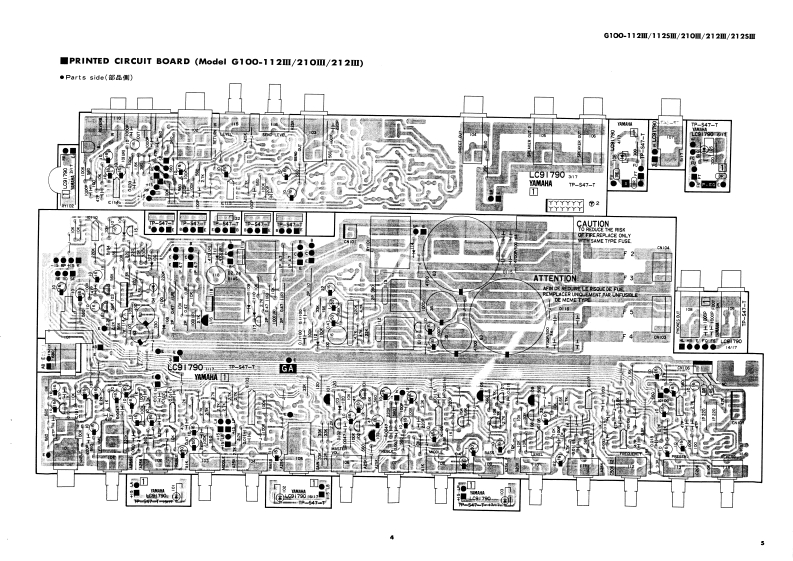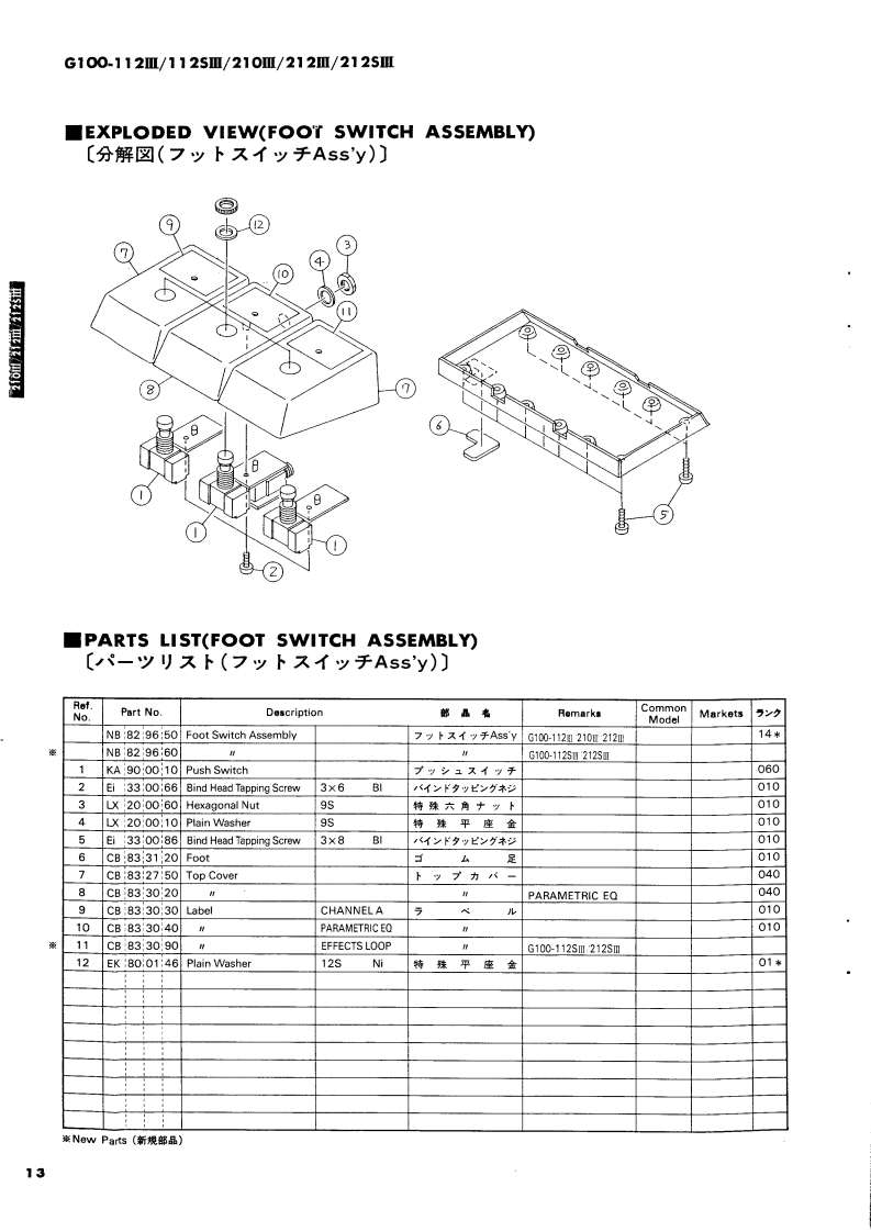 GUITAR AMPLIFIERG100-112Ⅲ/112SⅢ/210Ⅲ/212Ⅲ/212SⅢExcept U.S.SERVICE MANUAL8。…。·……8:YAMAHAYAMAHAG100-112I1G100-2121Π■CONTENTS(目次)SPECIFICATIONS(仕楼)..···,,······1PARTS LIST (AMP.UNIT)FRONT PANEL.,,············-yyx(7>1=y卜).1/12REAR PANEL,·········EXPLODED VIEW (FOOT SW ASSEMBLY).....13GENERAL ADJUSTMENT2〔分解☒(7y下又亻y于Ass'y)〕绸整····3PARTS LIST (FOOT SW ASSEMBLY)....,13PRINTED CIRCUIT BOARD.............47〔-y刂又卜(7y卜又y于As5y)EXPLODED VIEW(CABINET)8PARTS LIST (ELECTRICITY)14/15〔分解☒(外装部))〔一以刂又卜(霉气部))PARTS LIST (CABINET)SCHEMATIC DIAGRAM(回路☒),,······,16〔-y)又卜(外装部))EXPLODED VIEW (AMP.UNIT)10〔分解☒(了>ブ1二y卜)〕SINCE 1887YAMAHA[006593NIPPON GAKKI CO.,LTD.HAMAMATSU.JAPAN'84.4 1.8K-292 Printed in Japan
