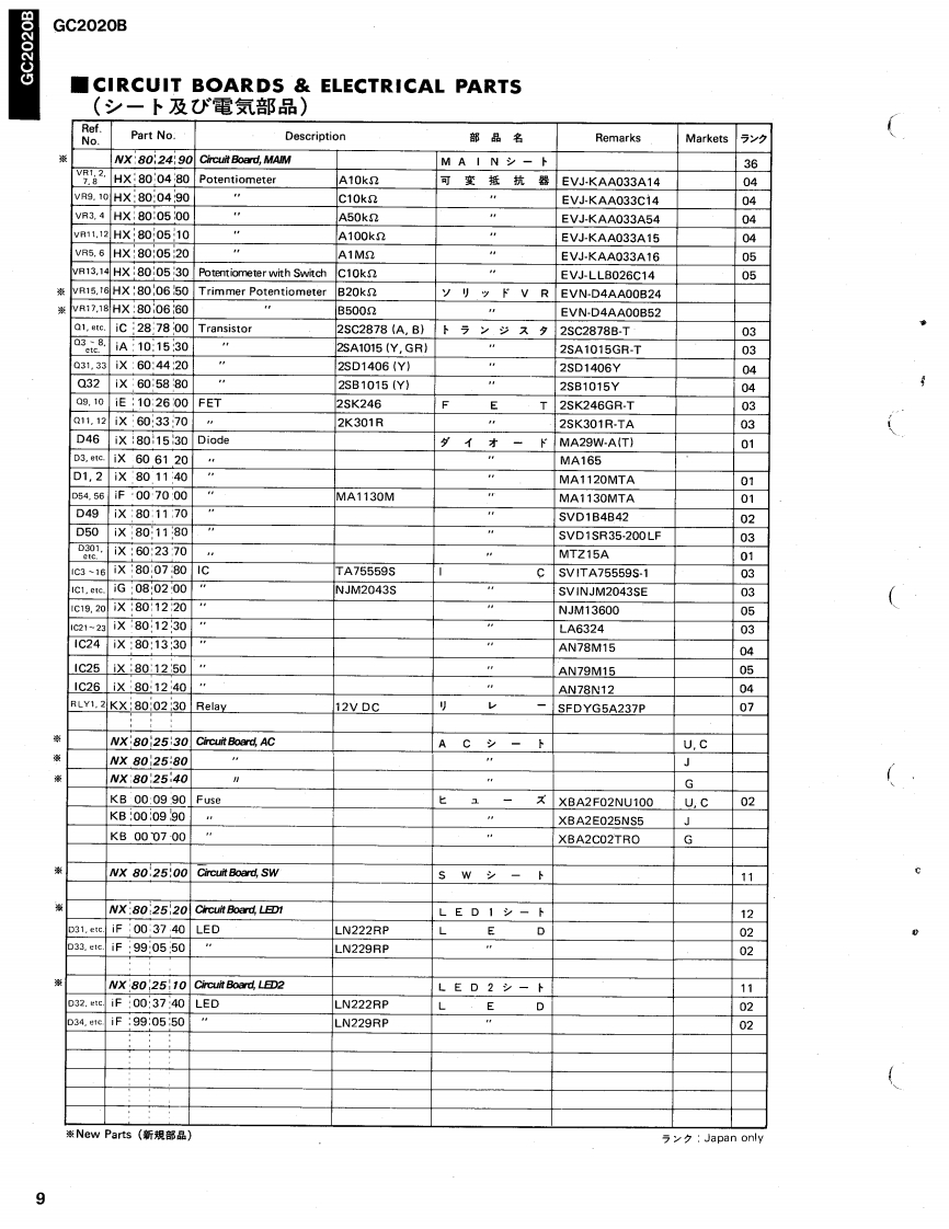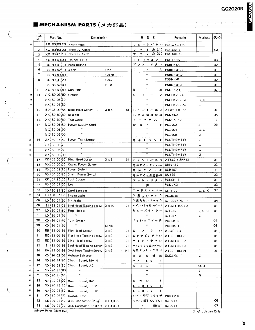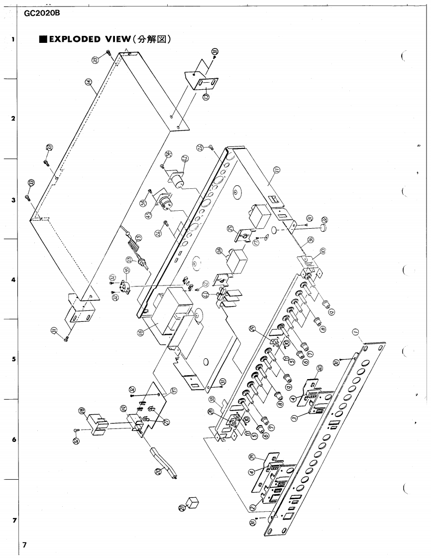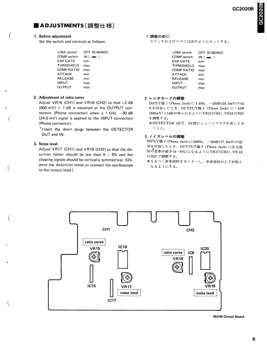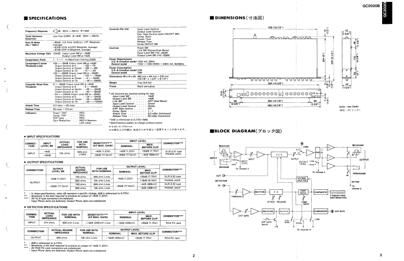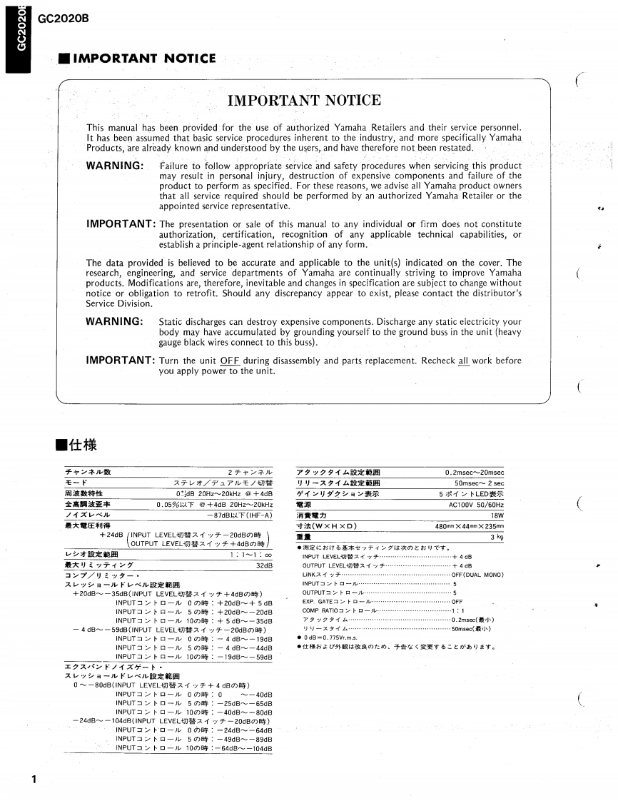 2-Channels Compressor/LimiterGC2020BSERVICE MANUAL■FRONT PANELYAMAHA@0可可首@0i0@可可可00■REAR PANEL@。苦苦■CONTENTS(目次)IMPORTANT NOTICE.ADJUSTMENTS(稠整仕横),···············,6SPECIFICATIONS(仕樣).EXPLODED VIEW(分解☒).·····.········,7DIMENSIONS(寸法☒).········,,···········3MECHANISM PARTS(力部品).··8BLOCK DIAGRAM(プ口y夕☒),,··········3CIRCUIT BOARDS&ELECTRICAL PARTS(-卜及UE数部品).9CIRCUIT BOARDS(之-卜☒),·,········4/5SINCE 1887006721]YAMAHANIPPON GAKKI CO.,LTD.HAMAMATSU,JAPAN2.4K-221 Printed in Japan '86.10