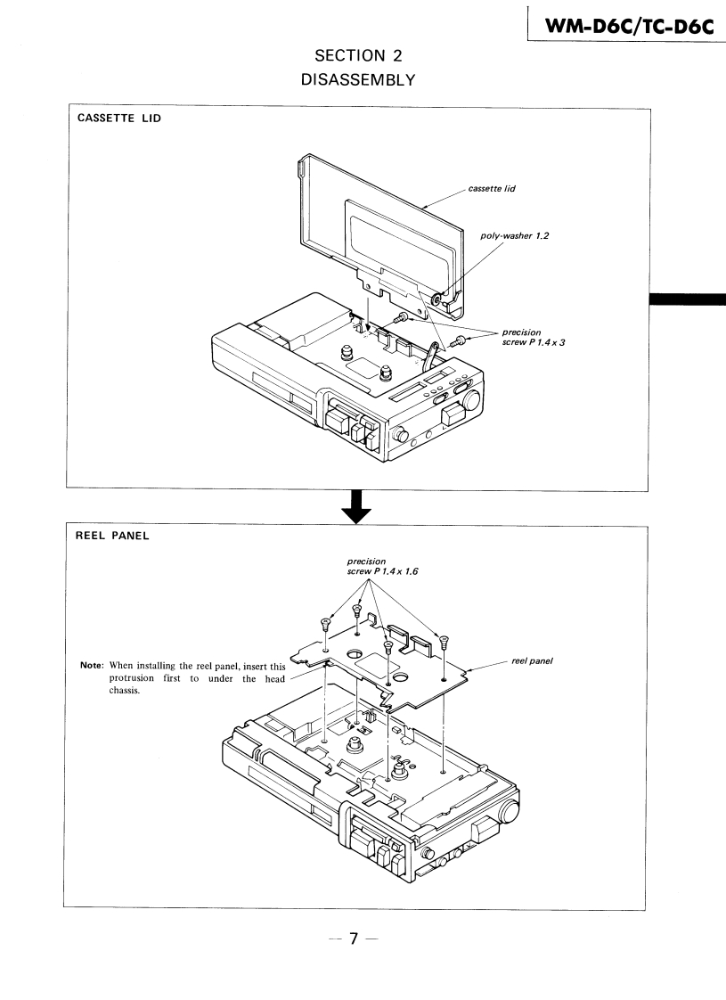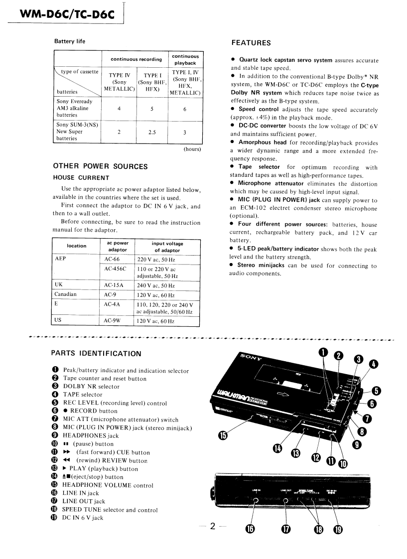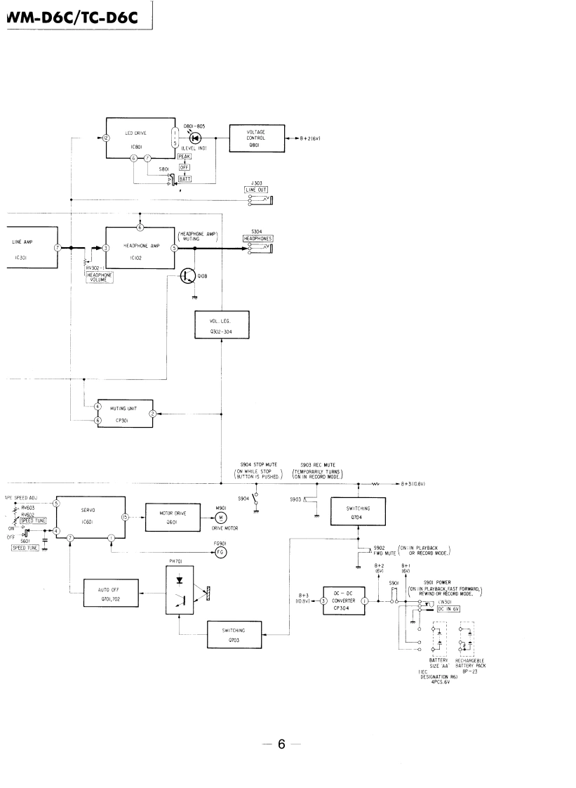 WM-D6C/TC-D6CSERVICE MANUALRefer to MDR-40L Service Manual issued previouslyfor information of headphones supplied withWM-D6C.Ver1.12001.06Refer to ECM-939LT Service Manual issued previous-ly for information of headphones supplied withTC-D6C.WM-D6C:US ModelCanadian ModelAEP ModelUK ModelE Model'Dolby'and the double-D symbol are the trade marks ofDolby Laboratories Licensing Corporation.Noise reductionTC-D6C:system manufactured under license from Dolby LaboratoriesLicensing Corporation.US ModelSPECIFICATIONSRecording System:4-track,2-channel stereoWow and Flutter:±0.14%{DIN)Tape Transport Mechanism TypeMT-D6C-200.04%WRMS (NAB)Tape Speed Deviation::0.3%(speed tuning OFF)Outputs:LINE OUT (stereo minijack)x 1Speed Tuneroutput level 0.25 V(-10 dB)(less thanVariations:Approx.±4%4.7 kilohms)Headphones (stereo minijack)x 1Frequency Response:DOLBY NR OFFload impedance 8-300 ohms.With TYPE IV cassette (Sony METALLIC)40-15.000Hz±3dBPower Output:Headphones30mW +30mW (at 10%harmonic distortion)·Nith TYPEⅡcassette(Sony UCX)40-15,000Hz±3dBload impedance 32 ohms.With TYPE I cassette (Sony BHF or HFX)Battery Life:See page 2.40-15.000Hz±3dBPower Requirements:6 V dc,four batteries,IEC designation R6S/N (NAB,at peak(size AA)level):DOLBY NR CBP-23 battery pack (optionallTYPE IV cassette (Sony METALLIC)71 dBExternal power input jackTYPE II cassette (Sony UCX)71 dBIrequired power 6 V dc)accepts Sony acTYPE I cassette (Sony BHF or HFX)67 dBpower adaptor (optional)listed on page 2DOLBY NR Bfor use on appropriate ac power,or SonyTYPE IV cassette (Sony METALLIC)65dBDCC-127A car battery cord (optional)forTYPE II cassette (Sony UCX)65 dBuse on 12V car batteryTYPE I cassette (Sony BHF or HFX)61 dBDimensions:181x40×95mmw/h/d)DOLBY NR OFF71/4×13×34 inches)TYPE IV cassette (Sony METALLIC)58dBincluding projecting partsTYPE II cassette (Sony UCX)58dBWeight:Approx.640g (1 Ib 7 oz)including batteriesTYPE I cassette (Sony BHF or HFX)54dBTotal HarmonicDistorsion:0.9%with Sony METALLIC0dB=0.775VInputs:MIC (PLUG IN POWER)stereo minijack)×10.25mV(-70 dB)with low impedancemicrophoneLINE IN (stereo minijack)x 1STEREO CASSETTE-CORDER77.5mV (-20 dB)(47 kilohms)SONY9-951-385-12Sony Corporation2001F0500-1Personal Audio CompanyTc©2001.6Shinagawa Tec Service Manual Production Group