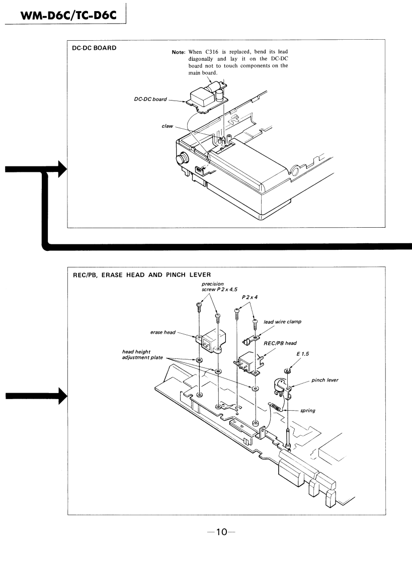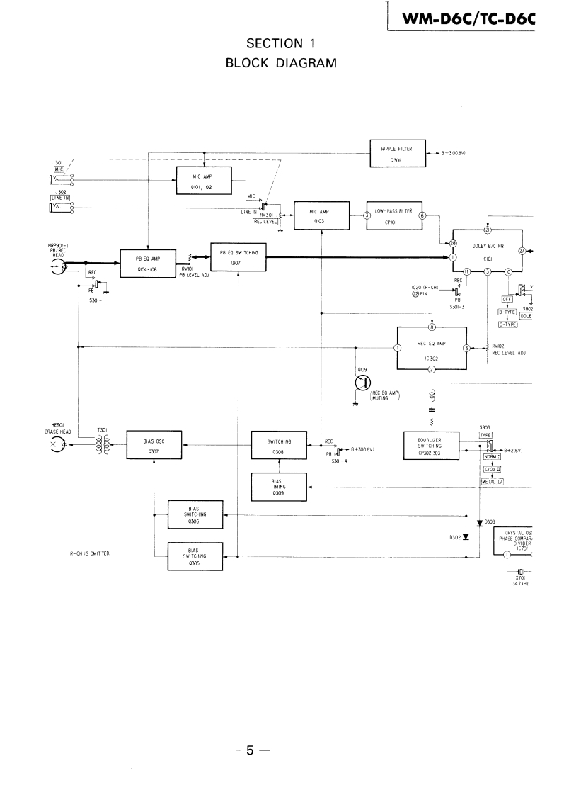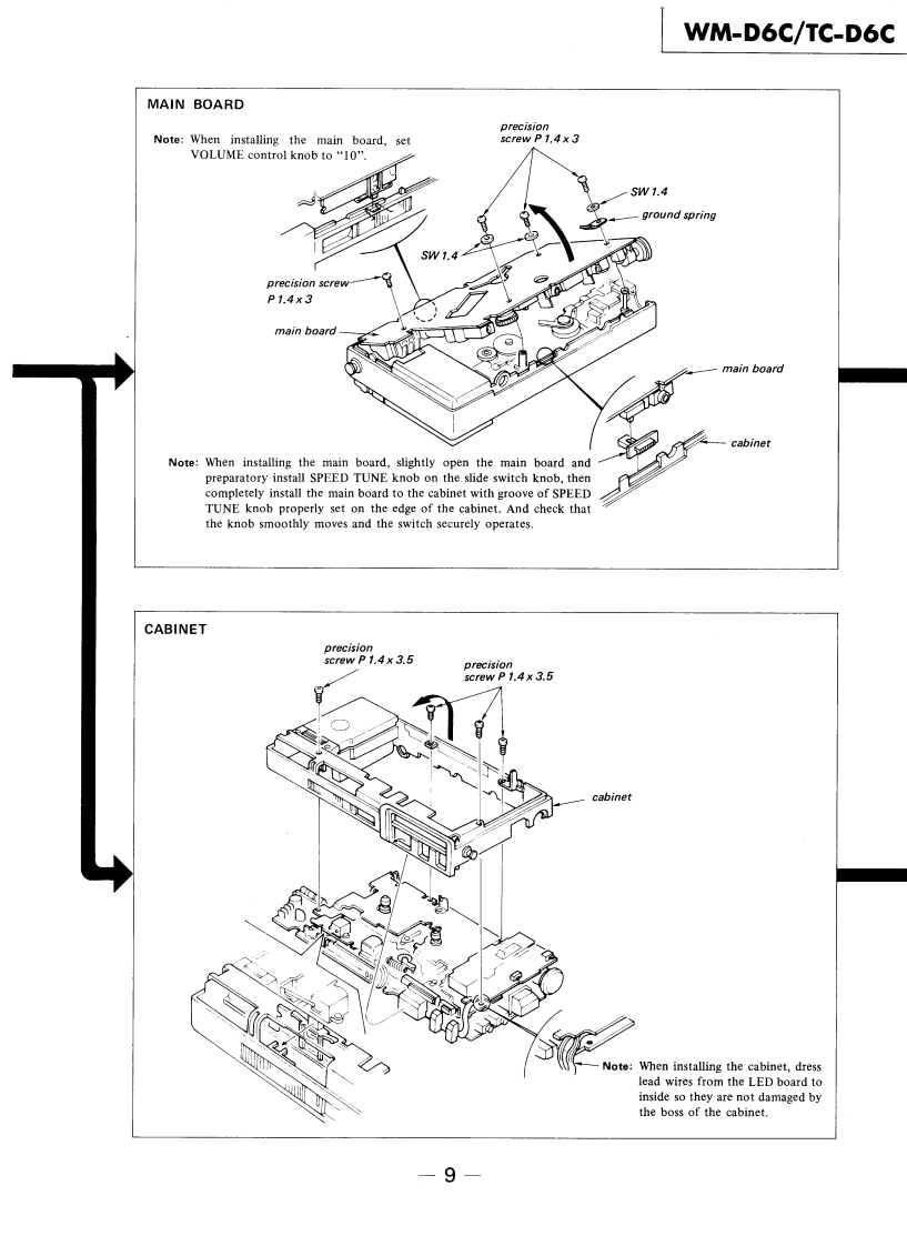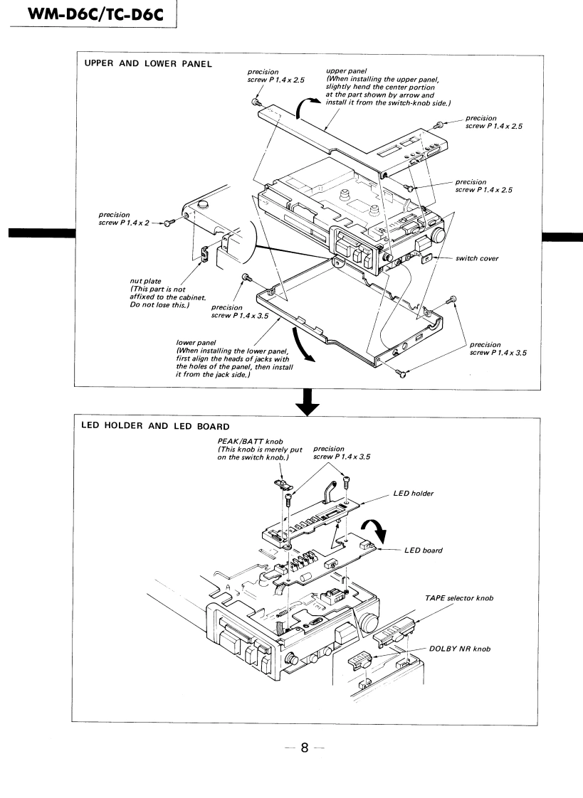 WM-D6C/TC-D6CSERVICE MANUALRefer to MDR-40L Service Manual issued previouslyfor information of headphones supplied withWM-D6C.Ver1.12001.06Refer to ECM-939LT Service Manual issued previous-ly for information of headphones supplied withTC-D6C.WM-D6C:US ModelCanadian ModelAEP ModelUK ModelE Model'Dolby'and the double-D symbol are the trade marks ofDolby Laboratories Licensing Corporation.Noise reductionTC-D6C:system manufactured under license from Dolby LaboratoriesLicensing Corporation.US ModelSPECIFICATIONSRecording System:4-track,2-channel stereoWow and Flutter:±0.14%{DIN)Tape Transport Mechanism TypeMT-D6C-200.04%WRMS (NAB)Tape Speed Deviation::0.3%(speed tuning OFF)Outputs:LINE OUT (stereo minijack)x 1Speed Tuneroutput level 0.25 V(-10 dB)(less thanVariations:Approx.±4%4.7 kilohms)Headphones (stereo minijack)x 1Frequency Response:DOLBY NR OFFload impedance 8-300 ohms.With TYPE IV cassette (Sony METALLIC)40-15.000Hz±3dBPower Output:Headphones30mW +30mW (at 10%harmonic distortion)·Nith TYPEⅡcassette(Sony UCX)40-15,000Hz±3dBload impedance 32 ohms.With TYPE I cassette (Sony BHF or HFX)Battery Life:See page 2.40-15.000Hz±3dBPower Requirements:6 V dc,four batteries,IEC designation R6S/N (NAB,at peak(size AA)level):DOLBY NR CBP-23 battery pack (optionallTYPE IV cassette (Sony METALLIC)71 dBExternal power input jackTYPE II cassette (Sony UCX)71 dBIrequired power 6 V dc)accepts Sony acTYPE I cassette (Sony BHF or HFX)67 dBpower adaptor (optional)listed on page 2DOLBY NR Bfor use on appropriate ac power,or SonyTYPE IV cassette (Sony METALLIC)65dBDCC-127A car battery cord (optional)forTYPE II cassette (Sony UCX)65 dBuse on 12V car batteryTYPE I cassette (Sony BHF or HFX)61 dBDimensions:181x40×95mmw/h/d)DOLBY NR OFF71/4×13×34 inches)TYPE IV cassette (Sony METALLIC)58dBincluding projecting partsTYPE II cassette (Sony UCX)58dBWeight:Approx.640g (1 Ib 7 oz)including batteriesTYPE I cassette (Sony BHF or HFX)54dBTotal HarmonicDistorsion:0.9%with Sony METALLIC0dB=0.775VInputs:MIC (PLUG IN POWER)stereo minijack)×10.25mV(-70 dB)with low impedancemicrophoneLINE IN (stereo minijack)x 1STEREO CASSETTE-CORDER77.5mV (-20 dB)(47 kilohms)SONY9-951-385-12Sony Corporation2001F0500-1Personal Audio CompanyTc©2001.6Shinagawa Tec Service Manual Production Group