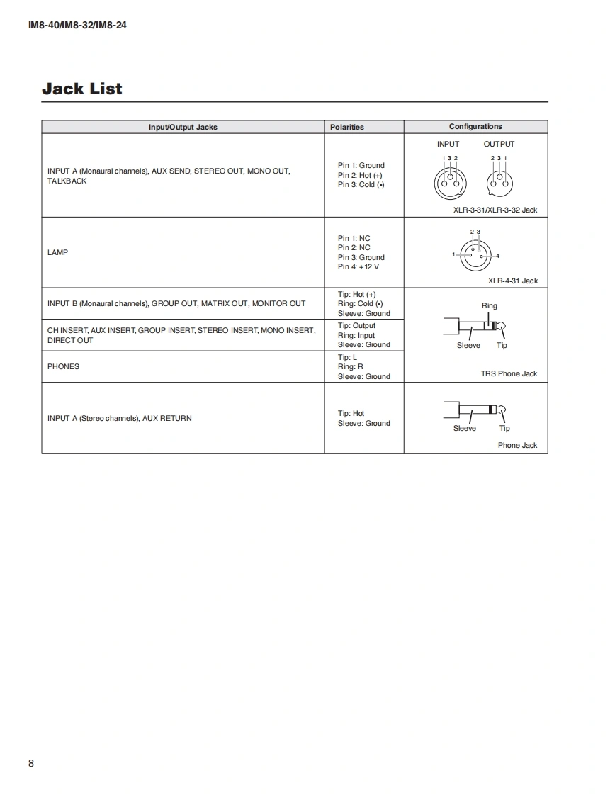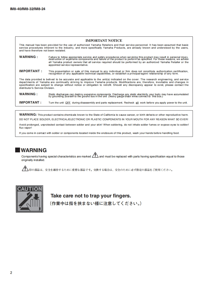 MIXING CONSOLEIM8-40/IM8-32/IM8-24SERVICE MANUALOPTION(才プョ)·POWER SUPPLYPW8POWER SUPPLY LINK CABLEPSL10101M8-40Please refer to the page 3 and page 4 for products photos本体写真体、本文P3上P4苍参照〈龙ěL。■CONTENTS(目次)SPECIFICATIONS(瓮合仕樣).5PANEL LAYOUT(I礻儿亻T卜)9DIMENSIONAL DIAGRAM(寸法☒)..16CIRCUIT BOARD LAYOUT(三y卜L亻T7卜)18DISASSEMBLY PROCEDURE(分解手順).........20LSI PIN DESCRIPTION(LSI端子機能表)…45IC BLOCK DIAGRAM(ICブ口y夕☒)..46CIRCUIT BOARDS(>-卜基板☒).47INSPECTIONS(検查)...103/114PARTS LISTBLOCK DIAGRAM(ブ口y夕ダ亻予5ラ厶)OVERALL CONNECTOR CIRCUIT DIAGRAM(総口礻夕夕接続回路☒)CIRCUIT DIAGRAM(回路☒)PA011911YAMAHA1M8-24200807才-ブブ与亻入PW8:HAMAMATSU,JAPAN1M8-32:200807才-ブブ与入Copyright (c)Yamaha Corporation.All rights reserved.PDF KMs '08.071M8-40:200807才-ブブラ亻入