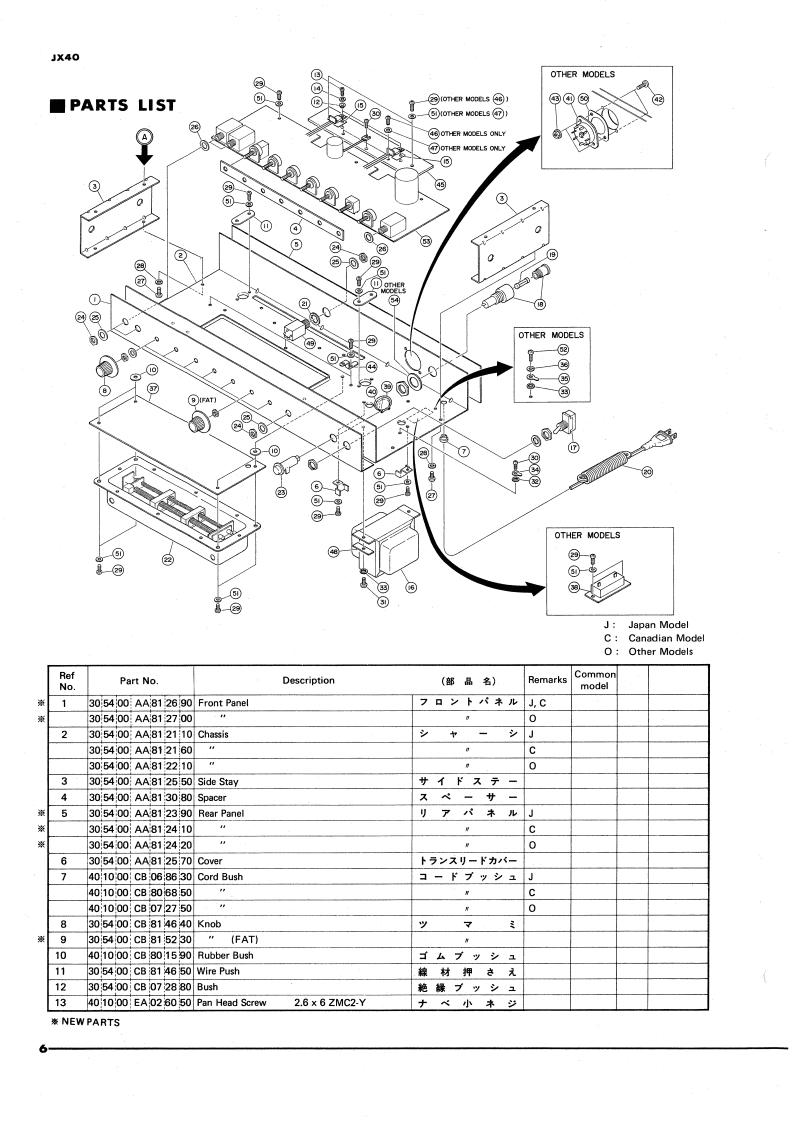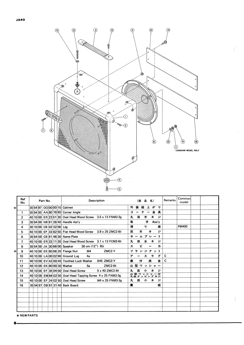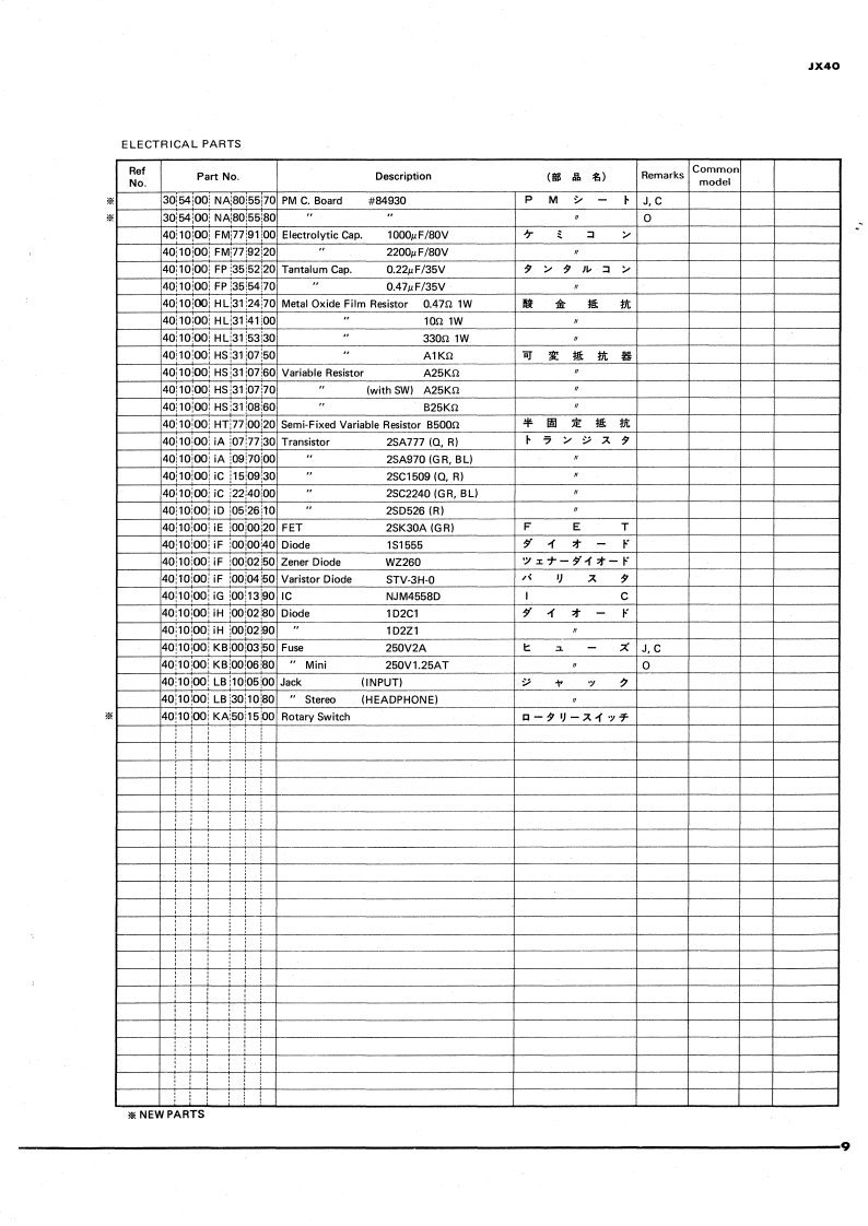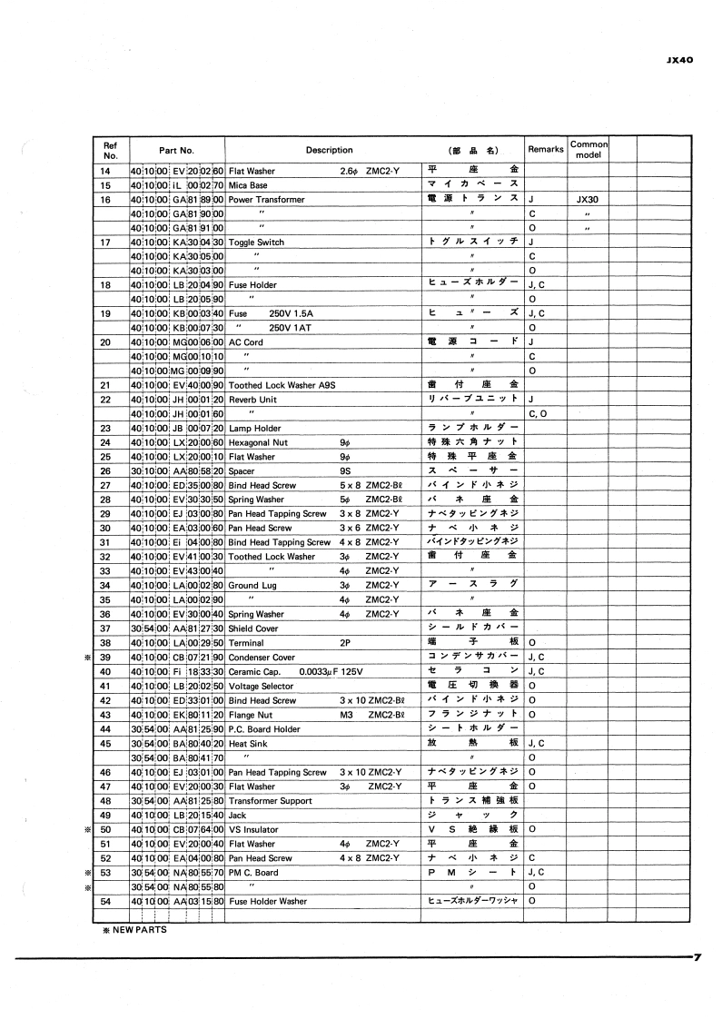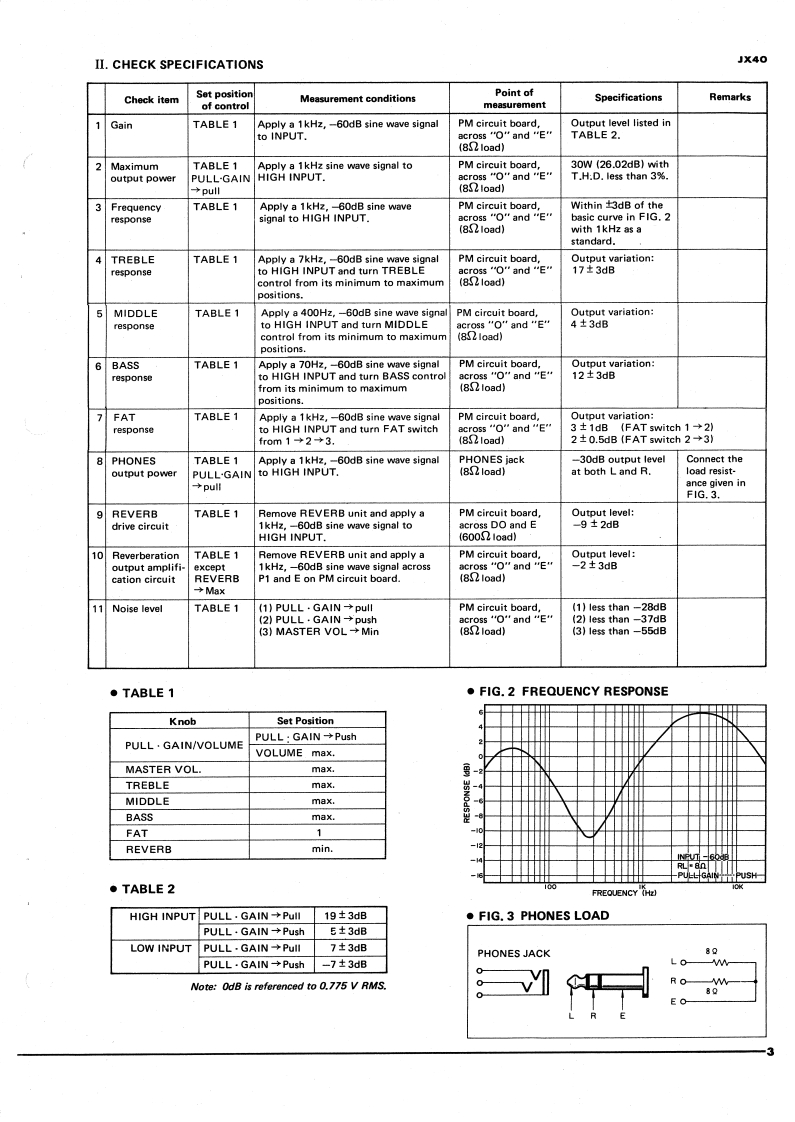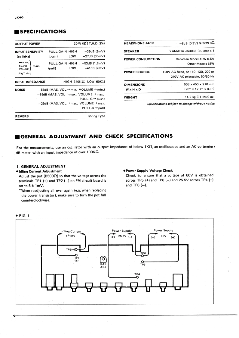 SERVICE MANUAL■FRONT PANEL@JX40@PHONESPOWER■CONTENTSSPECIFICATIONS......................2PRINTED CIRCUIT BOARD..··.,·4GENERAL ADJUSTMENT AND CHECK.·,··2SCHEMATIC DIAGRAM..................5BLOCK DIAGRAM4PARTS LIST ..........................6SINCE 1887YAMAHA006420NIPPON GAKKI CO,LTD.HAMAMATSU,JAPAN79 Nov.1.5K Printed in Japan