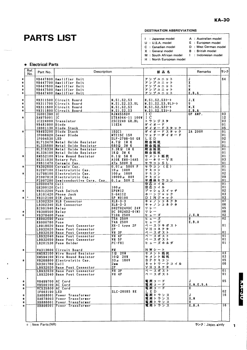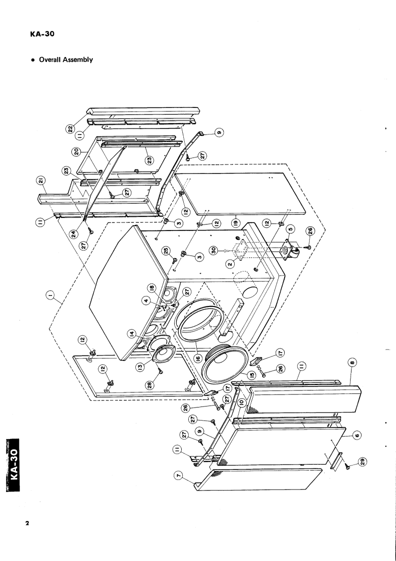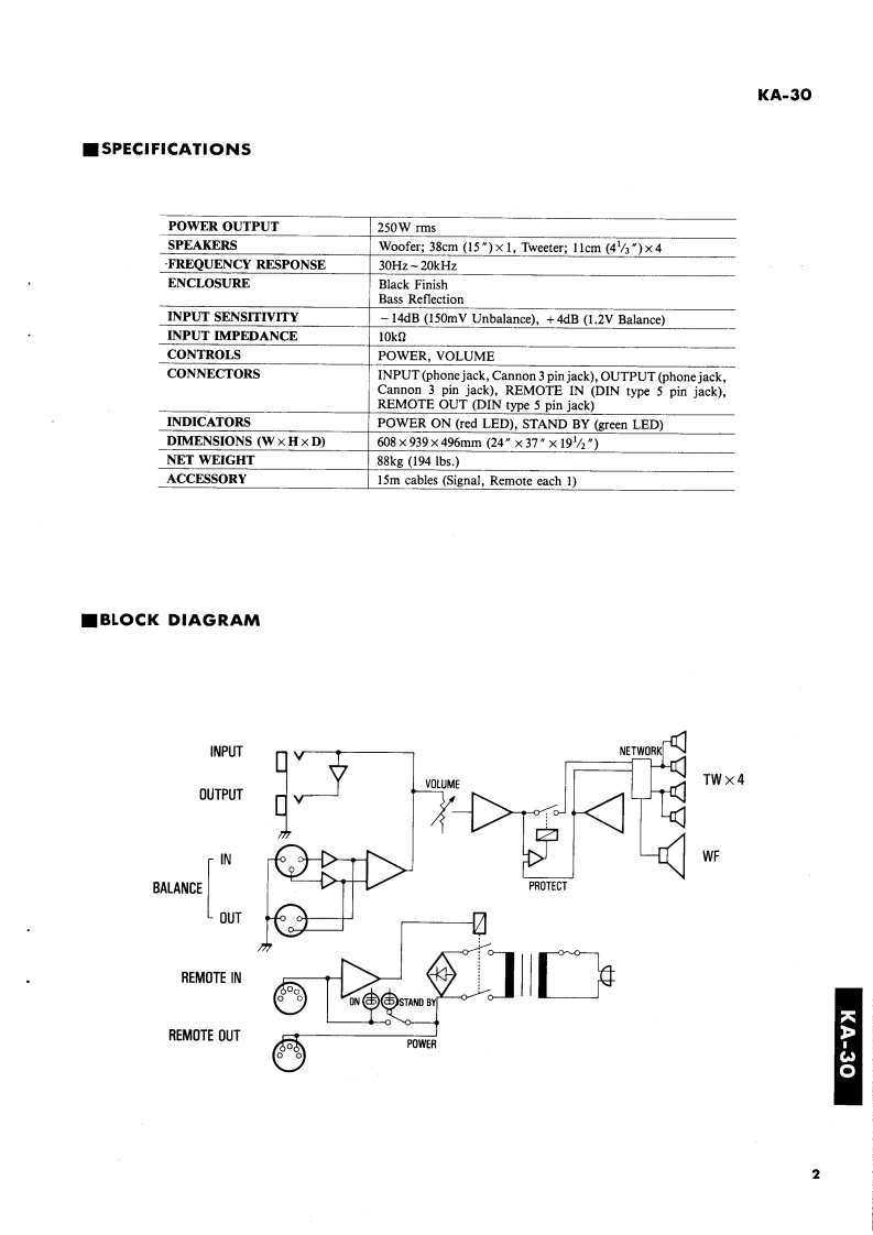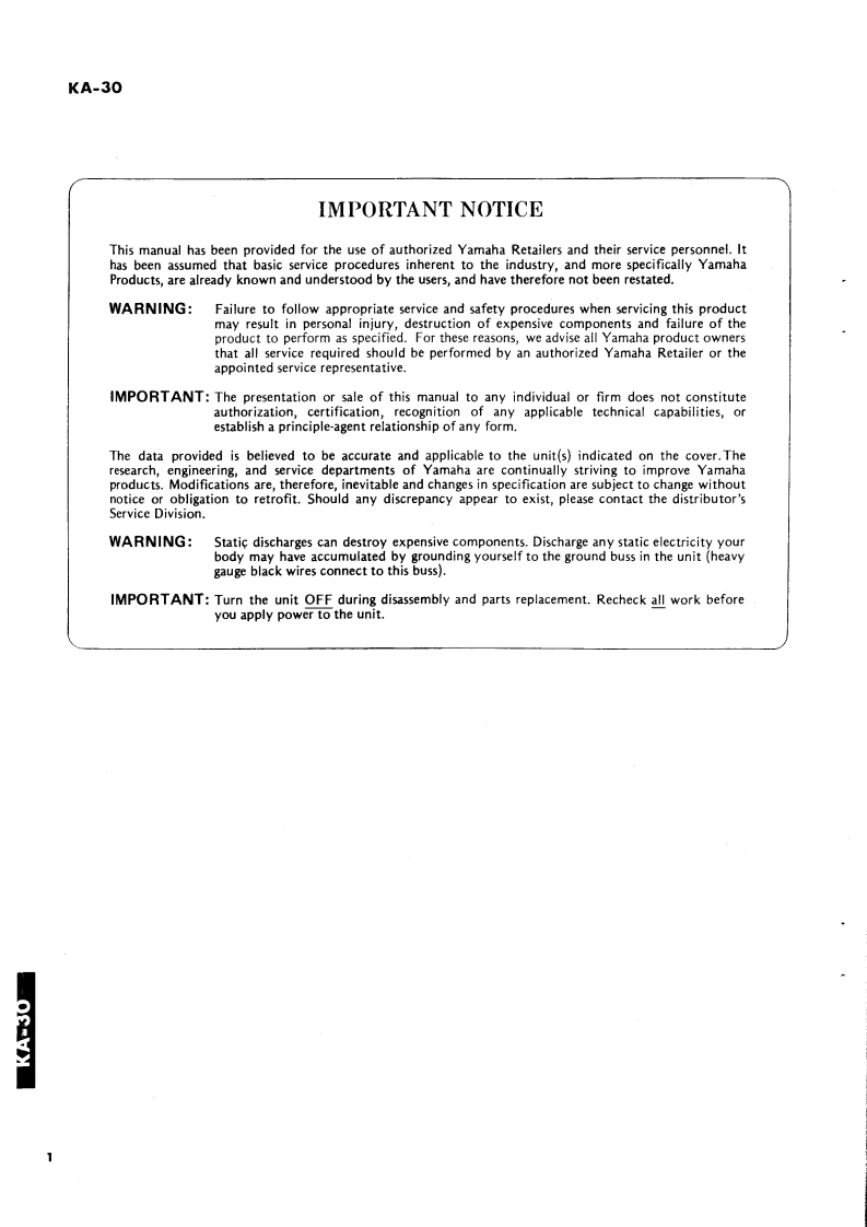 1A30KEYBOARD AMPLIFIERKA-30SERVICE MANUALYAMAHA■CONTENTSSPECIFICATIONS,··,,···········BLOCK DIAGRAM,····…PANEL LAYOUT.,,,······3OVERALL CIRCUIT DIAGRAM········4CIRCUIT BOARDS··············PARTS LISTKA-30SINCE 1887001279YAMAHANIPPON GAKKI CO.,LTD.HAMAMATSU JAPAN1.95K-231 Printed in Japan 86.9