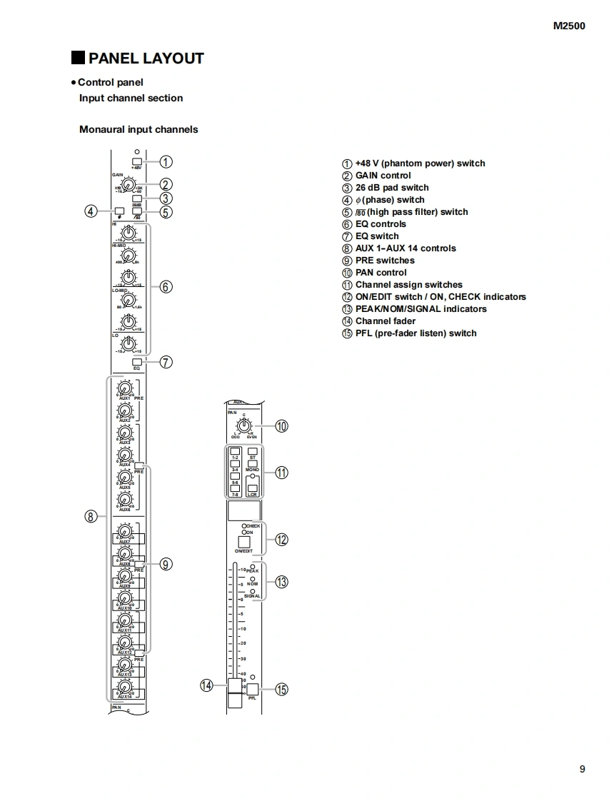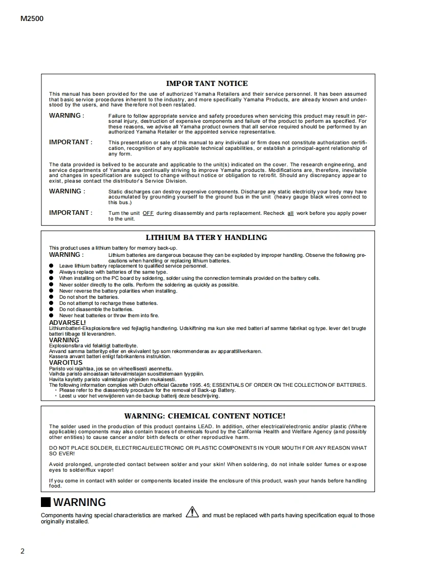 MIXING CONSOLE己马口▣-24/32/4oC/4日口/56口SERVICE MANUALM2500-56C■CONTENTSSPECIFICATIONS3/5DIMENSIONS…8PANEL LAYOUT9CIRCUIT BOARD LAYOUT.16DISASSEMBLY PROCEDURE18LSI PIN DESCRIPTION26IC BLOCK DIAGRAM30CIRCUIT BOARDS33INSPECTIONS.61/69TEST PROGRAM76/78ERROR MESSAGES80/81MIDI IMPLEMENTATION CHART..................................82CIRCUIT DIAGRAMSPARTS LISTPA0114841/2YAMAHAM2500-2420000220-850000M2500-48C20000220-1300000M2500-3220000220.1000000M2500-56C20000220-1450000HAMAMATSU,JAPANM2500-40C20000220-1150000PW3000MA20000220-1000001.50K-5972Printed in Japan 2000.02