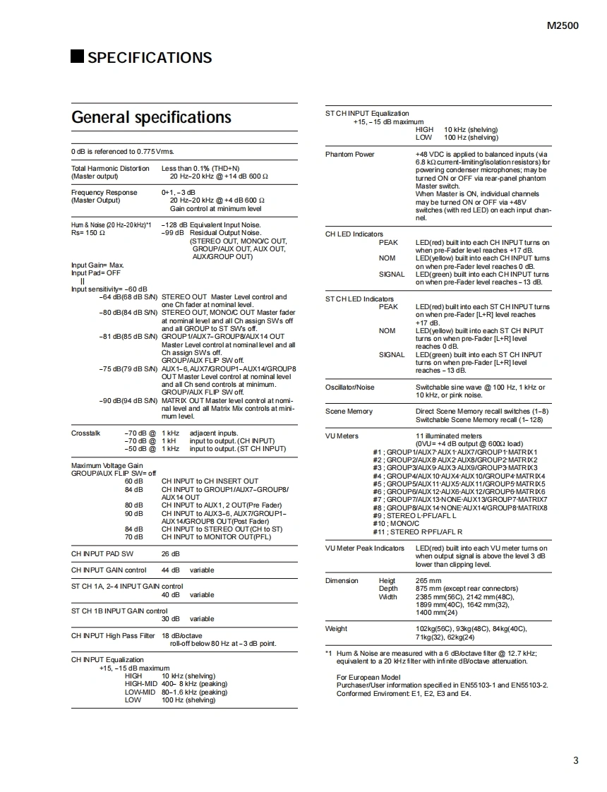 MIXING CONSOLE己马口▣-24/32/4oC/4日口/56口SERVICE MANUALM2500-56C■CONTENTSSPECIFICATIONS3/5DIMENSIONS…8PANEL LAYOUT9CIRCUIT BOARD LAYOUT.16DISASSEMBLY PROCEDURE18LSI PIN DESCRIPTION26IC BLOCK DIAGRAM30CIRCUIT BOARDS33INSPECTIONS.61/69TEST PROGRAM76/78ERROR MESSAGES80/81MIDI IMPLEMENTATION CHART..................................82CIRCUIT DIAGRAMSPARTS LISTPA0114841/2YAMAHAM2500-2420000220-850000M2500-48C20000220-1300000M2500-3220000220.1000000M2500-56C20000220-1450000HAMAMATSU,JAPANM2500-40C20000220-1150000PW3000MA20000220-1000001.50K-5972Printed in Japan 2000.02