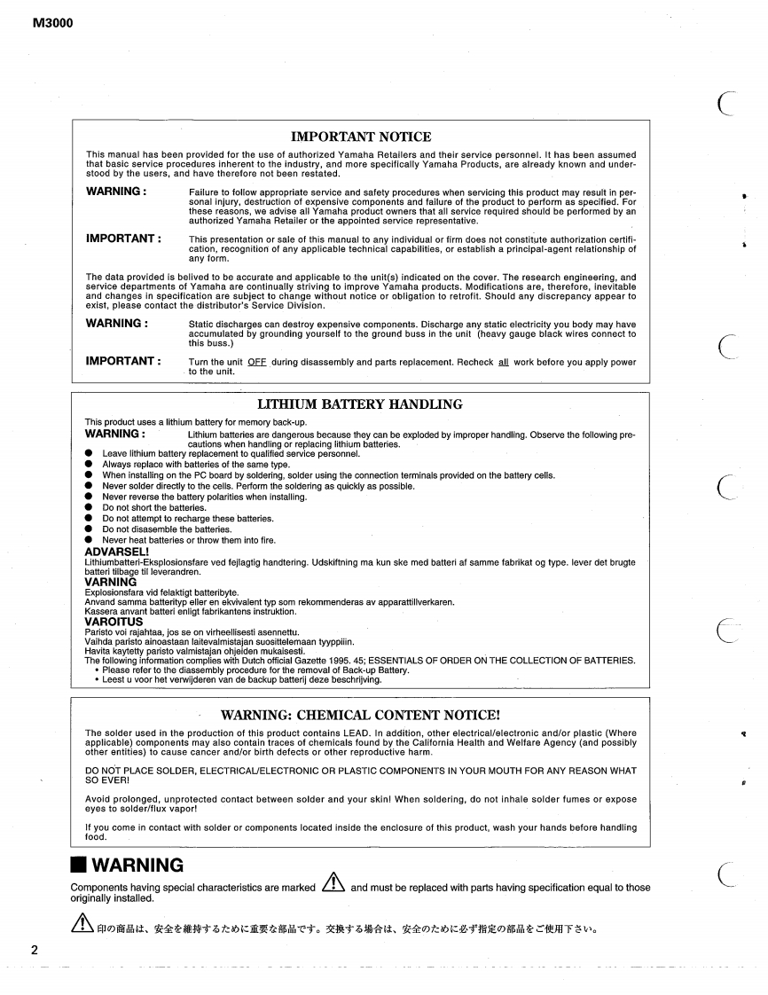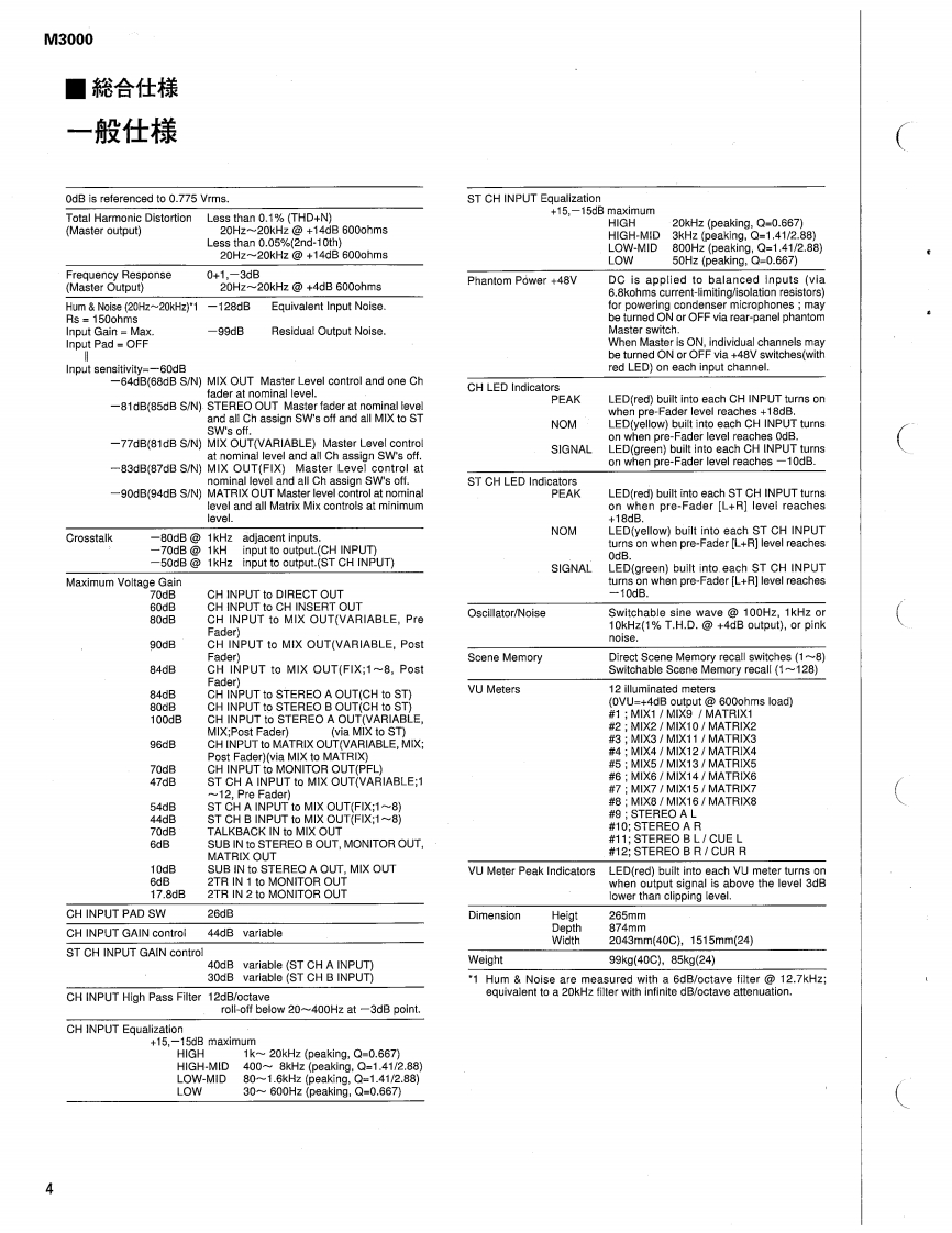 MIXING CONSOLE/POWER SUPPLY八三▣▣▣-24/4▣G与V三口口口ASERVICE MANUAL"4宁:::"■。1"年M3000-40C■CONTENTS(目次)SPECIFICATIONS(総合仕樣)3/4DIMENSIONS(寸法☒)6PANEL LAYOUT(IR礻儿T卜)6CONNECTOR CIRCUIT DIAGRAM(岁茴路3BLOCK LEVEL DIAGRAM(ブ口以夕&山八儿ダ亻予分与弘)16CIRCUIT BOARD LAYOUT(Z二y亻T卜)17DISASSEMBLY PROCEDURE(分解手順)18LSI PIN DESCRIPTION(LSI端子機能表)24IC BLOCK DIAGRAM(ICブ口y2☒)…26CIRCUIT BOARDS(-卜基板☒)28INSPECTIONS(検查)60/68TEST PROGRAM(行Z卜a7与A)7779MIDI DATA FORMAT(MIDIデ-夕フ才-マy)81ERROR MESSAGES(工ラ-Xy七-)83MIDI IMPLEMENTATION CHART...83CIRCUIT DIAGRAMS(回路☒)…84PARTS LISTPAO11432YAMAHAM3000-2419981001-1450000M3000-40C19981001-1850000HAMAMATSU,JAPANPW3000M19981001-1000001.96K-8782 Printed in Japan '98.09