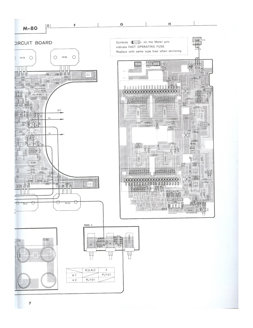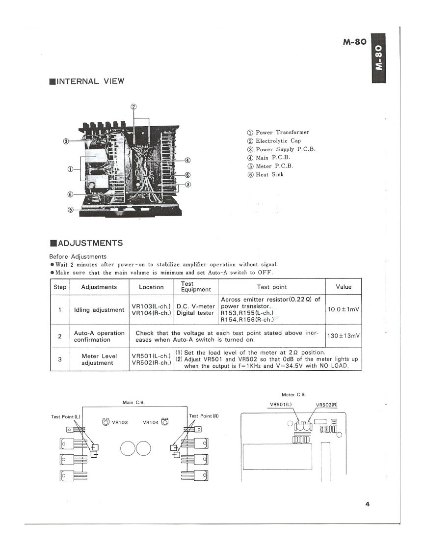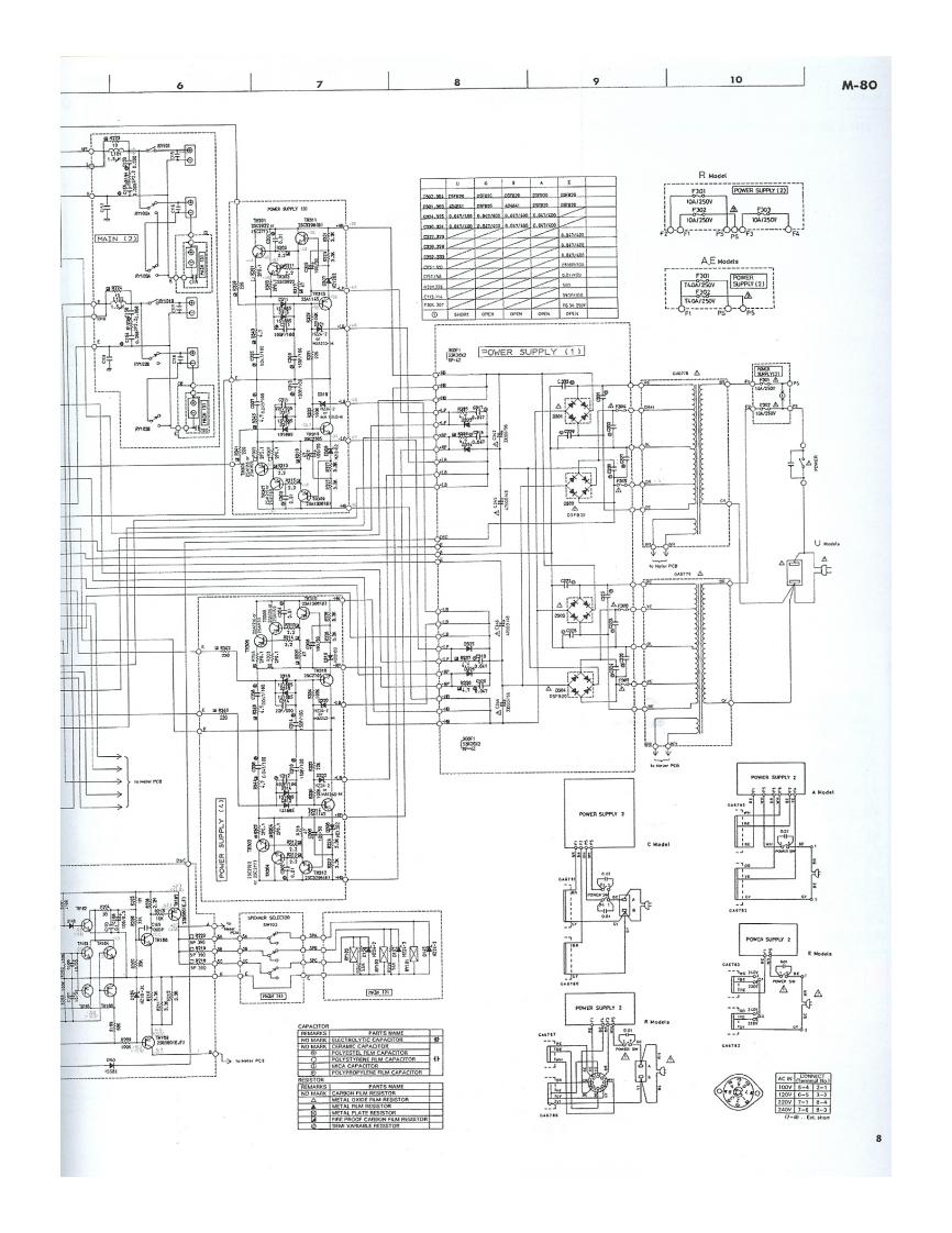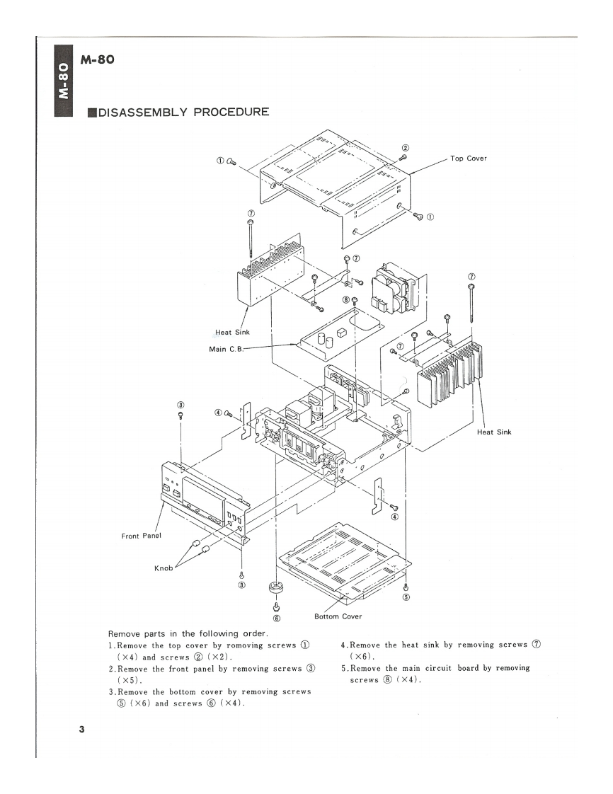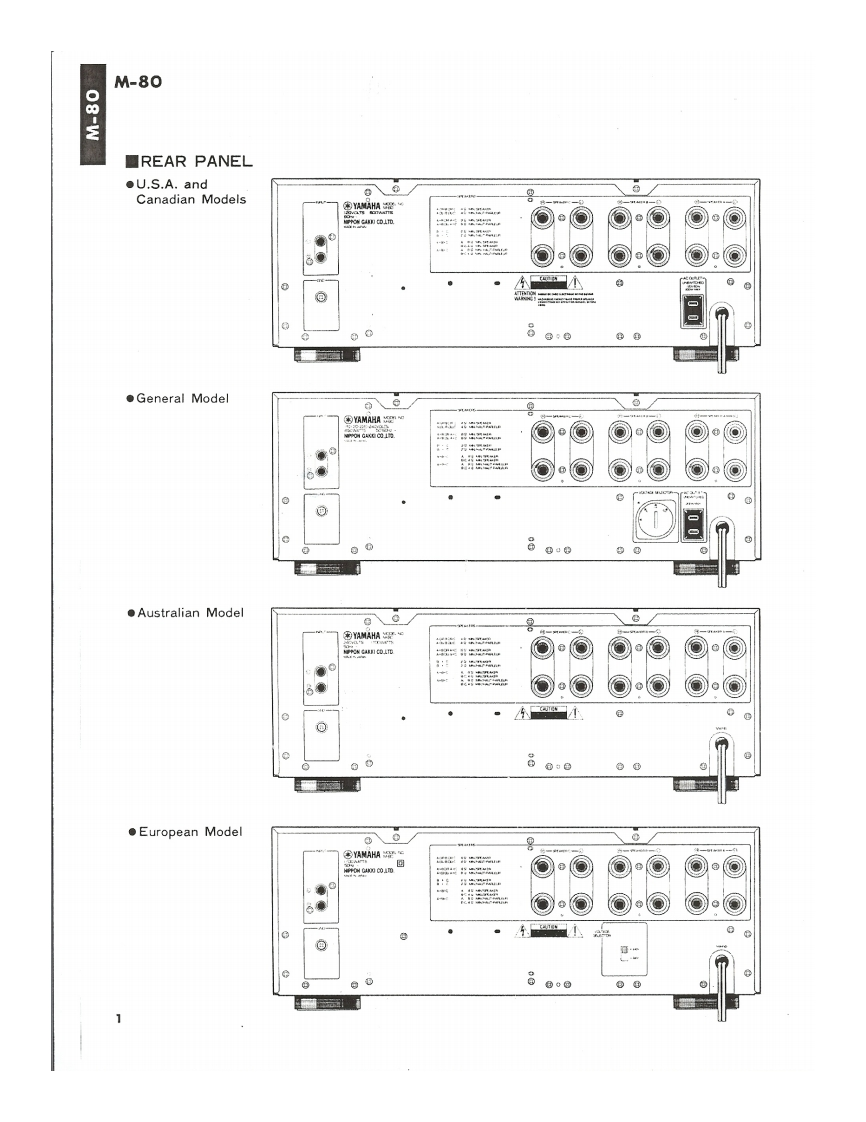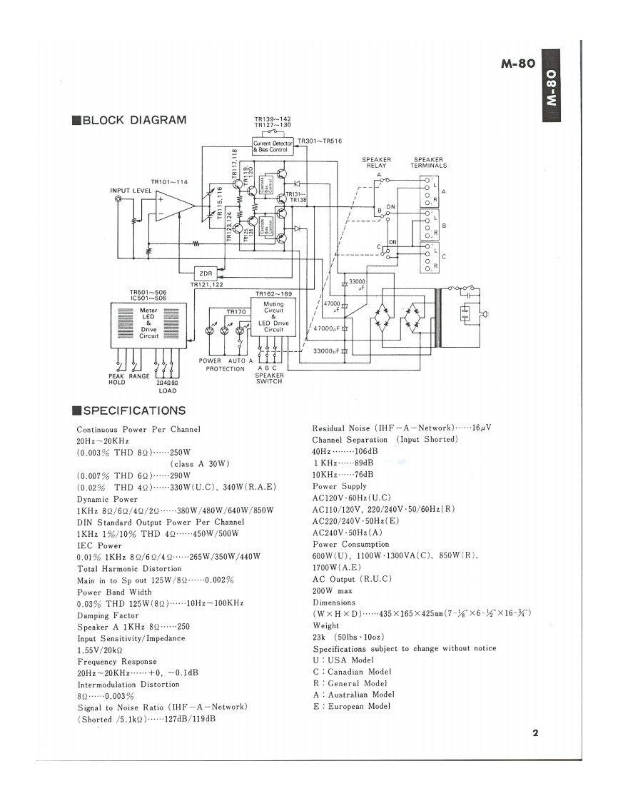 STEREO POWER AMPLIFIERM-80SERVICE MANUAL出况四000■TO SERVICE PERSONNEL1.Critical Components Information.Components having special characteristics are marked and must be replaced with parts havingspecifications equal to those originally installed.2.Leakage Current Measurement(For 120V Model Only).When service has been completed.it is imperative that you verify that all exposed conductive surfaces are properly insulated from supply circoitsMeter impedance should be equivalent to 1500 ohm shunted by 0.154F.Leakage current must not exceed 0.5mAEQUIPMENTBe sure to test for leakage withUNDER TEST8品E0a纸ETERAC plug in both polarities.WALLOUTLETINSULATING TABLE■CONTENTSREAR PANEL-..............................................P.C.BOARD一POWER SUPLY........…7BL0 CK DIAGRAM…2SCHEMATIC DIAGRAM -MAIN........................8SCHEMATIC DIAGRAM-METER...........9DISASSEMBLY PROCEDURE...............3VIRING DIAGRAM…9INTERNAL VIEW…4PARTS LIST-ELECTRIC....-....…10ADJUSTMENTS…4EXPLOADED VIEW-MECHANISM/CHASSIS....14P.C.BOARD一METER…5PARTS LIST-MECHANISM/CHASSIS............16P.C.BOARD-MAIN…6SINCE 1887YAMAHA004561NIPPON GAKKI CO.LTD.HAMAMATSU JAPAN2.6K-981 Printed in Japan 84.7