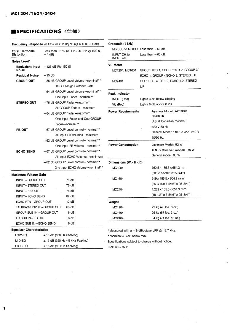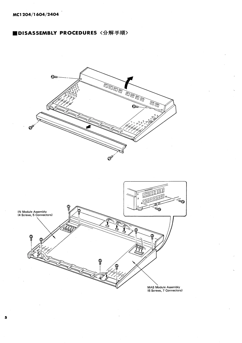 MIXINGCONSOLEMC1204/1604/2404SERVICE MANUALMC1604■CONTENTS〈目次>SPECIF1 CATIONS<仕模>....···....1/2PARTS LISTPANEL LAYOUT<:*儿才了方卜>.....3/4OVERALL ASSEMBLY15/16DISASSEMBLY PROCEDURES<分解手).··..6INPUT&MASTER MODULES.,..··.,·17/18BLOCK DIAGRAM<ブ口y夕夕才了夕ラ4).·.·6POWER SUPPLY UNIT....····19/20LEVEL DIAGRAM....·7METER ASSEMBLY..·······21DIMENSIONS<寸法☒>.········ELECTRICAL PARTS…...22/23CIRCUIT B0ARDS<之-下☒>.,..,,..,.8~14SCHEMATIC DIAGRAM回路☒>,,,,,,,,,,24SINCE 1887006591米YAMAHANIPPON GAKKI CO..LTD.HAMAMATSU.JAPAN2.4K-l53同他Printed in Japan84,4