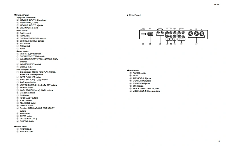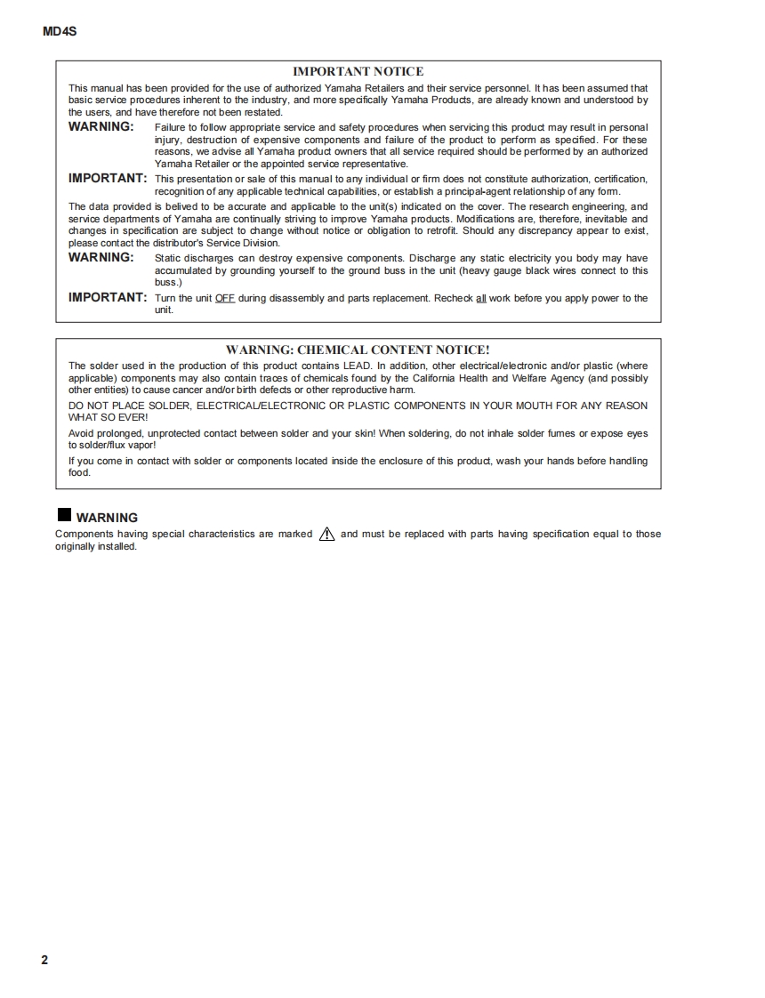 MULTITRACK MD RECORDERMD4SSERVICE MANUAL9如兰加是88■CONTENTSDISCS FOR MD4S…5…SPECIFICATIONS..................................................PANEL LAYOUT…7…DIMENSIONS…9…BLOCK DIAGRAM·9CIRCUIT BOARD LAYOUT…0…DISASSEMBLY PROCEDURE1LSI PIN DESCRIPTION…3…IC BLOCK DIAGRAM…15…CIRCUIT BOARDS.....18ERROR MESSAGES…23…INSPECTION SPECIFICATION…24…MIDI IMPLEMENTATION CHART....................................30…PARTS LISTOVERALL CIRCUIT DIAGRAMPA011433米YAMAHA19981210-79800HAMAMATSU.JAPAN1.93K-288 Printed in Japan 99.01