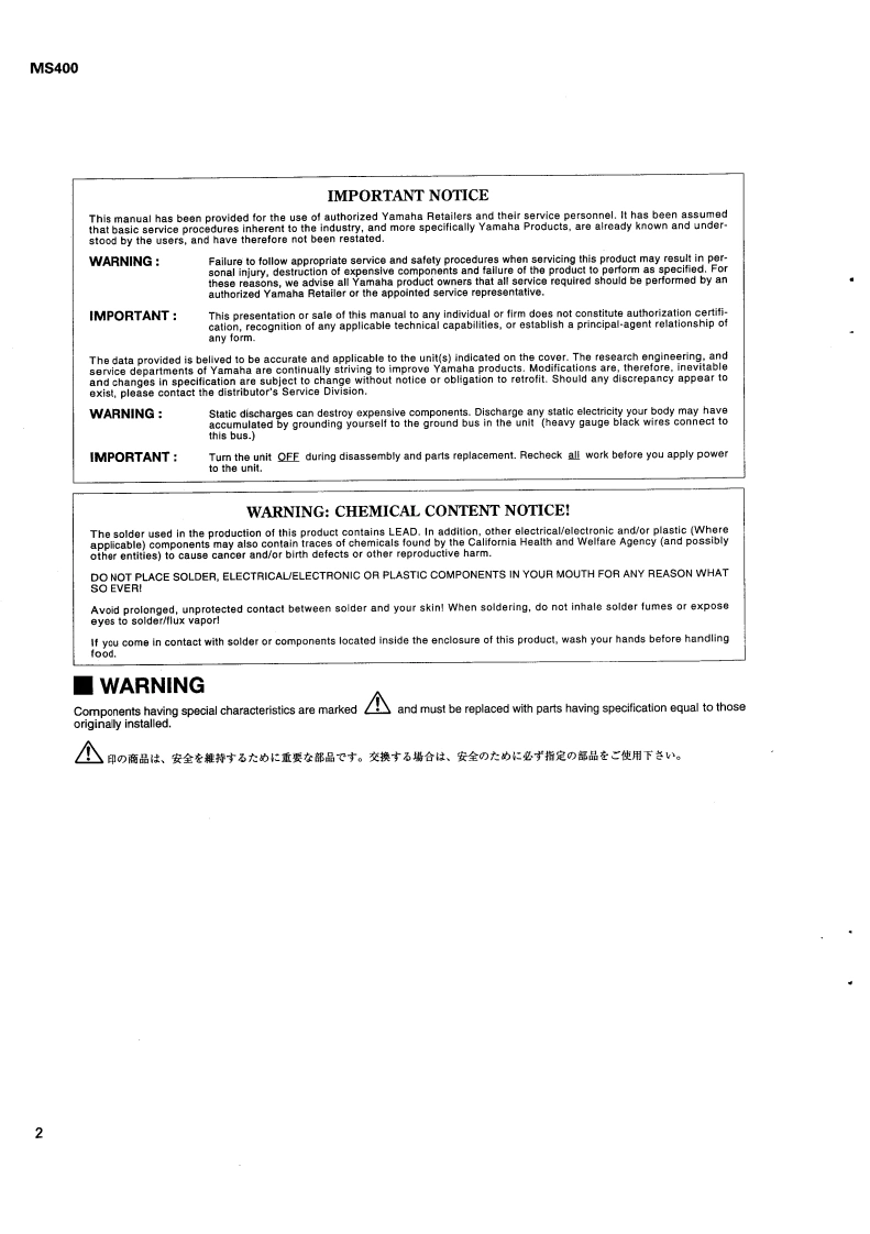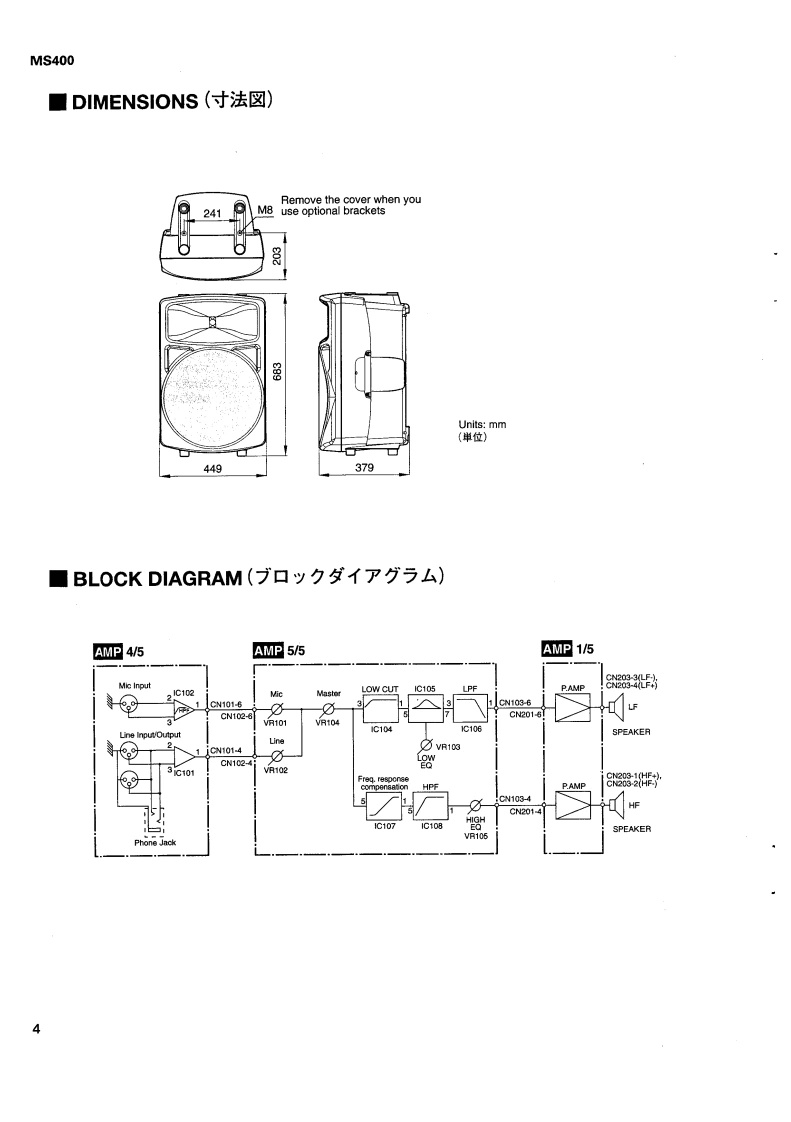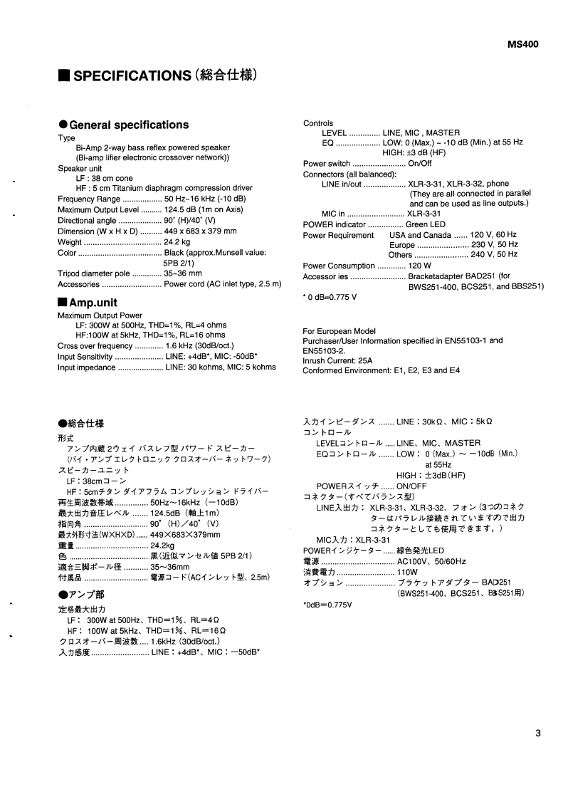 POWERED SPEAKERMS400SERVICE MANUAL■CONTENTS(目次)SPECIF1 CATIONS(轮合仕樣).DIMENSIONS(寸法☒)4BLOCK DIAGRAM(于口y安7分罗)义PANEL LAYOUT(/R礻儿了卜)..5CIRCUIT BOARD LAYOUT(ユ二y卜了ヴ卜)…6W川RNG(结線☒),n,7DISASSEMBLY PROCEDURE(分解手順)..8ICBL0 CK DIAGRAM(ICブ口y夕☒).10CIRCUIT BOARDS(之一卜基板☒)..11色8889*INSPECTIONS(梭查),16OVERALL CIRCUIT DIAGRAM(瓮回路☒)…19This documer is printed on chiorine free(ECF)paper with soy ink.PARTS LIST米YAMAHAPA011556HAMAMATS,JAPAN20001210-980001.415K-215 K Printed in Japaun 2000.12