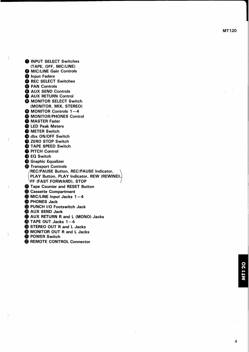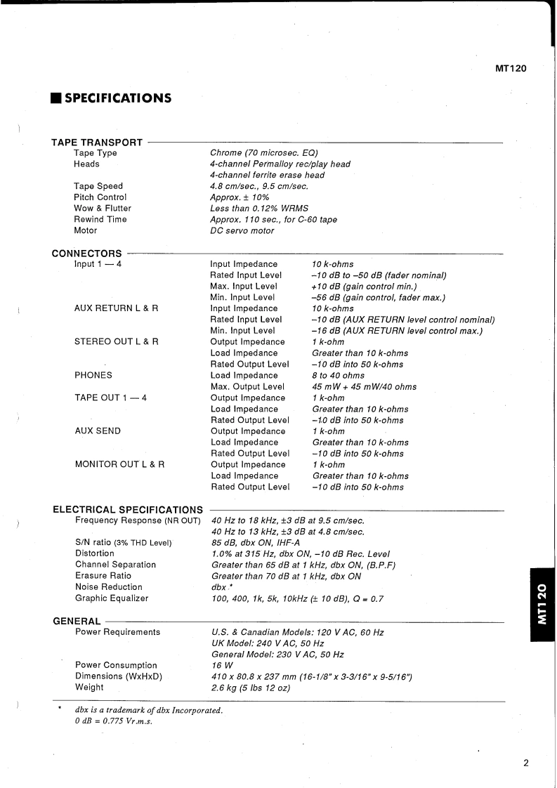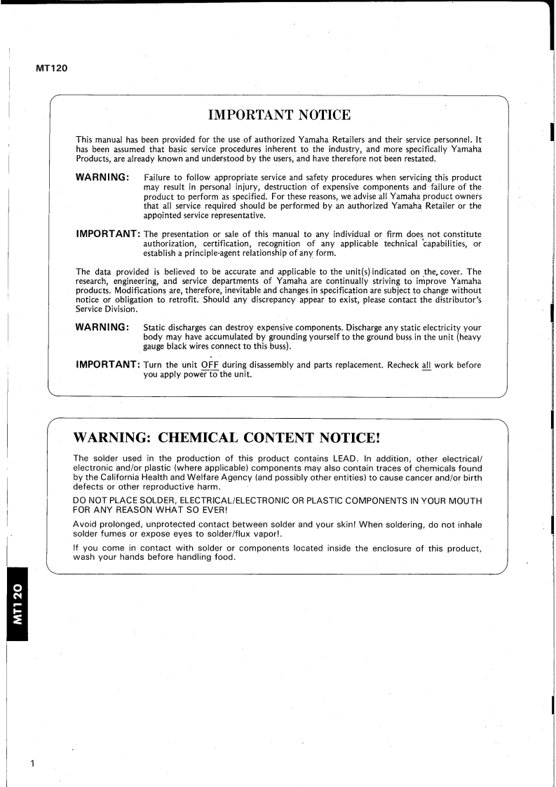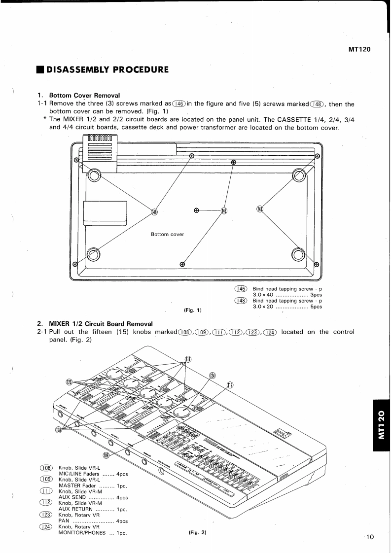 MULTITRACK CASSETTE RECORDERWIT1二DSERVICE MANUAL-A兰票人T1臣一-REMOTE CONTROLLERMULTITRACK CASSETTE RECORDER MT120RCM1■CONTENTSSPECIFICATIONS…2PANEL LAYOUT…CIRCUIT BOARD LAYOUT…35VIRING…......BLOCK DIAGRAM…8DISASSEMBLY PROCEDURE................10IC BLOCK DIAGRAM...…13CIRCUIT BOARDS…14REMOTE CONTROLLER RCM1.....21ADJUSTMENTS…22PARTS LISTLMo11088YAMAHA CORP.HAMAMATSU.JAPAN2.3K-073 Printed in Japan '91.09