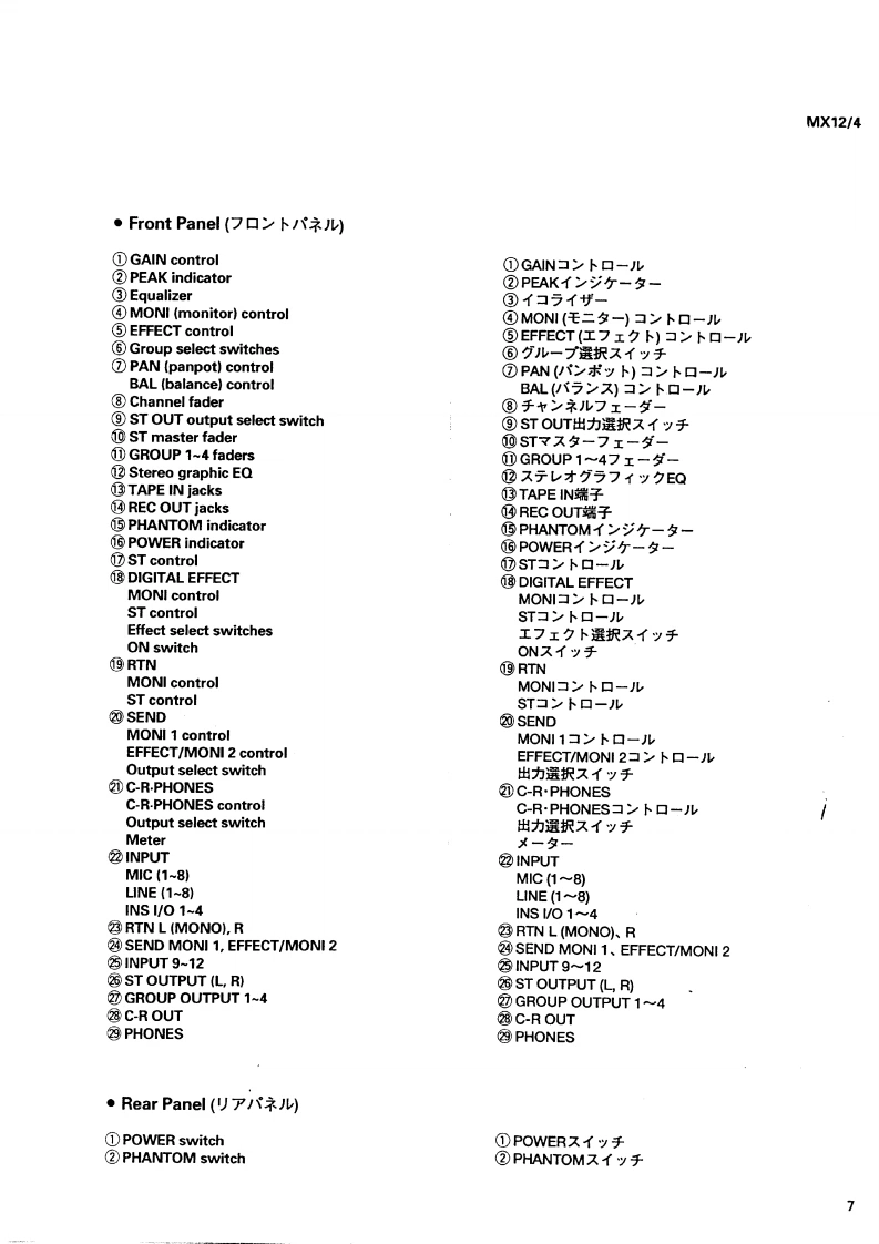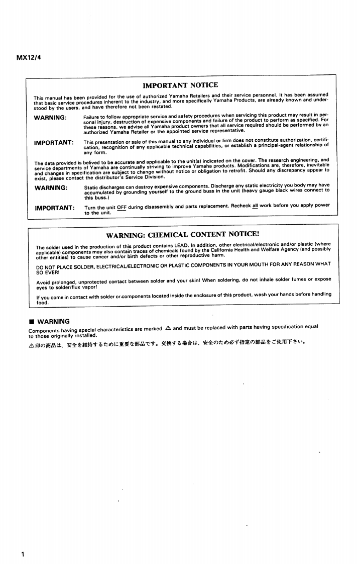 MIXING CONSOLE亿火星2/4SERVICE MANUALYAMAHAMx7214品33ra日t.■■CONTENTS(目次)SPECIFICATIONS(稔合仕横)…2/4PANEL LAYOUT(Iバ礻儿y亻予卜).6CIRCUIT BOARD LAYOUT(工二y卜L亻T7卜)8DIMENSIONS(寸法☒)..BLOCK DIAGRAM(ブ口y夕ダT月ラA).DISASSEMBLY PROCEDURE(分解手順)12LSI PIN DESCRIPTION(LSI端子機能表)IC BLOCK DIAGRAM(ICブ口y夕☒)16CIRCUIT BOARDS(一卜基板☒)…1INSPECTIONS(検查)26/31NIRING(基板結棕☒).36CIRCUIT DIAGRAM(回路☒)38~53PARTS LISTYAMAHA CORP.PA011349HAMAMATSU.JAPAN19961220-698002.3K-144 Printed in Japan '96.11