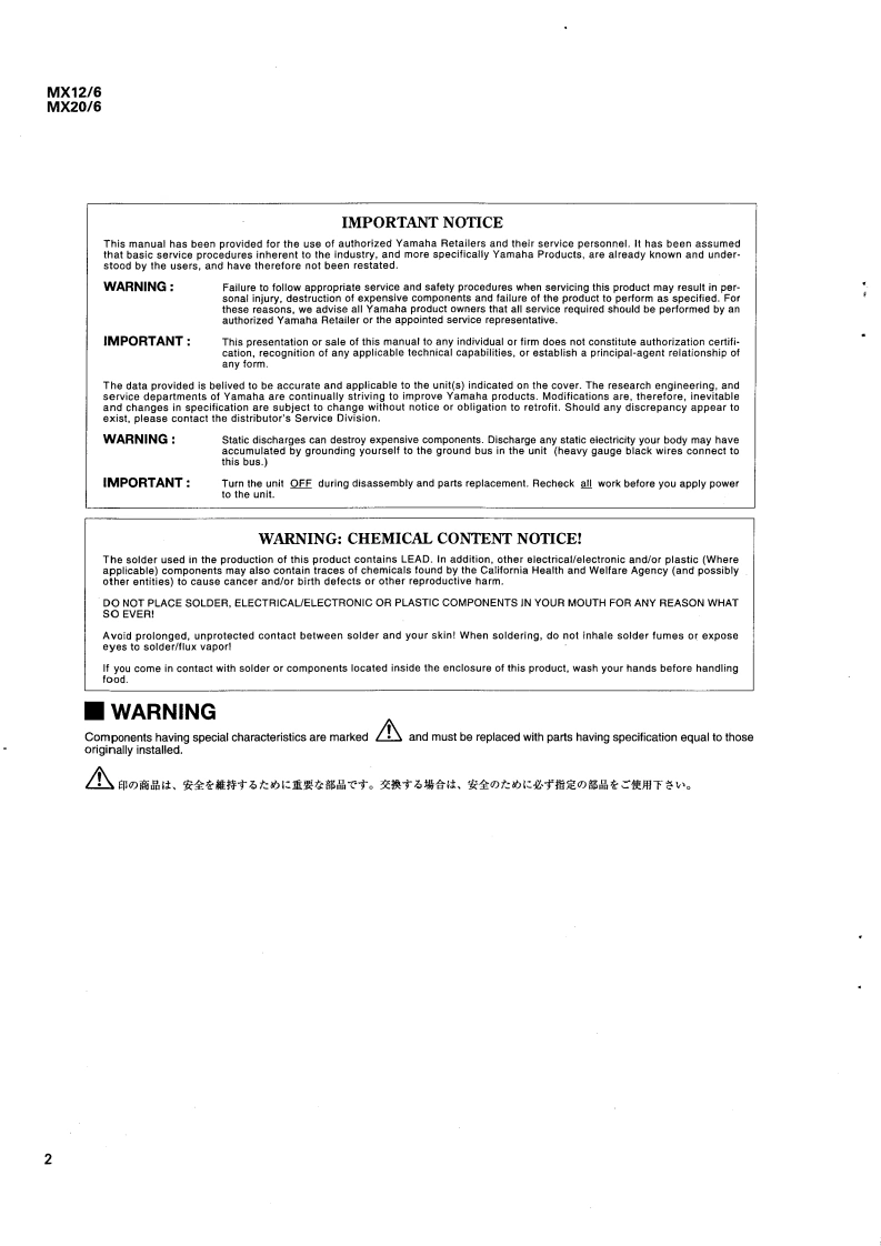 MIXING CONSOLE火冒差/6,差/6SERVICE MANUALMX12/6MX20/6■CONTENTS(目次)SPECIFICATIONS(然合仕樣)3DIMENSIONS(寸法☒)44116PANEL LAYOUT(R礻ルTヴ卜)7BLOCK LEVEL DIAGRAM..…10(口y夕&L入儿ダ不予月号4)WIRING(結線☒)..12CIRCUIT BOARD LAYOUT(1=y亻Tヴ卜).14DISASSEMBLY PROCEDURE(分解手順)…15LSI PIN DESCRIPTION(LSI端子機能表)…18IC BLOCK DIAGRAM(ICブ口y夕☒)20CIRCUIT BOARDS(之一卜基板☒)…21色808咒INSPECTIONS(検查)33CIRCUIT DIAGRAMS(回路☒)38This document is printed on chlorine tree(ECF)paper with soy ink.PARTS LISTYAMAHAPAD11541HAMAMATSU,JAPANMX12/620001210-698001.419K-7721 K Printed in Japan 200.12MX20/620001210-99800