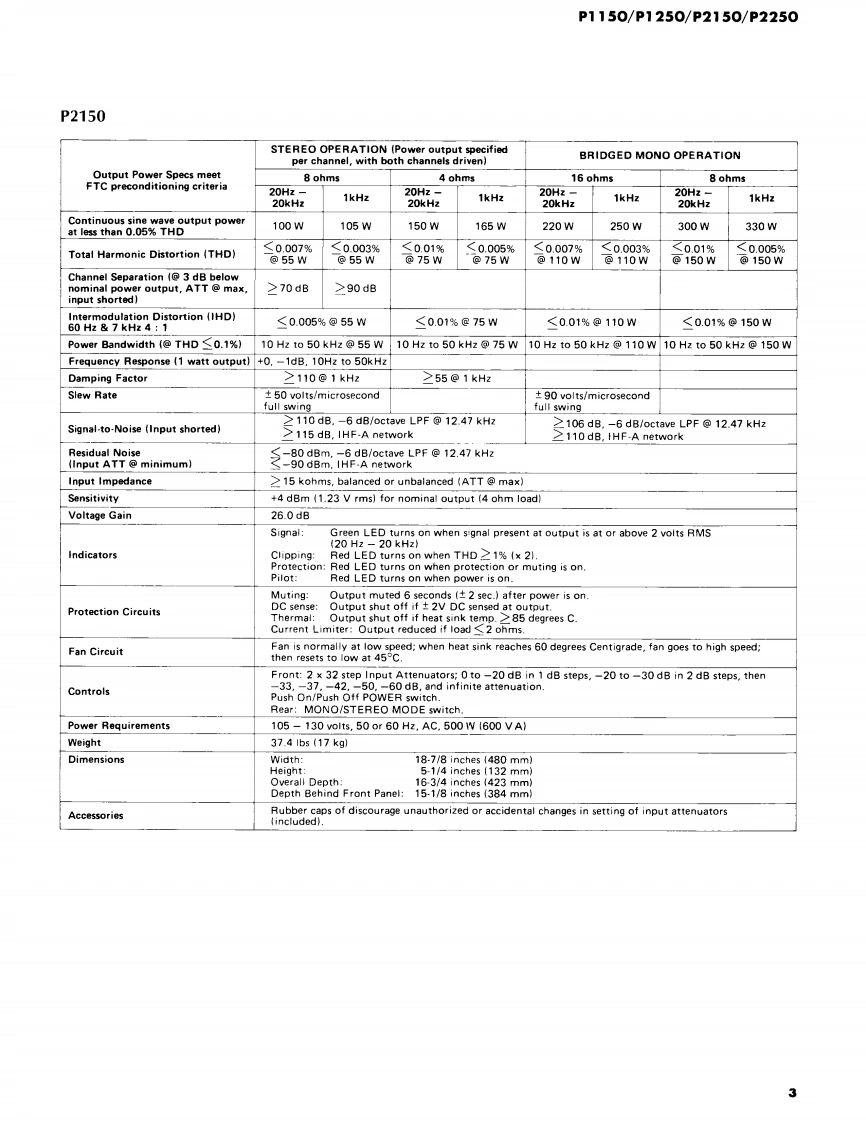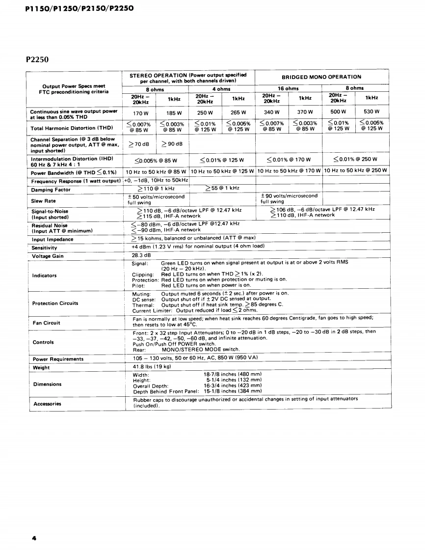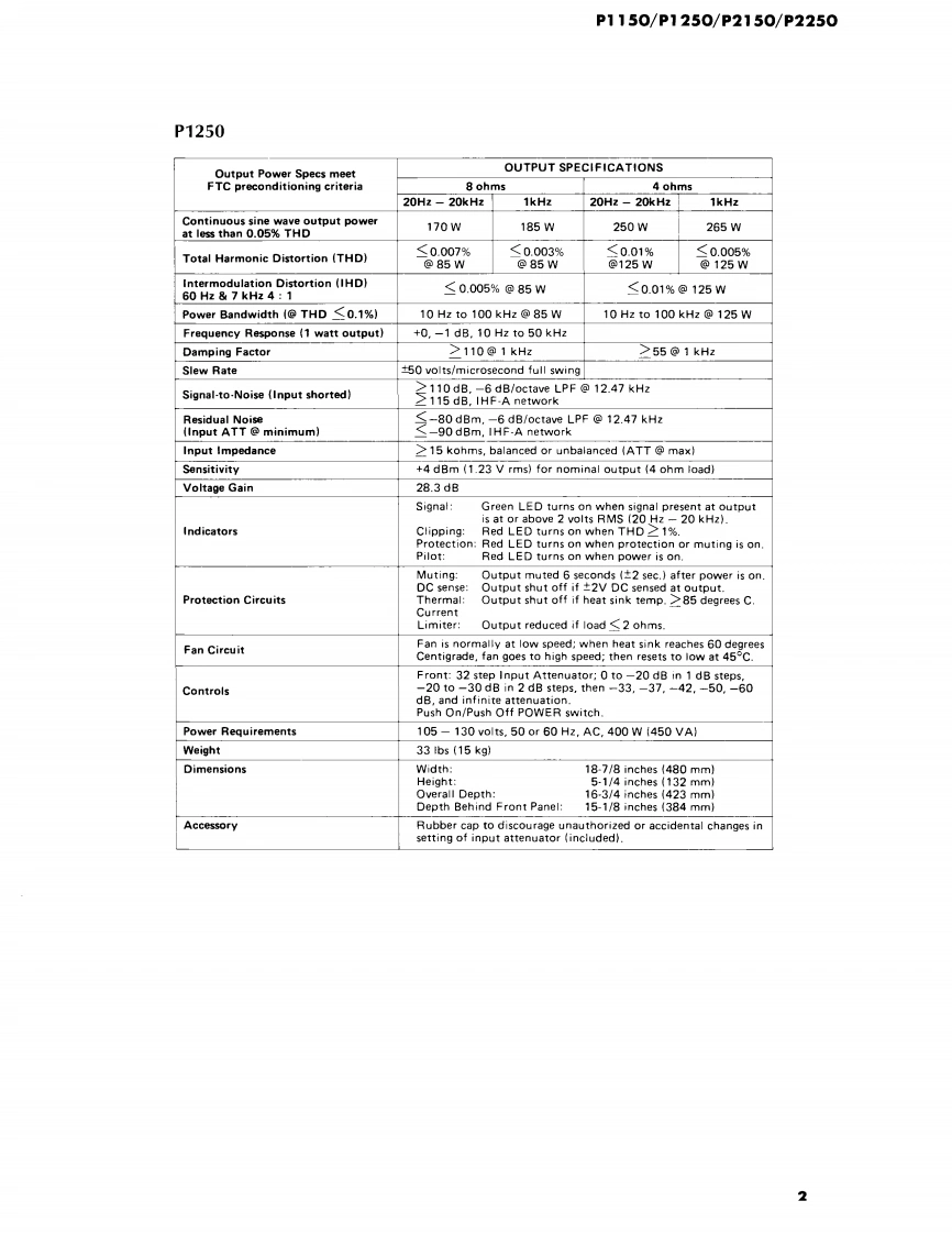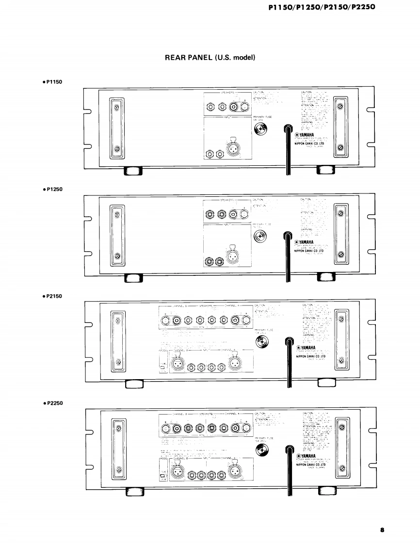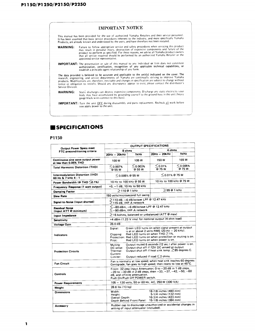 Scan Revision2007Dec15POWER AMPLIFIERSP1150/P1250/P2150/P2250SERVICE MANUALYAMAHA●P1250YAMAHA●P2250■CONTENTSIMPORTANT NOTICE....,.···.·.·1BLOCK DIAGRAM….11SPECIFICATIONS.....................1~4DIMENSIONS……11PERFORMANCE GRAPHS5/6CIRCUIT BOARDS12~16PANEL LAYOUT.,·.···.7/8EXPL0DEDV1EW...,..,....,....17DISASSEMBLY PROCEDURES............9/10PARTS LIST,.,,,,,,,···,·,····18~24CHECK AND ADJUSTMENT.....··.·.·.10SCHEMATIC DIAGRAM.············25SINCE 1887YAMAHA006650NIPPON GAKKI CO.LTD.HAMAMATSU.JAPAN1.85K-845 Printed in Japan '85.4