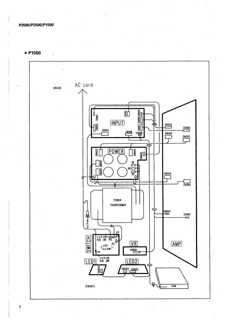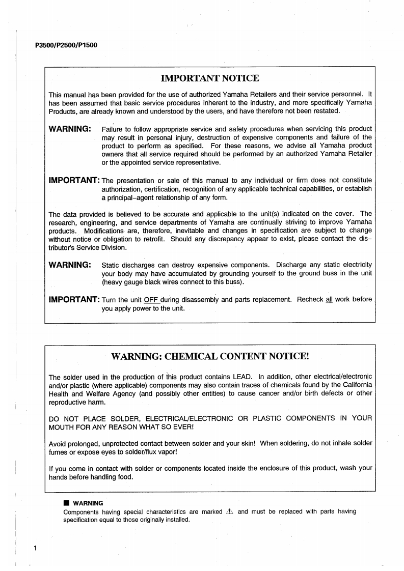 POWER AMPLIFIERS3588三吉O合SERVICE MANUALYAMAHASO·P3500YAMAHA房层5OO·P2500YAMAHA忌I与OO·P1500■CONTENTSSPECIFICATIONS2DIMENSIONS ...3PANEL LAYOUT…4BLOCK DIAGRAM...CIRCUIT BOARD LAYOUT &WIRING6DISASSEMBLY PROCEDURE ..8IC BLOCK DIAGRAM.3CIRCUIT BOARDS…14NSPECTONS24ADJUSTMENTS.............26CAUTION FOR SPEAKER CONNECTION.27PARTS LISTYAMAHA CORP.PA[011252HAMAMATSU.JAPAN2.1K-614e Printed in Japan 94.11