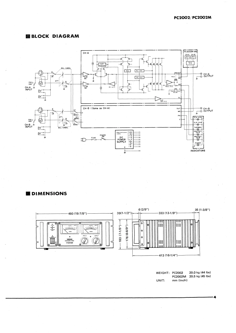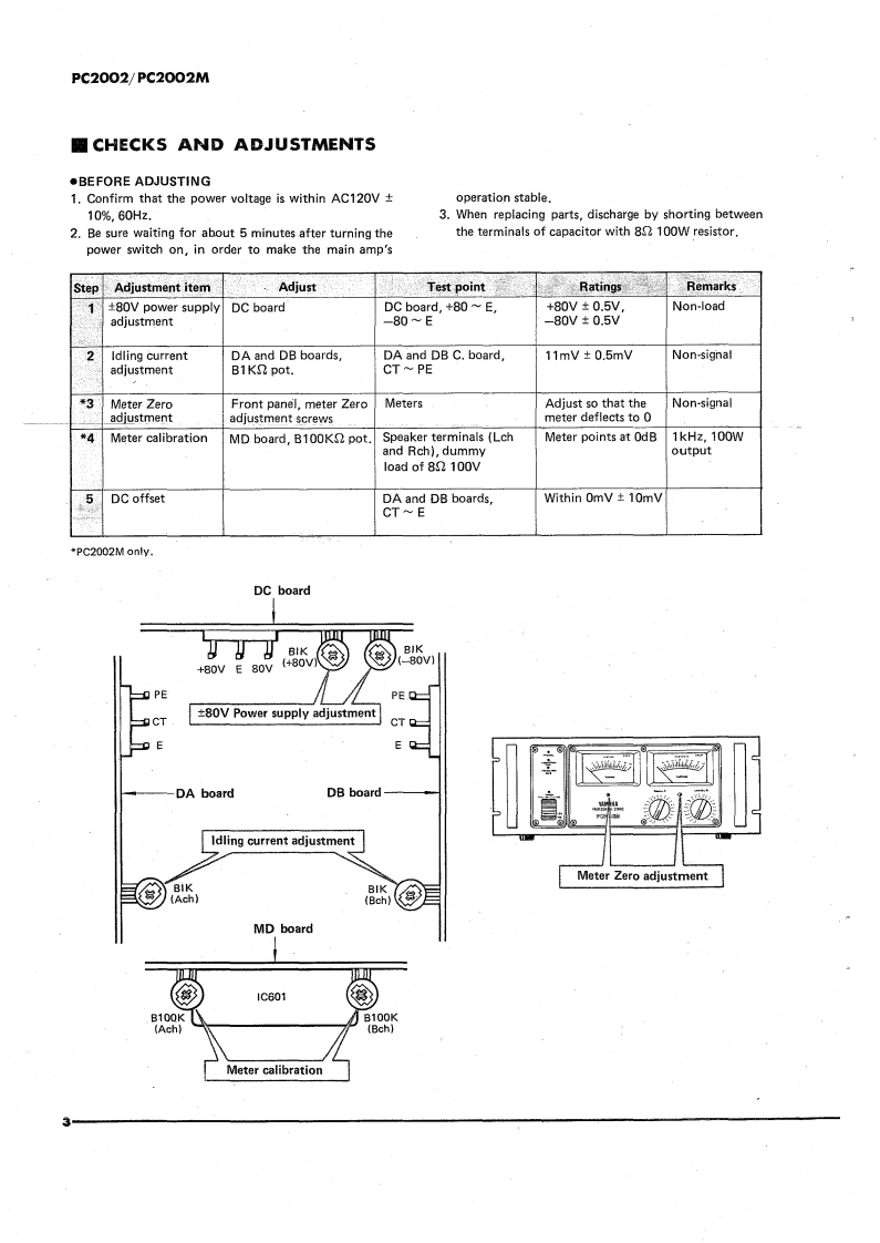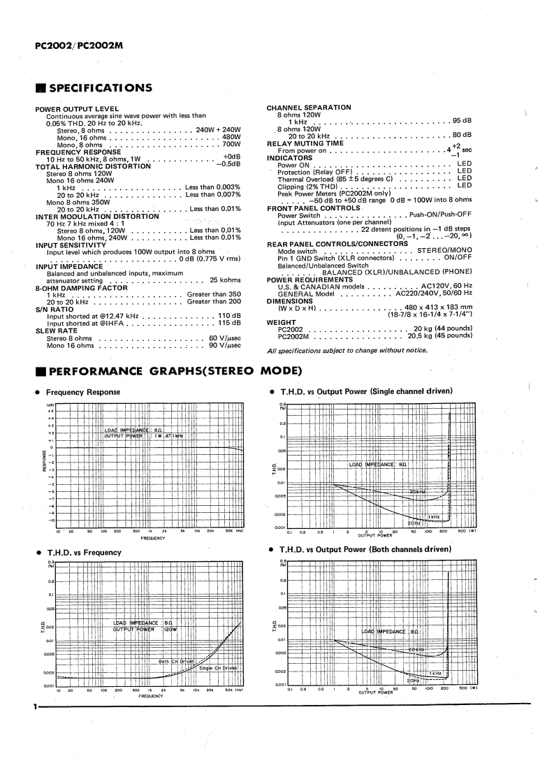 1POWER AMPLIFIERSERVICE MANUALFRONT PANEL823POWER Switch/Indicator②THERMAL Indicator5PROTECTION IndicatorsPEAK Reading Meters (PC2002M only)CLIP Indicators6Meter Zero Adjustment Screws⑦Input AttenuatorsAMAH⑧Carrying HandlesRubber Control Locks (Accessory}REAR PANEL6SPEAKER Output Terminals88②PIN1 GND Lift SwitchBalanced XLR connectors2Unbalanced Phone JacksBALANCED/UNBALANCED SwitchSTEREO/MONO MODE Switch⑦Power Cord Holder8FusesU.S.CANADIAN models④■CONTENTSSPECIFICATIONS,,.····BLOCK DIAGRAM4PERFORMANCE GRAPHSDISASSEMBLY PROCEDURES,,····DIMENSIONS.··4CIRCUIT BOARDS5CHECKS AND ADJUSTMENTSSCHEMATIC DIAGRAM10SINCE 1887YAMAHA006532NIPPON GAKKI CO..LTD.HAMAMATSU.JAPAN2300同②Printed in Japan.1i.82