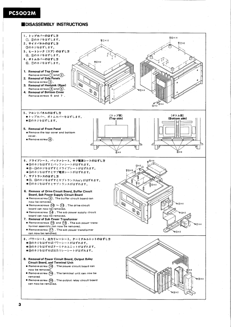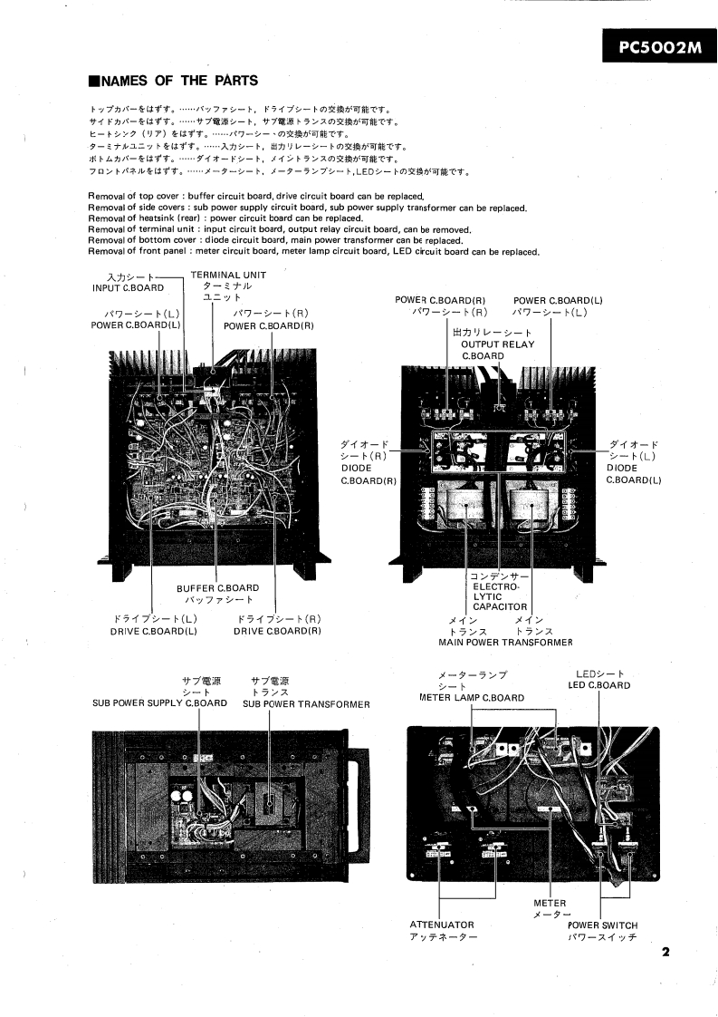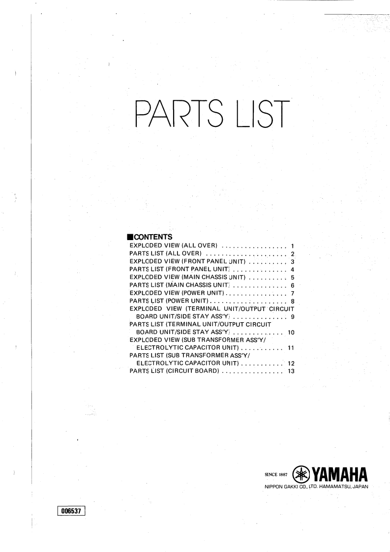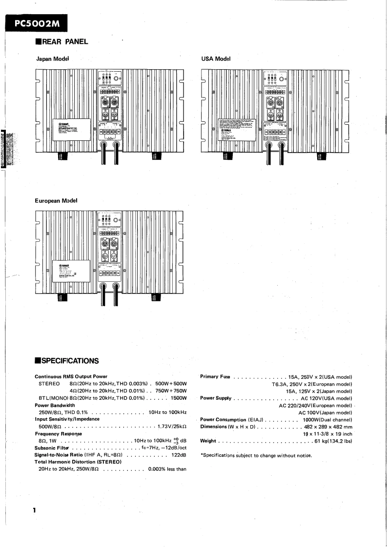 DUAL CHANNEL POWER AMPLIFIERPC5002MSERVICE MANUAL■FRONT PANEL⊙心G0N只0只⊕■CONTENTSREAR PANEL.·SPECIFICATIONS1NAMES OF THE PARTS...,·DISASSEMBLY INSTRUCTIONS,.,.·····GENERAL ADJUSTMENTS....................4PRINTED CIRCUIT BOARD LAYOUT.······PARTS LIST............................1~17COMPLETE CIRCUIT DIAGRAMWIRINGSINCE 1887006537YAMAHANIPPON GAKKI CO..LTD.HAMAMATSU,JAPAN2.2KPrinted in Japan.3.83.