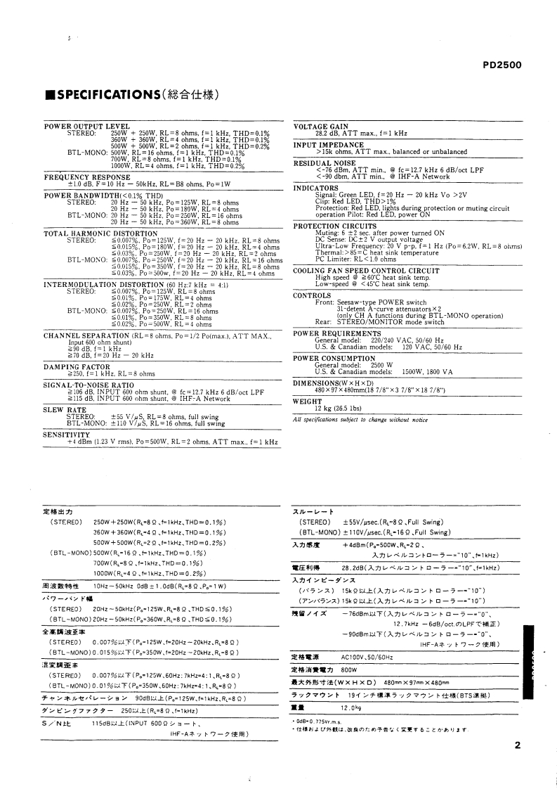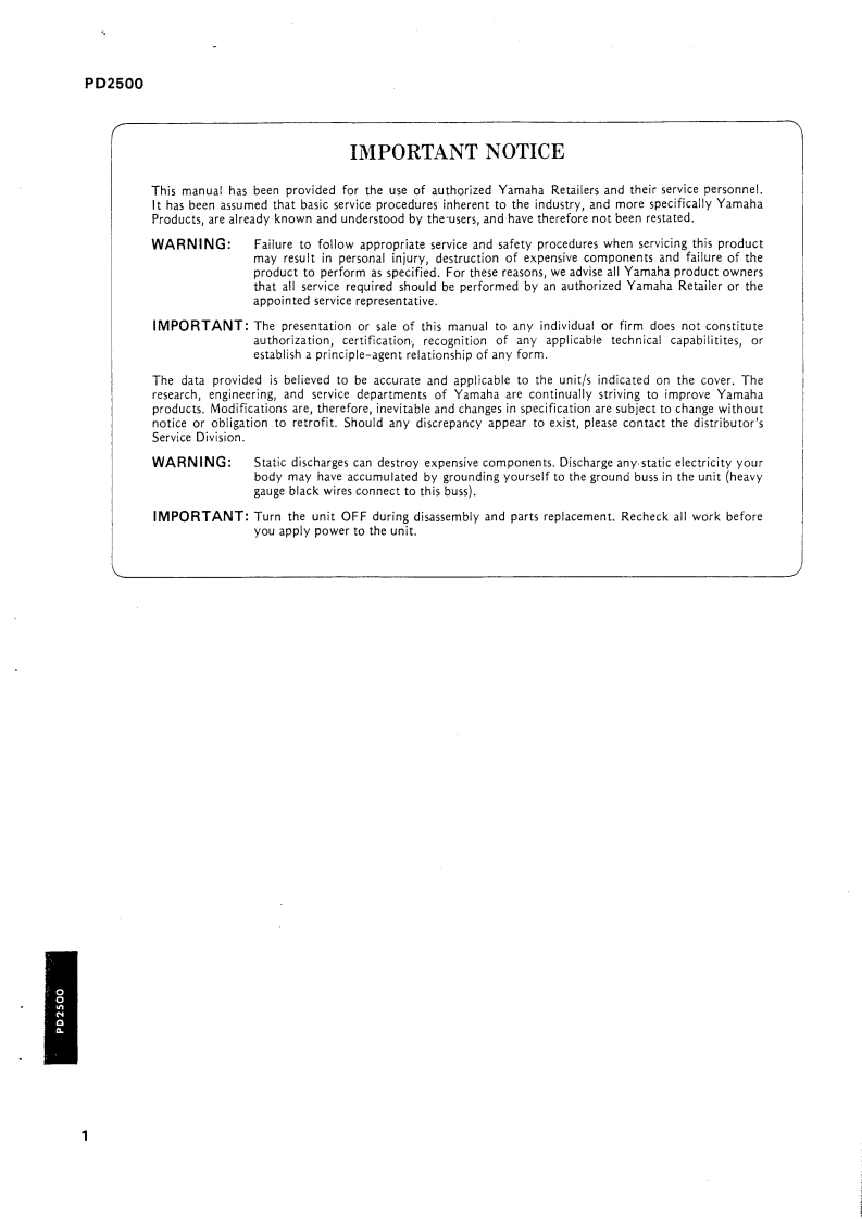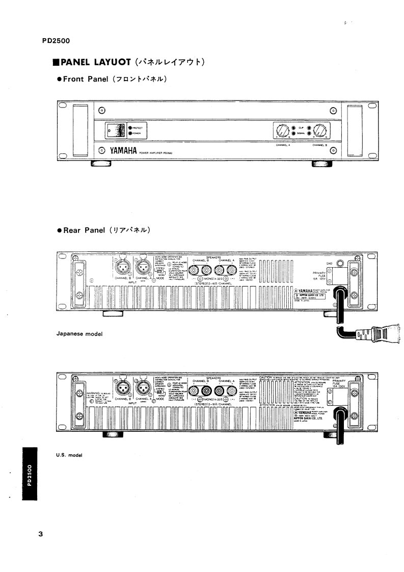 POWER AMPLIFIERPD2500SERVICE MANUALYAMAHA圖CONTENTS(目次)SPECIFICATIONS(給合仕核)…2PANEL LAYOUT(ネ儿L了7卜)…3DIMENS引ONS(寸法☒)…4BLOCK DIAGRAM(ブ口y夕ダ1了艺ラ么)…4PEFORMANCE GRAPHS(特性☒)…51CBL0 CK DIAGRAM(ICブ口y夕☒)…7CIRCUIT BOARDS(之一卜基板☒)…7PARTS LIST(バ-y)又卜)SINCE 1887006729YAMAHANIPPON GAKKI CO.LTO.HAMAMATSU.JAPAN2.18K-272 Printed in Japan'86.12