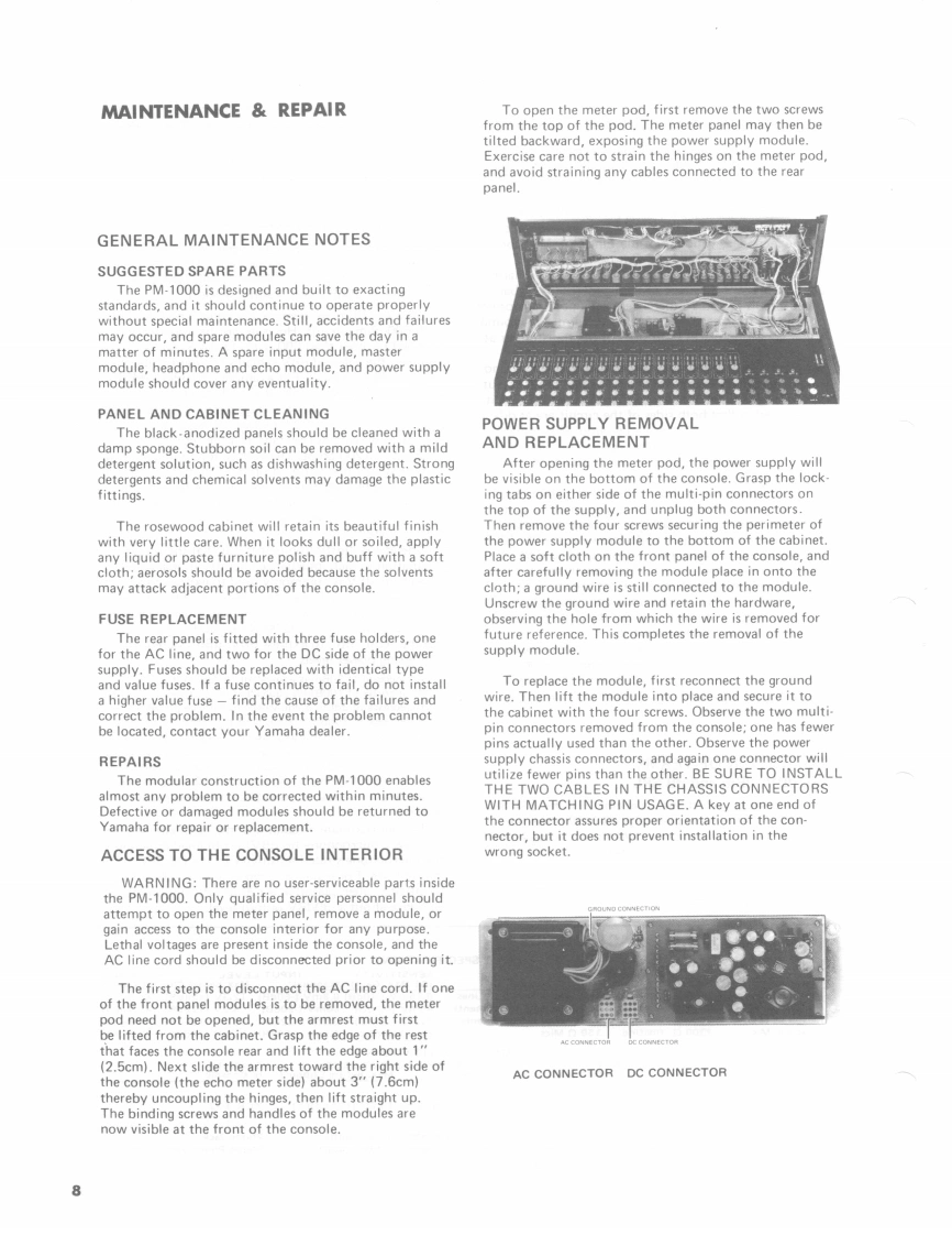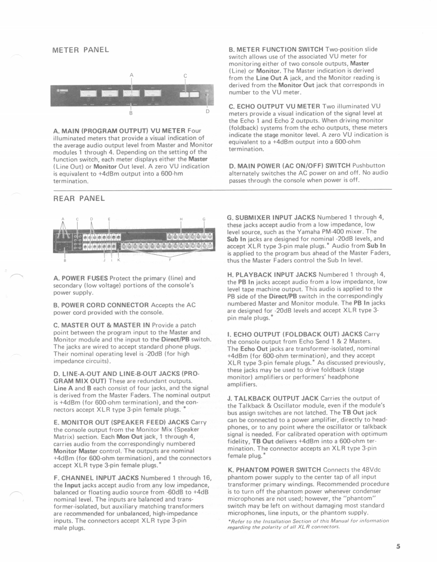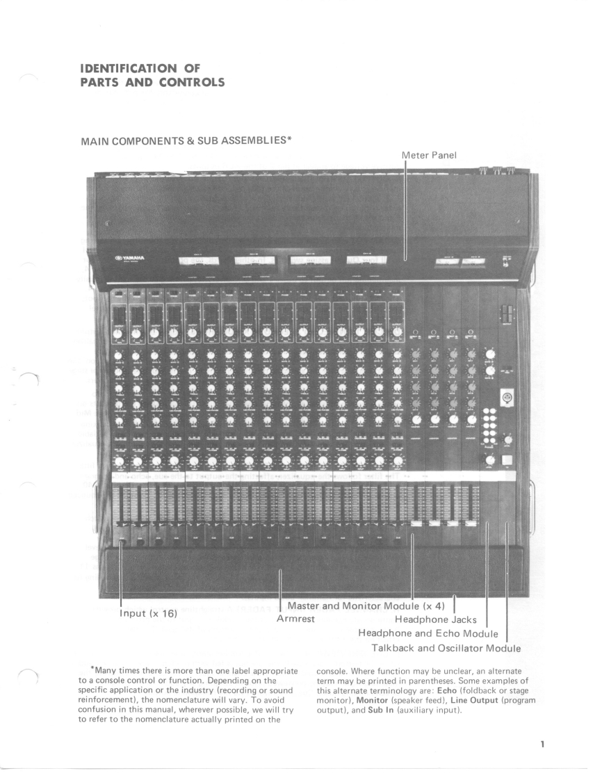 PA MIXER PM-1000SERVICE MANUALThe PM-1000 is a 4-bus mixing console with 16input channels.Yamaha engineers,in cooperationwith soundmen,mixers and performers,designedthis board to meet with widely varied demands ofprofessional sound reinforcement,as well as studioapplications.Modular construction and all solid statecircuitry assure reliability and ease of maintenance.To enhance its appearance,the console is finishedwith durable,black-anodized aluminum panels andhoused in a handsome rosewood cabinet with apadded armrest.Carrying handles on the side panelsand a padded leatherette cover are included asstandard equipment.Every console is delivered complete with a fullcomplement of modules,and ready for use.Trans-former isolated inputs and outputs,plus a precisionwide-range input sensitivity selector on each channelhelp simplify installation and optimize performancewith virtually any type of audio system.Furtherconvenience is afforded by the 40 XLR connectors,eight (8)phone jacks and two(2)stereo phonejacks that carry all input and output signals.The PM-1000 is built to exacting standards.It islight,yet rugged enough to sustain the kind of punish-ment that often occurs in portable applications.Forfixed installations,the console has all the featuresand appearance of many larger,custom boards.Topof the line performance at an economical price setsthe PM-1000 in a class by itself.006342米YAMAHALSM-3网①0.1@Printed in Japan9.8l