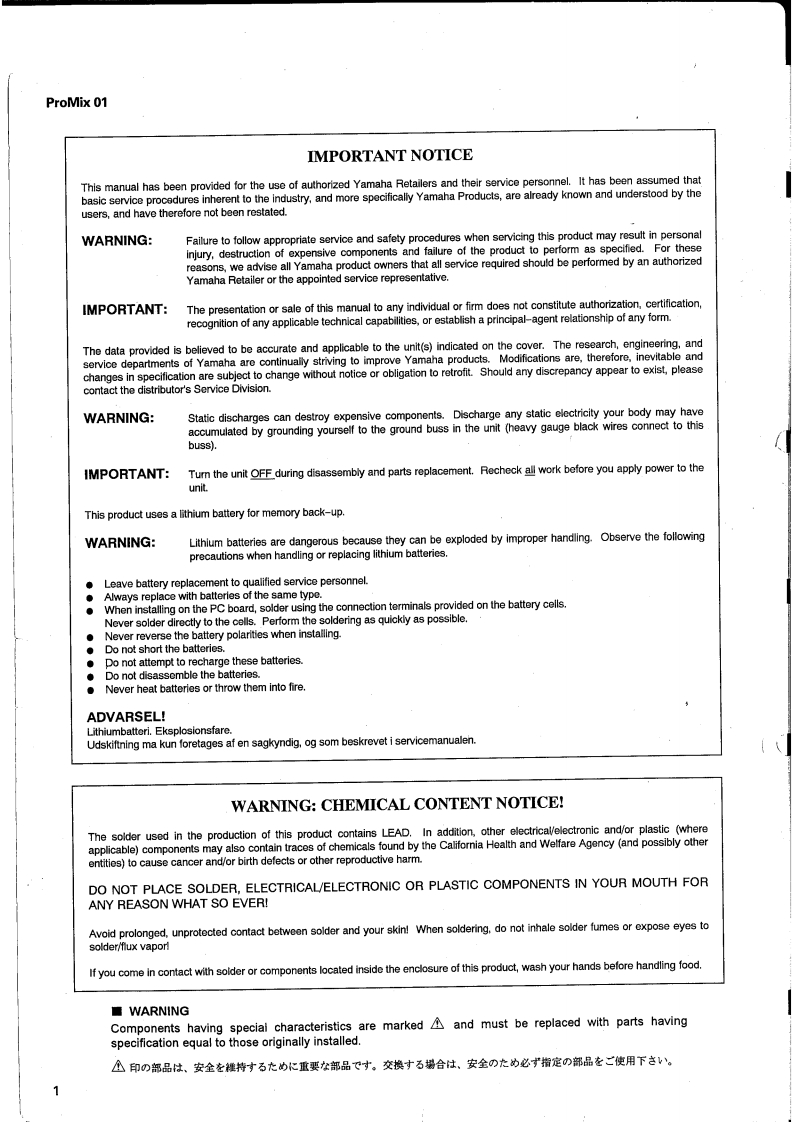 DIGITAL PROGRAMABLE MIXERRotee aSERVICE MANUAL华扫0■CONTENTS(目次)SPECIFICATIONS(合仕様)..2/5PANEL LAYOUT(J8礻儿LTT7卜).9DIMENS引ONS(寸法☒)g11CIRCUIT BOARD LAYOUT(Z二y卜亻了7卜)..12BLOCK DIAGRAM(ブ口y夕ダ亻予5ラA)14LEVEL DIAGRAM(LX儿ダ亻T5ラh).15DISASSEMBLY PROCEDURE(分解手順.16STEPS INVOLVED IN REPAIRING(修理時)乜y子亻5方法)……22LSI PIN DESCRIPTION(LSI端子機能表).23IC BLOCK DIAGRAM(IC丁口y夕☒).29CIRCUIT BOARDS(一卜基板☒)..30INSPECTIONS(検查).48/54TEST PROGRAM(F父下プa95)5157INITIALIZATION(个三之中亏亻.60CHECKING THE BATTERY(/バyテ-于工y夕).61FADER CALIBRATION(7工-ダ-牛中)ブL-之3)62ERROR MESSAGES(工ラ-Xy乜-)..63/68MIDI DATA FORMAT (MIDI子-夕フ才-マy卜)..69/82MIDI IMPLEMENTATION CHART .................85OVERALL CIRCUIT DIAGRAM...........88PARTS LISTYAMAHA CORP.PA011244HAMAMATSU,JAPAN2.66K-197 Printed in Japan*94.0919940901-218000