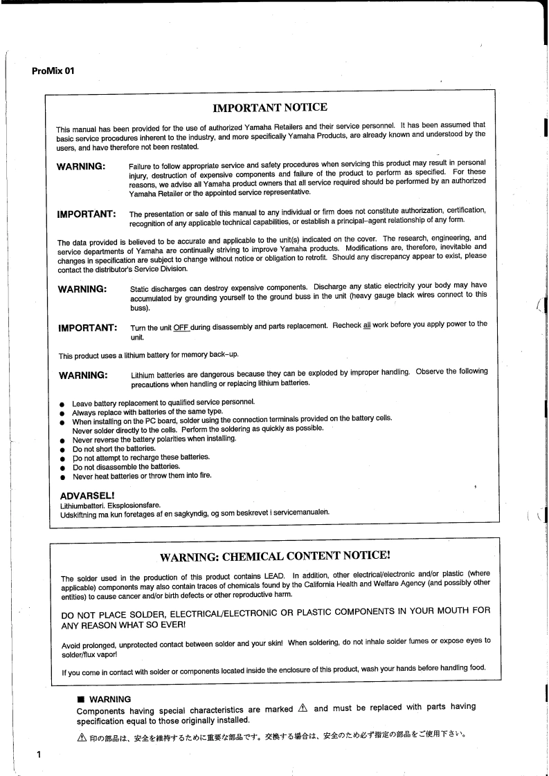 DIGITAL PROGRAMABLE MIXERRotee aSERVICE MANUAL华扫0■CONTENTS(目次)SPECIFICATIONS(合仕様)..2/5PANEL LAYOUT(J8礻儿LTT7卜).9DIMENS引ONS(寸法☒)g11CIRCUIT BOARD LAYOUT(Z二y卜亻了7卜)..12BLOCK DIAGRAM(ブ口y夕ダ亻予5ラA)14LEVEL DIAGRAM(LX儿ダ亻T5ラh).15DISASSEMBLY PROCEDURE(分解手順.16STEPS INVOLVED IN REPAIRING(修理時)乜y子亻5方法)……22LSI PIN DESCRIPTION(LSI端子機能表).23IC BLOCK DIAGRAM(IC丁口y夕☒).29CIRCUIT BOARDS(一卜基板☒)..30INSPECTIONS(検查).48/54TEST PROGRAM(F父下プa95)5157INITIALIZATION(个三之中亏亻.60CHECKING THE BATTERY(/バyテ-于工y夕).61FADER CALIBRATION(7工-ダ-牛中)ブL-之3)62ERROR MESSAGES(工ラ-Xy乜-)..63/68MIDI DATA FORMAT (MIDI子-夕フ才-マy卜)..69/82MIDI IMPLEMENTATION CHART .................85OVERALL CIRCUIT DIAGRAM...........88PARTS LISTYAMAHA CORP.PA011244HAMAMATSU,JAPAN2.66K-197 Printed in Japan*94.0919940901-218000
