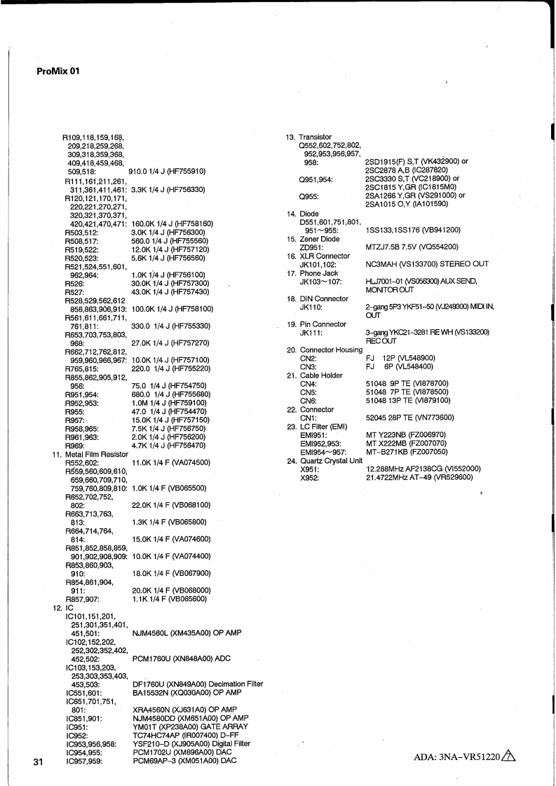 ProMix 01■CIRCUIT BOARDS(位一卜基板☒)Notes)5.Electrolytic Cap.Circuit Board:ADA (VR512200)XN547B0C109.118.1211251.Mylar Capacitor159,168.171~175C104,105,107,108209,218.221≈225113,114,116.117259,268.271~275154,155,157.158309,318,321~325163.164.166.167359,368,371~375204.205,207.208.409,418,421425213,214,216,217459,468,471475254.255,257,258.509,518,521~525263.264.266,267528,530,661,711304.305.307.308.759,761,809,811,313,314316,317957,973,979:10.0035.0VJ857100)354355.357,358C128,129,178,179363,364.366,367228,229,278,279404.405.407,408328,329,378,379413,414.416,417428.429.478.479454,455,457.458532,533,965,972:47.0016.0VUJ837470)463,464,466,467C559,609,659,504,505,507.50870947.0025.0VUU847470)513,514.516.5171200P50VJUA353120)C660,710,760,810C557.607.657.,7071004.1005:100.0025.0WUU848100)757,807:6800P50VJ(UA353680)C854.856.904.906C558,608,658,708963.970.976,977758,808:3000P50VJUA353300)982,983,1003,100C987:0.01050VJUA654100)1007100.0016.0VUu838100)Monolithic Mylar CapacitorC959961.964C551,601:0.1050VJVE326000)966968,971:10.0016.0VUU837100)3.Ceramic CapacitorC962.969:22.0016.0WUU837220)C101.112,151.162C1000:220.0010.0VJ828220)201,212,251262C1002.0050.0WW866100)301.312,351.3626.Electrolytic Cap.-BP401.412,451,462:470P50VKWD842200)C655,705,755C102,103152,153805:1.0050.0VUK866100)202.203,252,2537.Coil302,303,352,353L951~954:FL5R200QNT 20uH (VB835000)402403.452.453T951TC-1019-06VC548200)502.503,553,5548.Ferrite Bead603,604,653,654L14:BL02RN1-R62T4(GE300610)703.704,753,7549.Noise Filter803,804,852,853,L5:ZYU51R5-2PWP246300)902.903.99910000P16VNVD843800)10.Carbon ResistorC529.531.652,702R101,110,151,160752,802:47P50VJWD840900)201,210,251,260C552,602.1001:100P50WKVD841300)301,310,351,360C851,855.857858401,410,451,460:13.0K1/4J(HF757130)901,905,907,908H102,152,202,2521012:33P50 VJSL (VD840700)302,352,402,452:3.6K1/4J(HF756360)C951,952:22P50 VJCH (K663100)R103,104,108,112C954,955:33P50 V JCH VA761200)113.117.153,154C988:220P50WKVD841800)15B.162,163,167C101322P50 VJSL (VD840500)203,204,208,212C1014k27P50 VJ SL (VD840600)213,217,253,2544.Monolithic Ceramic Cap.258262,263,267C110,111,119.120303.304.308,312126,127,10,161313,317.353,354169,170,176,177358,362,363.367210,211.219.220403.404.408,412226,227260.261413.417453,454269,270,276.277458.462.463.467310,311,319,320504.513:2.2K1/4JHF756220)326,327,360,361R105,114,155,164369,370,376377205.214.255.264410,411.419.420305,314.355,364426,427,460,461405.414.455.464469,470,476,477505,514470.01/4J(HF755470)510,511.519,520R107,116,157,166526,527.953.956207.216.257.266958,974,975.978307316,357.366980.981,984.985407.416,457466989,990:0.10050VZW1307100)507516:1.3K1/4JHF756130)30