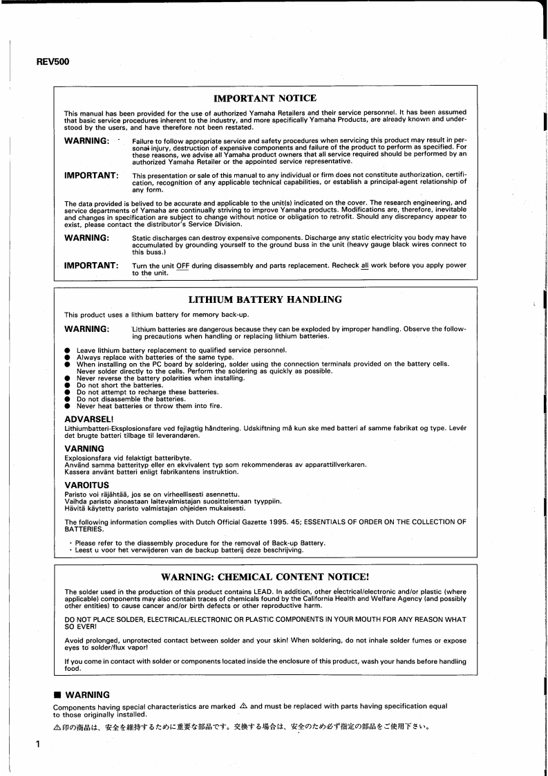 DIGITAL REVERBERATOR良三WSO一SERVICE MANUAL岗高尚黑■CONTENTS(目次)SPECIF1 CATIONS(稀合仕横)2PANEL LAYOUT(IR礻ル亻Tヴ卜)BLOCK DIAGRAM(ブ口y夕ダF方ラ厶)....5CIRCUIT BOARD LAYOUT(ユ二y卜L亻予7卜).6DIMENSIONS(付法☒)..DISASSEMBLY PROCEDURE(分解手順.67LSI PIN DESCRIPTION(LSI端子機能表).11IC BLOCK DIAGRAM(C口y夕☒).13CIRCUIT BOARDS(之一卜基板☒)15INSPECTIONS(梭查仕横)….20/23TEST PROGRAM(行ㄡK于a7与A)..21/24ERROR MESSAGES(工ラ-Xy七-..2225MIDI DATA FORMAT (MIDIデ-夕フ才-マy卜).…26MIDI IMPLEMENTATION CHART...............29OVERALL CIRCUIT DIAGRAMPARTS LISTYAMAHA CORP.PA011347HAMAMATSU.JAPAN19961110-498002.3K-253 Printed in Japan96.11