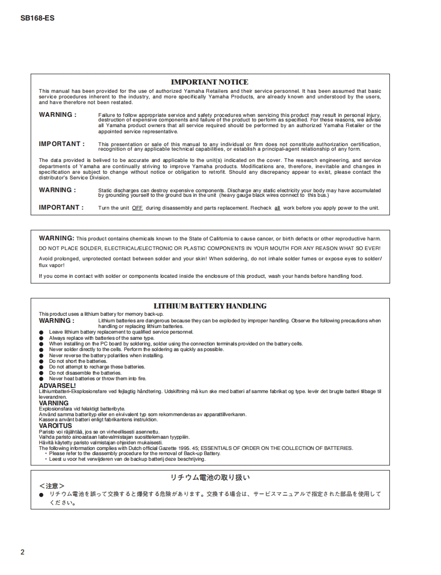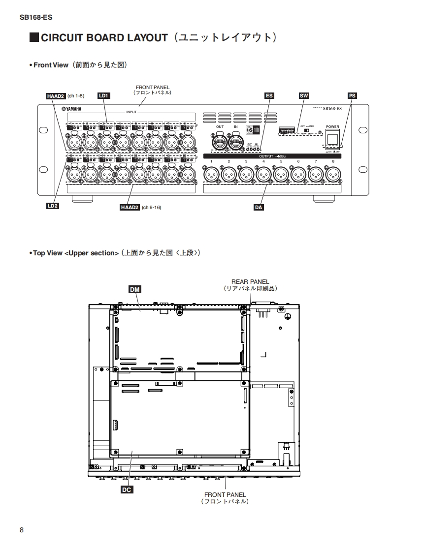 STAGE BOXSB168-ESSERVICE MANUAL三三三套三目■CONTENTS(目次)SPECIFICATIONS(稔合仕樣).4PANEL LAYOUT(/パ礻儿L亻了7卜).6DIMENSIONS(寸法☒)...7CIRCUIT BOARD LAYOUT(ユ二y卜亻予卜)..8DISASSEMBLY PROCEDURE(分解手順).10LSI PIN DESCRIPTION(LSI端子機能表).19IC BLOCK DIAGRAM(ICブ口y夕☒)27CIRCUIT BOARDS(一卜基板☒)..30TEST PROGRAM(テ又卜ブ口5ラ4)46/60INSPECTIONS(検查)..7476HOW TO BACKUP SB168-ES DATA(本体デ-夕1バy夕了y方法)..7879FIRMWARE UPDATE(7p-47工T0Tyプデ-卜)…80/85ERROR MESSAGES(Iラ-メy乜-)..90/91NARNING MESSAGES(7-二>5Xy七-).92PARTS LISTBLOCK DIAGRAM(ブ口y夕ダ亻予5ラ4)NIRING(基板桔線☒)CIRCUIT DIAGRAM(回路☒)PA011934YAMAHA200901.才-ブブラ1入HAMAMATSU,JAPANCopyright (c)Yamaha Corporation.All rights reserved.PDF KM'09.01