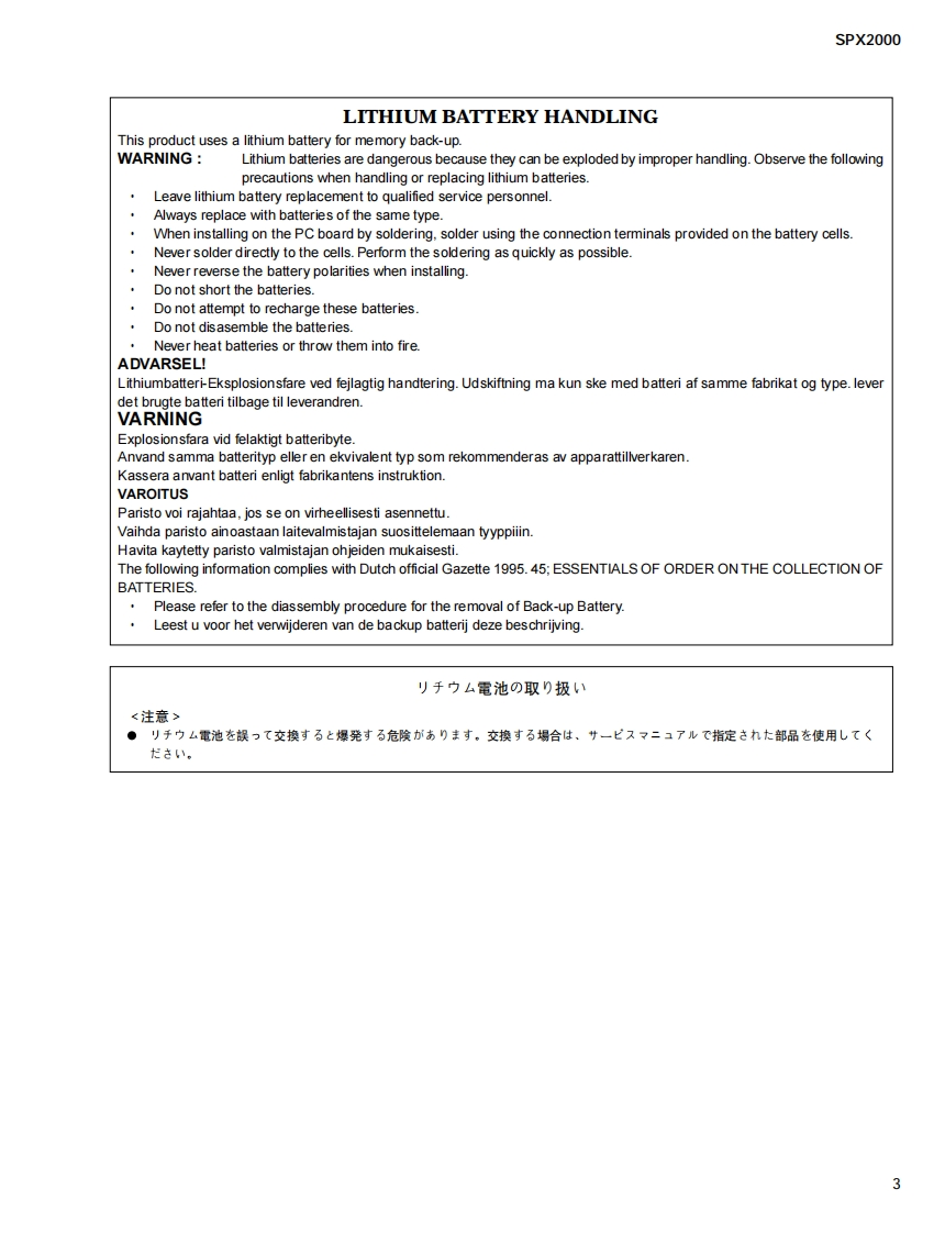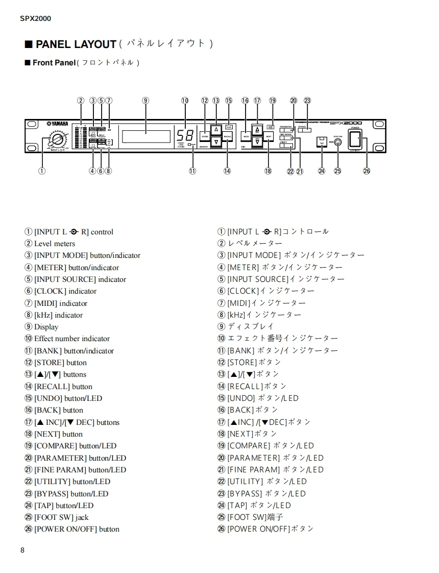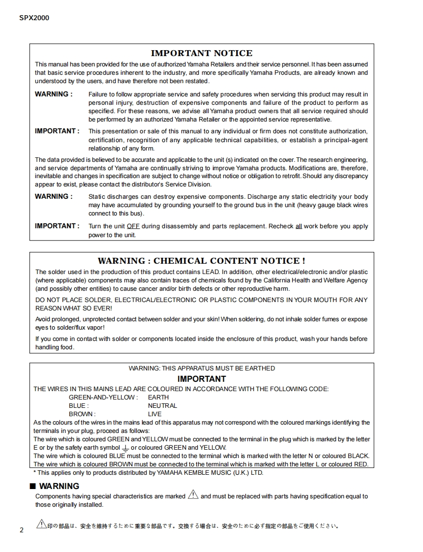 PROFESSIONAL MULTI-EFFECT PROCESSOR写与×二口▣口SERVICE MANUALYAMAHA■CONTENTS(目次)SPECIFICATIONS(然合仕樣)..4DIMENSI引ONS(寸法☒).7PANEL LAYOUT(八礻儿L亻7ヴ卜).8CIRCUIT BOARD LAYOUT(1二y卜V亻77卜).0DISASSEMBLY PROCEDURE(分解手順).11LSI PIN DESCRIPTION(LSI端子機能表)16IC BLOCK DIAGRAM(ICブ口y夕☒)..20CIRCUIT BOARDS(之一卜基板㘝)…23INSPECT1ONS(検查).29/32TEST PROGRAM(于又卜ブ口分7h).35/42NRINTING PROGRAM(寸口yラhの書老达)49BU儿KOUT(ALL).50INITIALIZING THE SPX2000(初期化).…..aa.50ERROR MESSAGE LIST(工ラ-Xy七-岁).51/52MIDI IMPLEMENTATION CHART .........53MIDI DATA FORMAT.54PARTS LISTBLOCK DIAGRAM(寸口y夕女亻7艺ラㄙ)OVERALL CONNECTOR CIRCUIT DIAGRAM(然]礻夕夕接続回路㘝)OVERALL CIRCUIT DIAGRAM(総回路㘝)PA011695米YAMAHAHAMAMATSU,JAPAN200307-108000Copyright(c)Yamaha Corporation.All rights reserved.PDF-K2331 IT Printed in Japan'03.07