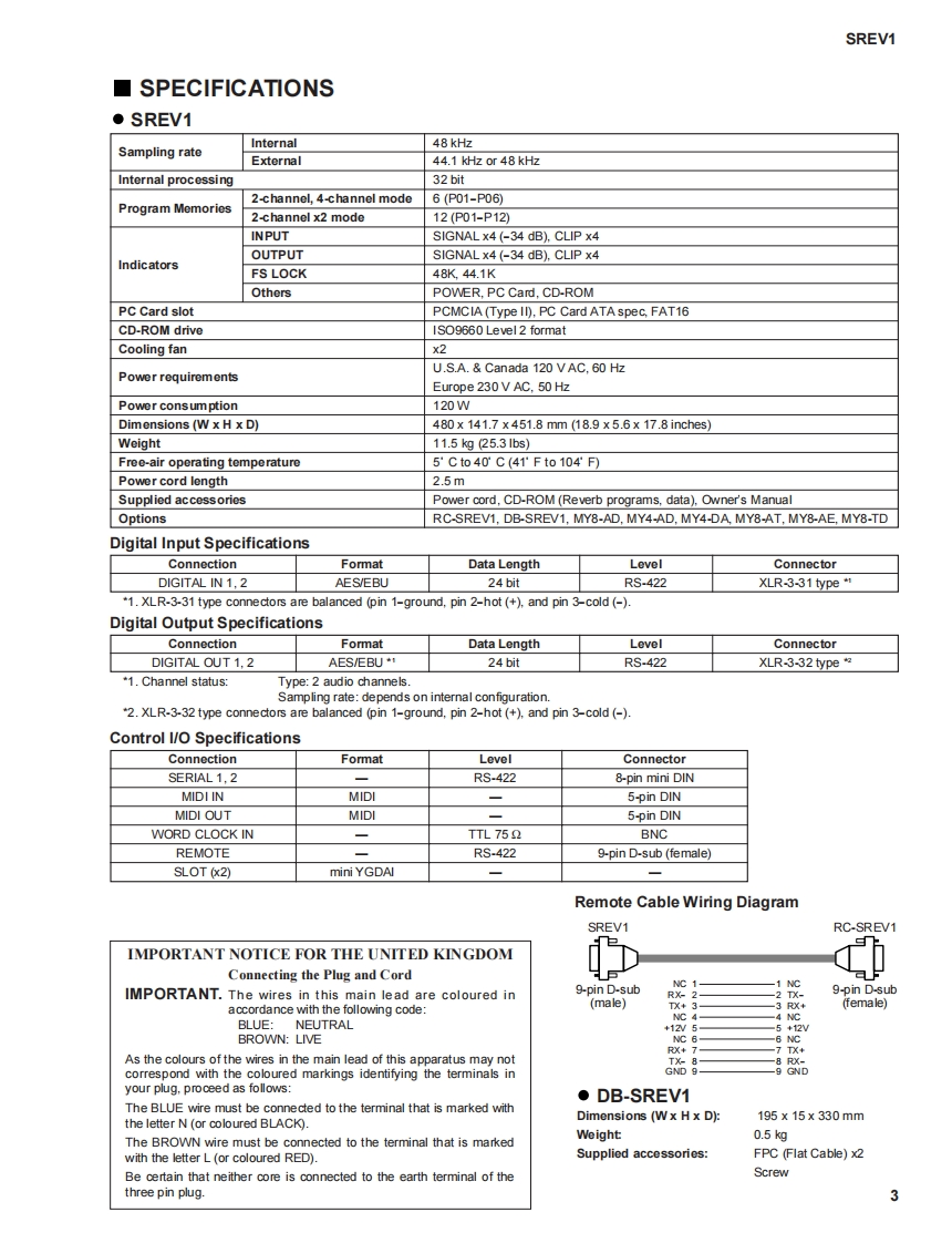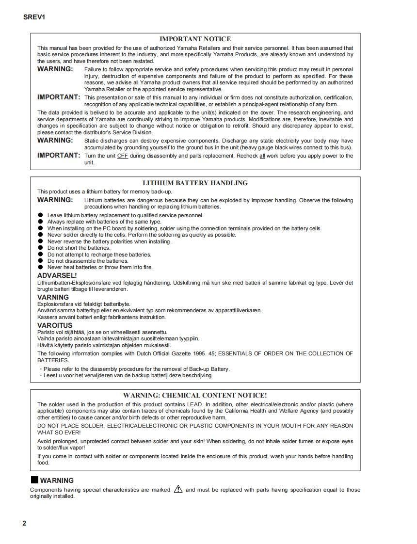 SAMPLING REVERBERATOR/DSP EXPANSION BOARD/REMOTE CONTROLLERSREVI/DB-SREVI/RC-SREVISERVICE MANUALC图YAMAHA·DB-SREV1·SREV1■CONTENTSSPECIFICATIONS·……3PANEL LAYOUT…4CIRCUIT BOARD LAYOUT…5…DIMENSIONS..............61MRING…7…BLOCK DIAGRAM………9DISASSEMBLY PROCEDURE11…O CARD INSTALLATION...........................................16.....DB-SREV1 INSTALLATION................................................7…LSI PIN DESCRIPTION…9…IC BLOCK DIAGRAM…24…CIRCUIT BOARDS…29TEST PROGRAM…4ERROR MESSAGES…44……MIDI IMPLEMENTATION CHART..........................................46…PARTS LISTRC-SREV1 SERVICE MANUALThis document is pinted on chlodine free (ECF)paper with soy ink.SREV1/RC-SREV1 OVERALL CIRCUIT DIAGRAMPA0115551/2YAMAHASREV1:20001225-500000HAMAMATSU.JAPANRC-SREV1:20001225-1500001.415K-0671 FT Printed in Japan '01.02DB-SREV1:20001225-200000