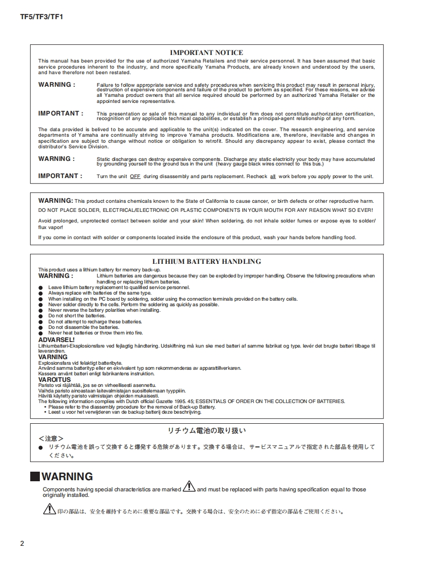 DIGITAL MIXING CONSOLESERVICE MANUALTF5TF3TF1■CONTENTS(目次)SPECIFICAT1ONS(稔合仕横)4SETTINGS FOR SHIPMENT(出荷設定)..160/193PANEL LAYOUT(Uパ礻儿亻了ヴ卜)】5FADER CALIBRATIONDIMENSIONS(付法☒).10(7工-ダ牛中)ブ-之3).194/196TF5 CIRCUIT BOARD LAYOUTINITIALIZATION(初期化)….198(TF5ユ二y卜y亻了卜)12FIRMWARE(HOST CPU AND OTHER SUB CPU)TF3 CIRCUIT BOARD LAYOUTUPDATER BY USB MEMORY(TF3ユ二y卜亻了ヴ卜)6(USB毛)-E7T-47工予(ホ又卜マ亻口TF1 CIRCUIT BOARD LAYOUT及水、他0片7亻白)害老汉方法)…199/201(TF1工二y卜亻了7卜)18SEQUENCE (..................203/206TF5 DISASSEMBLY PROCEDURE(TF5分解手順)..21PARTS LISTTF3 DISASSEMBLY PROCEDURE(TF3分解手順)..44BLOCK DIAGRAM(ブ口y夕ダ亻了5ラ4)TF1 DISASSEMBLY PROCEDURE(TF1分解手順)..67OVERALL CONNECTOR CIRCUIT DIAGRAMLSI PIN DESCRIPTION(LSl端子機能表).90(稔口礻夕夕接続回路☒)CIRCUIT BOARDS(之-卜基板☒)…106CIRCUIT DIAGRAM(回路☒)TEST PROGRAM(テ又卜ブ口5ラ4)...128/161PA012144YAMAHAHAMAMATSU,JAPANCopyright (c)Yamaha Corporation.All rights reserved.PDF'15.05