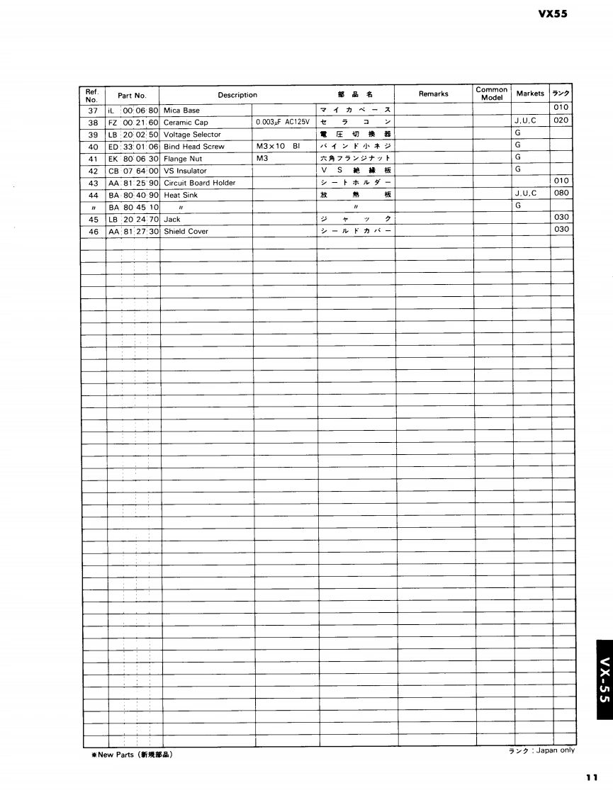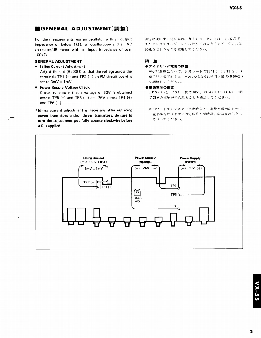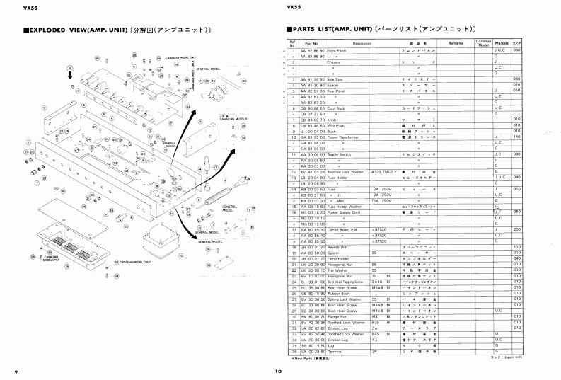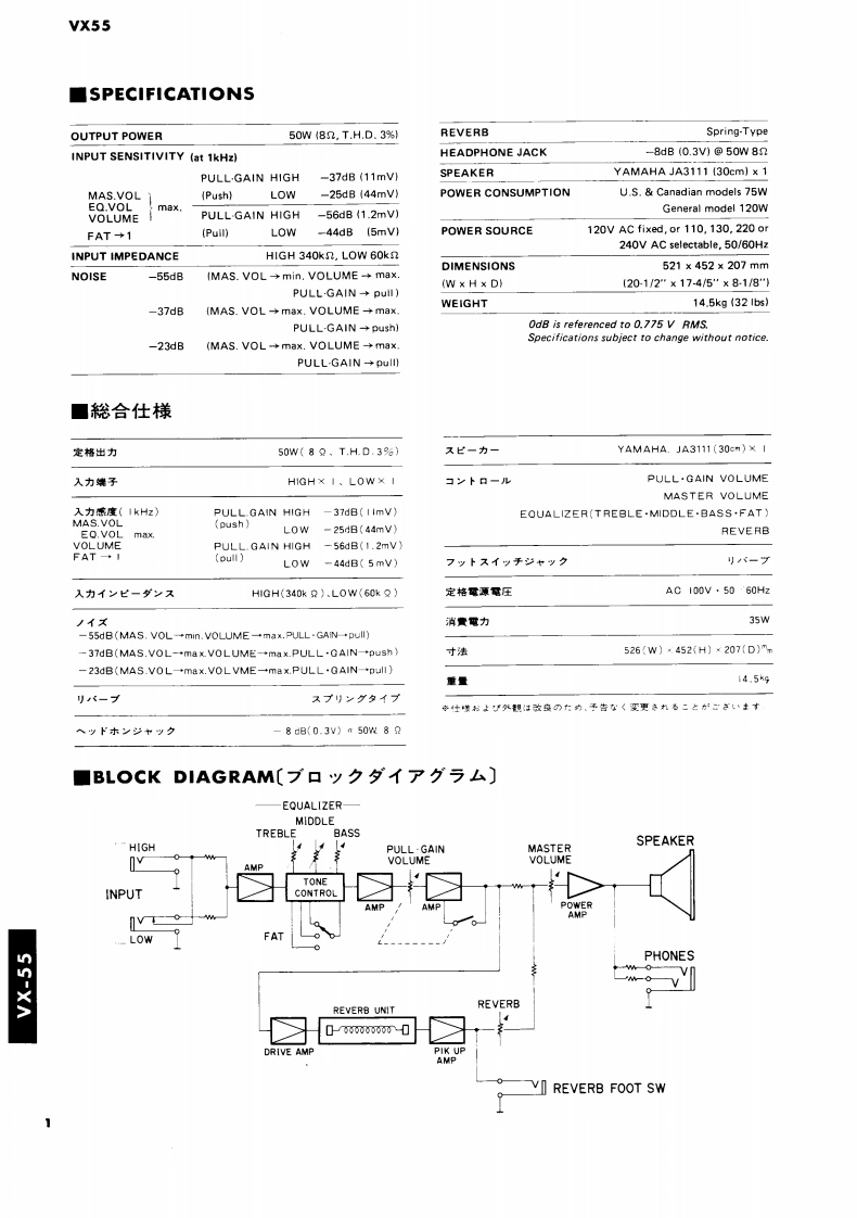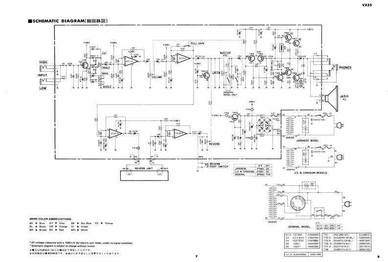 GUITAR AMPLIFIERVX55SERVICE MANUAL■FRONT PANEL〔フ口>K木儿〕@@666068VX SERIES雪写@MASTER VOL.BASSREVERB■CONTENTS〔目次)SPECIFICATIONS〔移合仕楼)···2PARTS LIST(AMP.UNIT).·.·.··10/11GENERAL ADJUSTMENT〔调整).,,·,·,····2〔-以刂入下(了ブユ二ッ卜))CHECK SPECIFICATIONS(檳查仕樣)·....34EXPLODED VIEW (CABINET)12PRINTED CIRCUIT BOARD (Parts side)......5/6〔分解☒(外装部)]〔之一卜☒(部品面))PARTS LIST (CABINET)12BL0 CK DIAGRAM〔ブay夕夕17y与ㄙ)...6〔バ-y)又卜(外装部))SCHEMATIC DIAGRAM钱回路☒)....7/8PARTS LIST (ELECTRICITY)13EXPLODED VIEW(AMP.UNIT)...·..···〔-y刂天卜(量氢部))〔分解☒(了ブ1二y卜))VX-55SINCE 1887006589YAMAHANIPPON GAKKI CO.,LTD.HAMAMATSU,JAPAN84.12.6K-50l▣①Printed in Japan