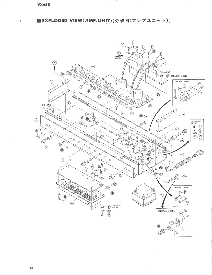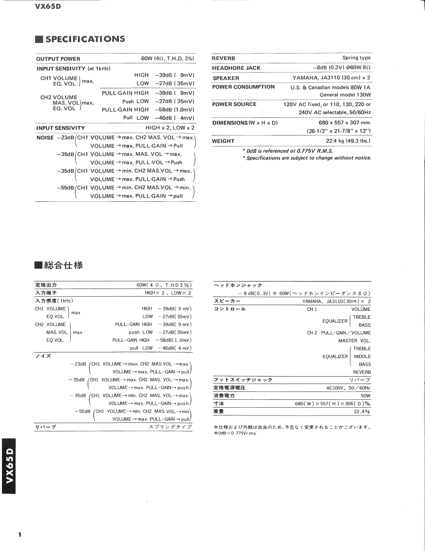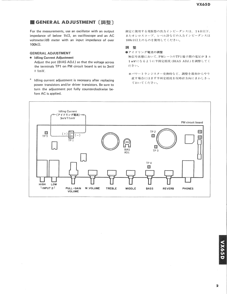 GUITAR AMPLIFIERVX65DSERVICE MANUAL圈FRONT PANEL(フ口卜,S木)以酷后5D@@圆CONTENTS(目次)SPECIFICATIONS〔稀合仕横)。··,·,·····2PARTS LIST (AMP.UNIT)................11/12GENERAL ADJUSTMENT(整).······3〔,-y刂又卜(了ブユ二y卜)〕CHECK SPECIFICATIONS〔换查仕梯)..·,···.3~5EXPLODED VIEW(CABINET)..............13PRINTED CIRCUIT BOARD (Parts side)........6/7〔分解☒(外装部))〔之一卜☒(部品面门PARTS LIST(CABINET).·...·.·......13BL0 CK DIAGRAM〔ブaッ夕夕亻T夕ラ△)...·7〔パ一以刂又卜(外装部))SCHEMATIC DIAGRAM〔裕回路☒).,.,···8/9PARTS LIST(ELECTRICITY),·.,···,····14EXPLODED VIEW (AMP.UNIT).............10〔バ一以刂又卜(電气部)〕VX65D〔分解☒(了>ブ3二y卜))SINCE 1887YAMAHA006579NIPPON GAKKI CO.,LTD.HAMAMATSU,JAPAN2.6K-641▣©Printed in Japan83.11