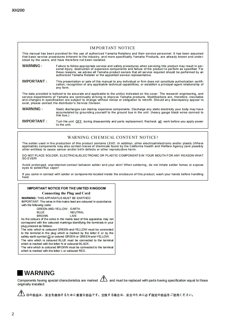 POWER AMPLIFIERXH200SERVICE MANUALYAMAHA■CONTENTS(目次)SPECIFICATIONS(然合仕樣)…3CIRCUIT BOARD LAYOUT(二y卜亻了7卜)....4W川RING(結線☒).…5DIMENSIONS(寸法☒)..6PANEL LAYOUT(パ礻儿y亻了7卜)........7DISASSEMBLY PROCEDURE(分解手順)..8ICBL0 CK DIAGRAM(ICブ口y2☒1…15CIRCUIT BOARDS(今一卜基板☒).16INSPECTIONS(検查)..…25/30TROUBLESHO0TING(卜ラブ儿>1一テy分)...35/58BLOCK DIAGRAM(ブ口Y夕ダ亻了分ラ4)CIRCUIT DIAGRAM(回路☒)PARTS LISTPA011807YAMAHA200511.176400HAMAMATSU,JAPANCopyright(c)Yamaha Corporation.All rights reserved.PDF'05.12