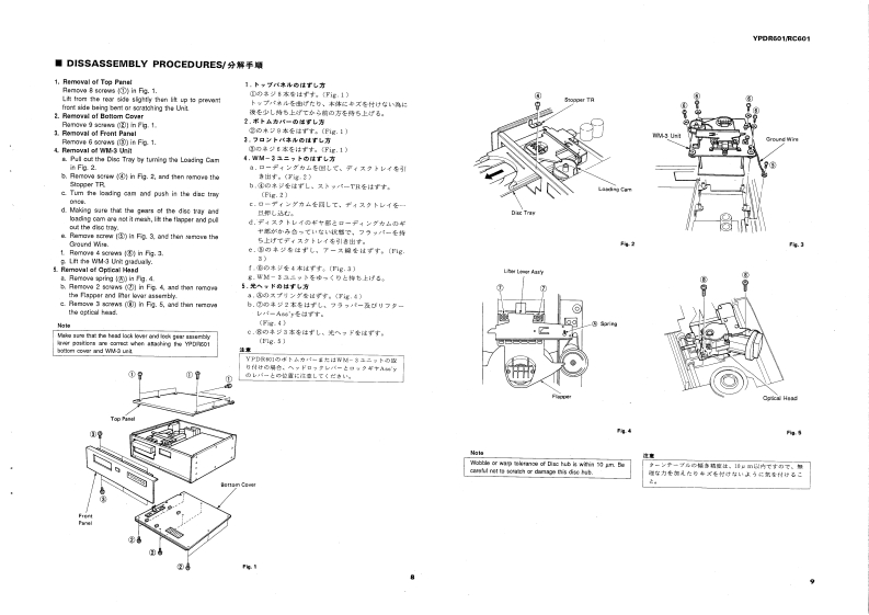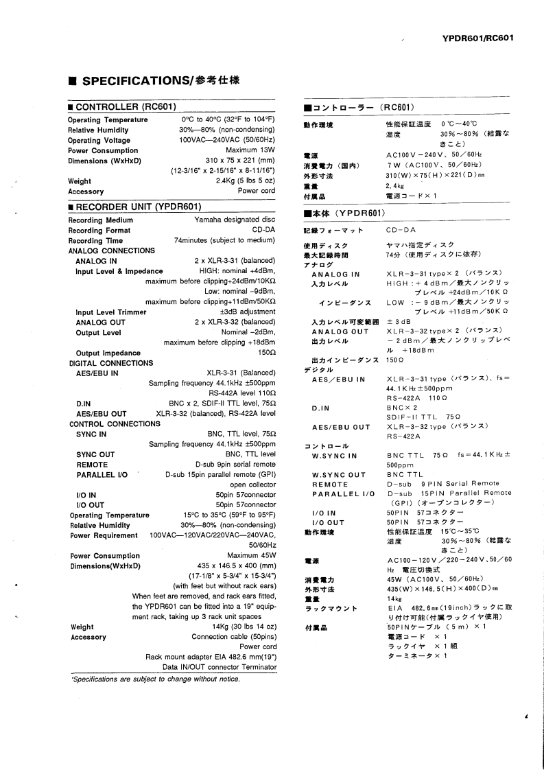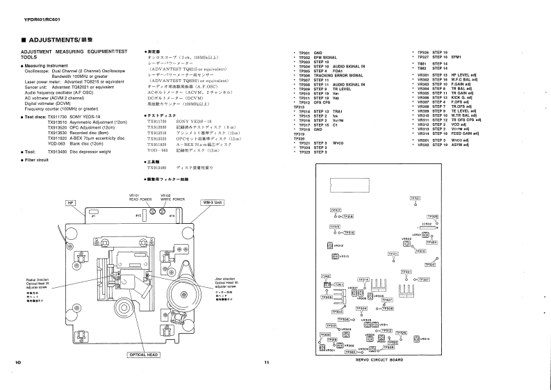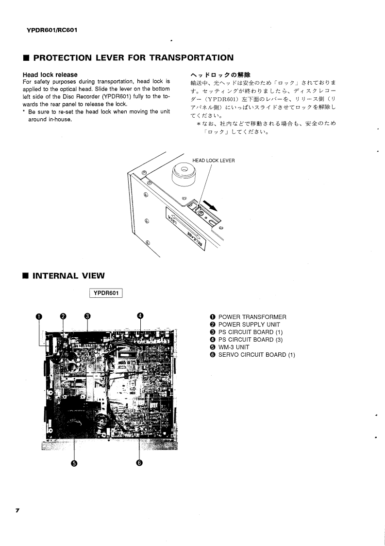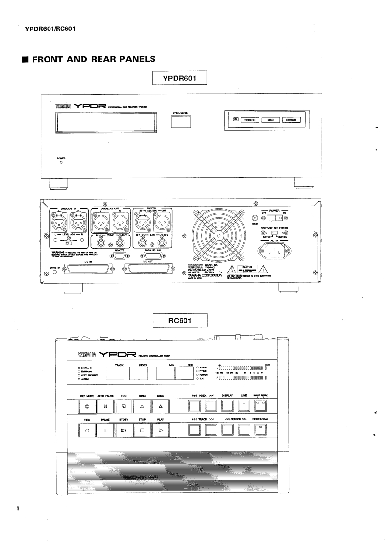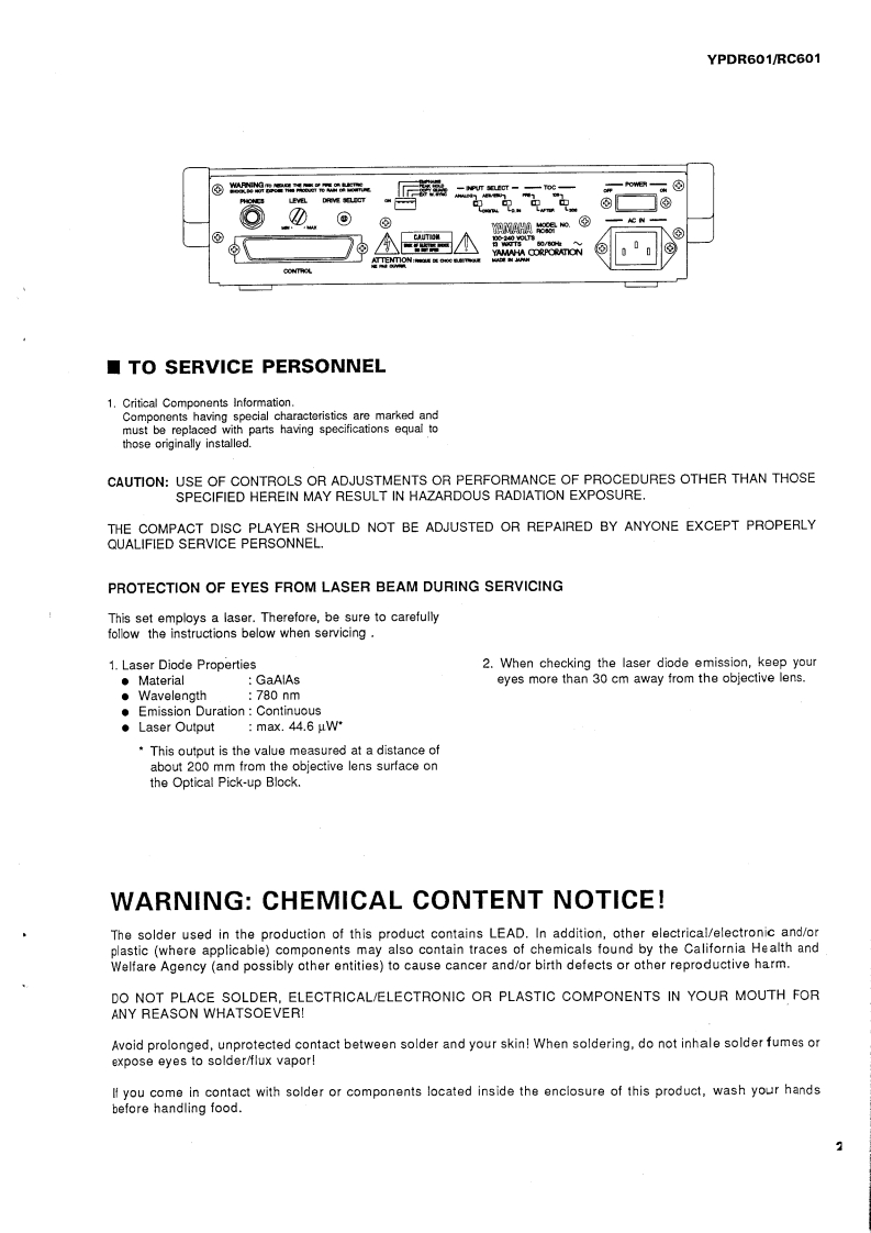 PROFESSIONAL DISC RECORDERYPDR601/RC601SERVICE MANUALIMPORTANT NOTICEThis manual has been provided for the use of authorized YAMAHA Retailers and their service petsonnel.WARNING:expensive conneats and lailure of theproduct to perform as specifiethat all service required shoald be performed by an authorized YAMAHA Fetailer or theppointed service representative.IMPORTANT:The presentation or sale of this manual to any individual or fim does ot constituteauthorization.certification or recognition of any applicable technical cpabilities,orestablish a principle-agent relstionship of any fom.The data provided is believed to beapplicable to the unit(s)indicated on the eThe reserch.and service deparments of YAMAHAe coy striving o improve YAMA ProducModifications are,therefare,inevitable and specifications are subject to change without notice o obligation toefShould anydiscrpayppeatleasethe distributors Service DivisioWARNING:Static discharges can destroy expensive components.Discharge any statie eectricity yourbody may have accumulated byounding yourself to the ground buss in t unit (heavyIMPORTANT:Tum the unit OFF during disassembly and parts replacement.Recheck all wek before youpply power to the unit■CONTENTSPANEL CONTROL.4.1一2IC DATA ......-.4654TO SERVICE PERSONNEL.3WAVEFORM OF TEST POINT.........55SPECIFICATIONS/参考仕檬..46SCHEMATIC DIAGRAM...5663PROTECTION LEVER FOR TRANSPORTATION........7BLOCK DIAGRAM.....464INTERNAL VIEW.INTERCONNECT WIRING DIAGRAM......64DISASSEMBLY PROCEDURES/分解手顺m89YPDR601 PARTS LIST...65-77ADJUSTMENT/整.10-29RC601 PARTS LIST...4-7881PRINTED CIRCUIT BOARD4444.3045PARTS LIST FOR CARBON RESISTORS.82011089YAMAHAYAMAHA CORPORATIONPO Box 1,Harm tsu,Japan