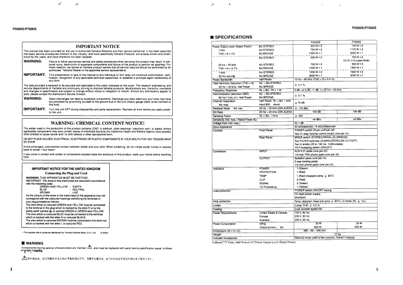 YAMU-03456POWER AMPLIFIERP5000S/P7000SSERVICE MANUALP5000S0)P笑AP7000SA manufacture number should use thisThe service manual of PA011698 should be used formanual with goods of 9 or more figures.the goods whose manufacture number is 7 figures.(本气二1T儿、型造滑号力9粉以上(取造番号7桁0)商品休。PA01169回)计-上入商品心使用《烂这。)了二z了儿卷C使用<这↓。)The example of a manufacture numberThe example of a manufacture number(型造帮号制(裂造开号例)UCCKX01001KL010019-11 figures7 figures(9~11桁)(7桁)■CONTENTS(目次)SPECIFICATIONS(合仕樣)3/4DIMENSIONS(法☒).5PERFORMANCE GRAPHS(特性☒).5PANEL LAYOUT(S礻儿L了ヴ卜).6CIRCUIT BOARD LAYOUT&WIRING(二y卜了卜&锆粮☒)8DISASSEMBLY PROCEDURE(分解手順)14IC BLOCK DIAGRAM(ICブ口y夕☒)21CIRCUIT BOARDS(y-卜基板☒)22NSPECTION(検查)35/43PARTS LISTBLOCK DIAGRAM(ブ口y夕了分ラ⊥)NIRING(基板钻粽☒)OVERALL CIRCUIT DIAGRAM(I回路☒)PA011756米YAMAHAHAMAMATSU.JAPANCopyright (c)Yamaha Corporation.All rights reserved.PDF-K765D4.11