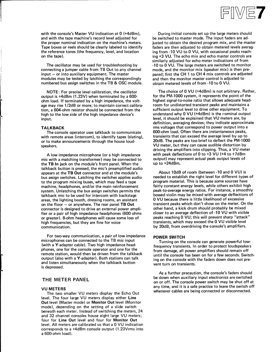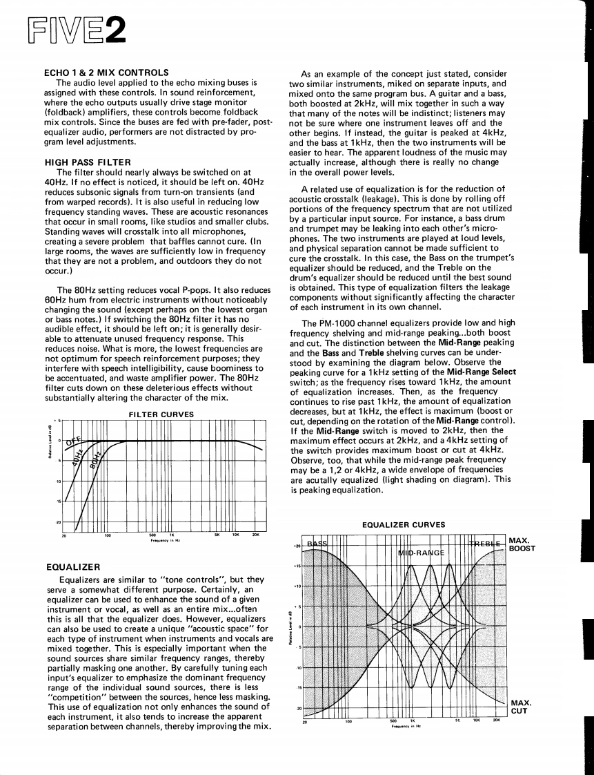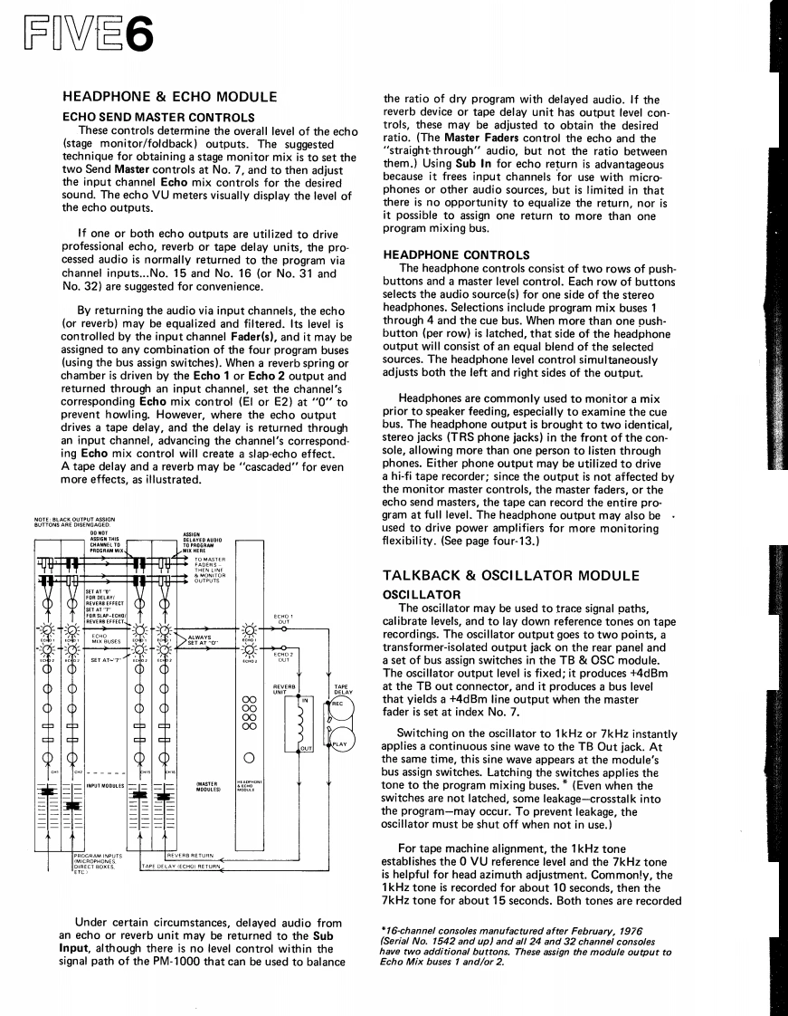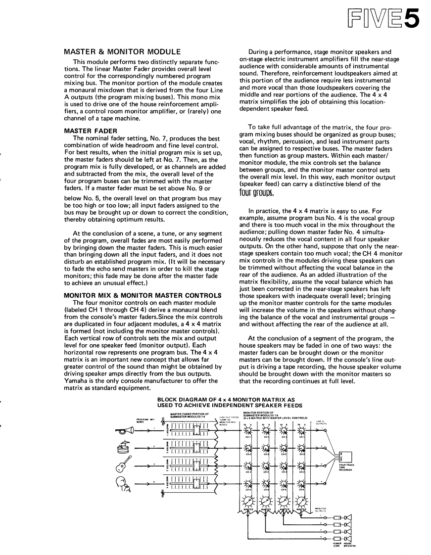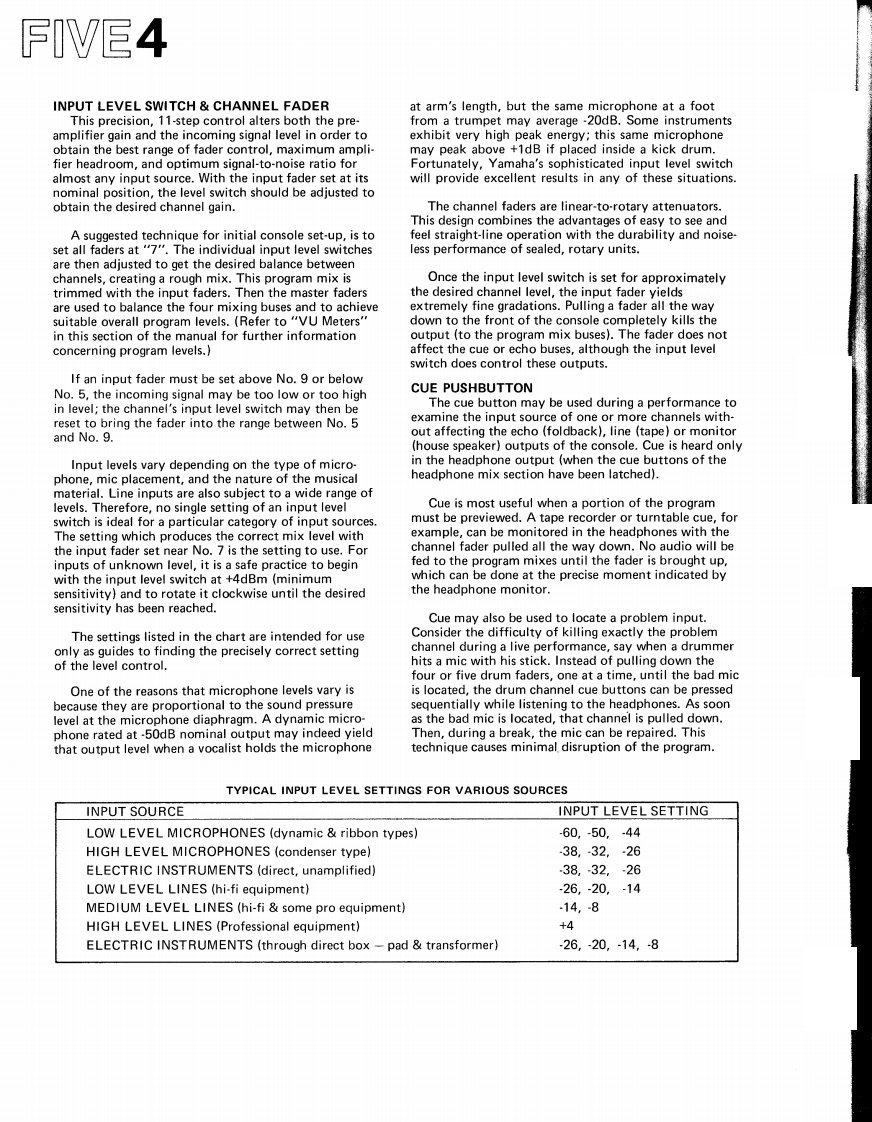 SECTION FIVE1HOW TO USEtions are heard as an overall muddy character,andTHE CONSOLEreversing the phase of one microphone may improve thesound by altering the frequencies at which cancellationoccurs.When time permits,each input may be examinedto hear whether reversing the phase will improve theoverall sound character of the mix.This should be doneafter the initial set up,during the sound check.Listen-ing is the only valid means to determine the best phasesetting,and meters are not likely to help.What soundsNOTE:The information presented in the followingbest is best,except when the program is being moni-section of the manual complements the basic featuretored with two or more channels and is being recordedcallouts in Section 1.In some cases,those callouts pro-in a format with fewer channels.vide sufficient information,so the feature has not beenincluded in this section.If,for example,a stereo live mix sounds good,but amonaural mix is being recorded,the monaural outputshould be examined to determine whether the reversal ofINPUT MODULEone or more channels'phase switches will improve themix.The stereo monitor can sound acceptable due toPHASE SWITCHacoustic delays that tend to correct out-of-phase signals,When two or more mics are receiving the same pro-whereas the same signals,when mixed together,cancelgram source (or one mic is receiving leakage from theto a greater degree.source intended for another mic)an out-of-phase con-dition may cause acoustic phasing cancellations that willOUTPUT ASSIGN SWITCHES PAN POTbe most noticeable in the low frequencies.To checkThe pan pot is designed so that when it is set a mid-inputs for correct phase,begin with all channels in therotation,it will feed the left buses(1&3)and the rightN mode.Assign mics 1 and 2 to the cue bus,placing thebuses (2 4)at maximum and equal level.This permitsmicrophones close together and near a sound sourcethe pan pot to be moved off center during a performancethat contains appreciable bass.Using Input Level,without risk of overloading the channel(s)to which thematch the level of the two microphones.Then,listeningsignal is moved.In stereo sound reinforcement situationsto the blend of the two inputs in the cue headphones,as the pan pot is rotated to the mid-point,there is a 3dBreverse the phase of mic 2 by moving its phase switchacoustic build up at the center of the audience,makingto R.If the bass increases,leave the switch in R modethe audience aware of the intended motion.This un-and if the bass decreases,return the switch to N.Thisusually effective method of panning is an exclusiveestablishes an in-phase condition between mics 1 and 2.Yamaha feature.Repeat the procedure for mics 1 and 3,1 and 4,and soforth until all inputs have been compared to mic 1.LineThe pan pot and output assign switches are operatedinputs may be checked in a similar fashion,listening fortogether to achieve precisely the desired placement ofa decrease or increase in the bass content of the programthe input source i