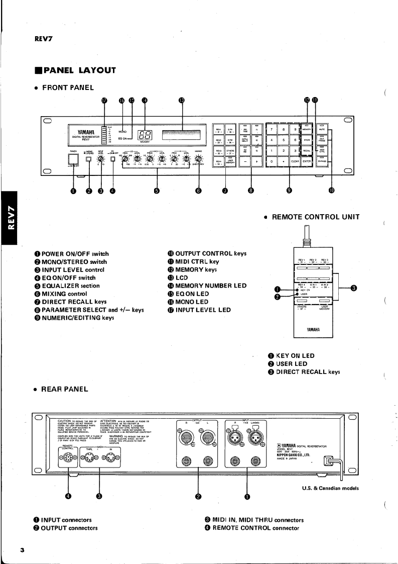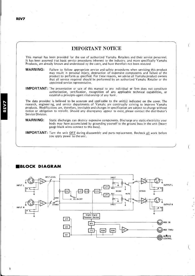 DIGITAL REVERBERATORREV7SERVICE MANUALREV7YAMAHAw宁”■CONTENTSIMPORTANT NOTICE1FUNCTIONAL BLOCK DIAGRAM ANDBLOCK DIAGRAM...·SIGNAL FLOW.,,,······:·13SPECIFICATIONSDIMENSIONS..22CIRCUIT DESCRIPTION………1418UNIT LAYOUT.,,··19PANEL LAYOUT.......................3CHECKS AND ADJUSTMENTS.·..,,,,,.20/21RO0 M SIZE CHART...·,··4DIAGNOSTIC PROGRAMS ..·…22~24MEMORY [ROM)CONTENTS ANDIC PIN ASSIGNMENTS AND FUNCTIONS .25~26CONTROLLABLE PARAMETERSMIDI IMPLEMENTATION CHART..........27GENERAL INFORMATION...6~1CIRCUIT BOARDS…….2832EXPLANATION OF PARAMETERS.····6PARTS LIST .......……….3339RECALL/EDIT/STORE11SCHEMATIC DIAGRAM.··..··..40/41MIDI CONTROL12STEREO/MONO AND EQUALIZER.·.····,SINCE 1887YAMAHA006664NPPON'GAKK.CO.LTD.HAMAMATSU,JAPAN1.81K-415▣①Printed in Japan85.10