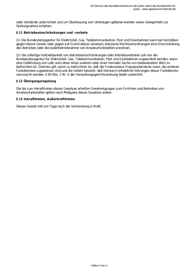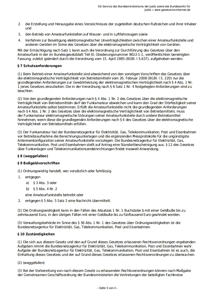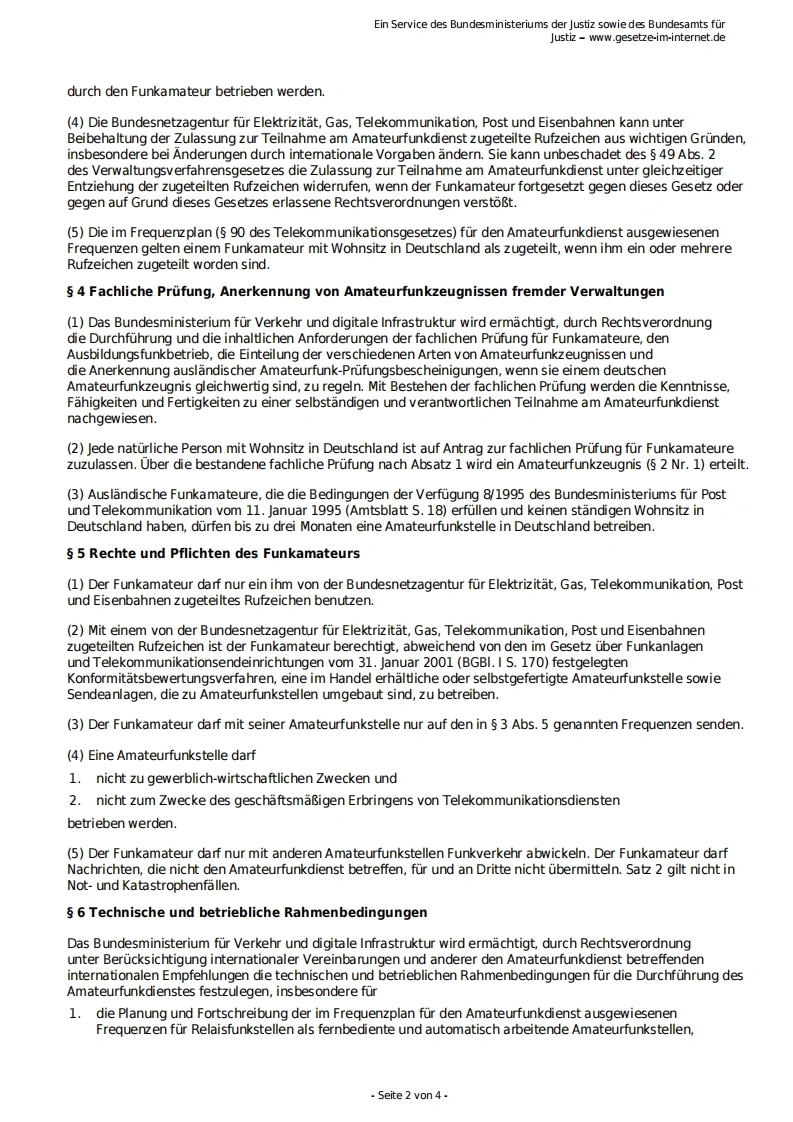 Ein Service des Bundesministeriums der Justiz sowie des Bundesamts furJustiz-www.gesetze-im-internet.deGesetz uber den Amateurfunk (Amateurfunkgesetz -AFuG 1997)AFuG 1997Ausfertigungsdatum:23.06.1997Vollzitat:"Amateurfunkgesetz vom 23.Juni 1997 (BGBI.I S.1494),das zuletzt durch Artikel 53 des Gesetzes vom 23.Juni2021(BGBI.I S.1858)geandert worden ist"Stand:Zuletzt geandert durch Art.53 G v.23.6.2021 I 1858FuBnote(++Textnachweis ab:28.6.1997+++)s 1 GeltungsbereichDieses Gesetz regelt die Voraussetzungen und die Bedingungen fur die Teilnahme am Amateurfunkdienst.2 BegriffsbestimmungenIm Sinne dieses Gesetzes ist1.Funkamateur der Inhaber eines Amateurfunkzeugnisses oder einer harmonisierten Amateurfunk-Prufungsbescheinigung auf Grund der Verfugung 9/1995 des Bundesministeriums fur Post undTelekommunikation vom 11.Januar 1995 (Amtsblatt S.21),der sich mit dem Amateurfunkdienst auspersonlicher Neigung und nicht aus gewerblich-wirtschaftlichem Interesse befa Bt,2.Amateurfunkdienst ein Funkdienst,der von Funkamateuren untereinander,zu experimentellenund technisch-wissenschaftlichen Studien,zur eigenen Weiterbildung,zur Volkerverstandigungund zur Unterstutzung von Hilfsaktionen in Not-und Katastrophenfallen wahrgenommen wird;derAmateurfunkdienst schlieBt die Benutzung von Weltraumfunkstellen ein.Der Amateurfunkdienst und derAmateurfunkdienst uber Satelliten sind keine Sicherheitsfunkdienste,3.eine Amateurfunkstelle eine Funkstelle,die aus einer oder mehreren Sendefunkanlagen undEmpfangsfunkanlagen einschlieBlich der Antennenanlagen und der zu ihrem Betrieb erforderlichenZusatzeinrichtungen besteht und die auf mindestens einer der im Frequenzplan fur den Amateurfunkdienstausgewiesenen Frequenzen betrieben werden kanns 3 Voraussetzungen zur Teilnahme am Amateurfunkdienst,Rufzeichen,Frequenzzuteilung(1)Die Bundesnetzagentur fur Elektrizitat,Gas,Telekommunikation,Post und Eisenbahnen(S 10)laBt einenaturliche Person unter gleichzeitiger Zuteilung eines personengebundenen Rufzeichens auf Antrag zurTeilnahme am Amateurfunkdienst zu,wenn sie eine fachliche Prufung fur Funkamateure erfolgreich abgelegtoder eine Amateurfunk-Prufungsbescheinigung nach 2 Nr.1 vorgelegt hat.(2)Die Bundesnetzagentur fur Elektrizitat,Gas,Telekommunikation,Post und Eisenbahnen teilt demFunkamateur auf Antrag weitere Rufzeichen zu.Das Bundesministerium fur Verkehr und digitale Infrastrukturwird ermachtigt,durch Rechtsverordnung das Verfahren der Zuteilung und Einzelheiten der Anwendung undMitbenutzung von Rufzeichen zu regeln.(3)Eine Amateurfunkstelle darf erst nach der Zulassung zur Teilnahme am Amateurfunkdienst und der Zuteilung1.eines personengebundenen Rufzeichens,2.eines Rufzeichens fur den Ausbildungsfunkbetrieb oder3.eines Rufzeichens fur fernbediente und automatisch arbeitende Amateurfunkstellen oder4.eines Rufzeichens fur KubstationenSeite 1 von 4-