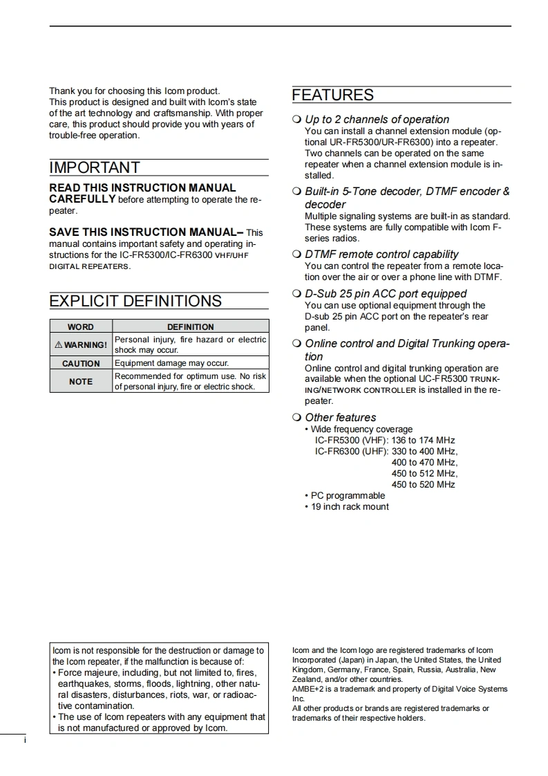 IC-FR5300_FR6300_ENG_IM_3找手册网22天前发布关注私信1.14MB21页042IC-FR5300_FR6300_ENG_IM_3此内容为付费资源,请付费后查看¥19¥21黄金会员免费钻石会员免费登录购买付费资源 第1页 / 共21页 第2页 / 共21页 第3页 / 共21页 第4页 / 共21页 第5页 / 共21页 第6页 / 共21页 第7页 / 共21页 第8页 / 共21页 第9页 / 共21页 第10页 / 共21页 试读已结束,还剩11页,您可下载完整版后进行离线阅读 THE END艾可慕 文本预览 iCOMINSTRUCTION MANUALVHF DIGITAL REPEATERIC-FR5300信圈ǒ目HHWMmUHF DIGITAL REPEATERIC-FR6300Icom Inc. 查看更多 收起部分 喜欢就支持一下吧收藏