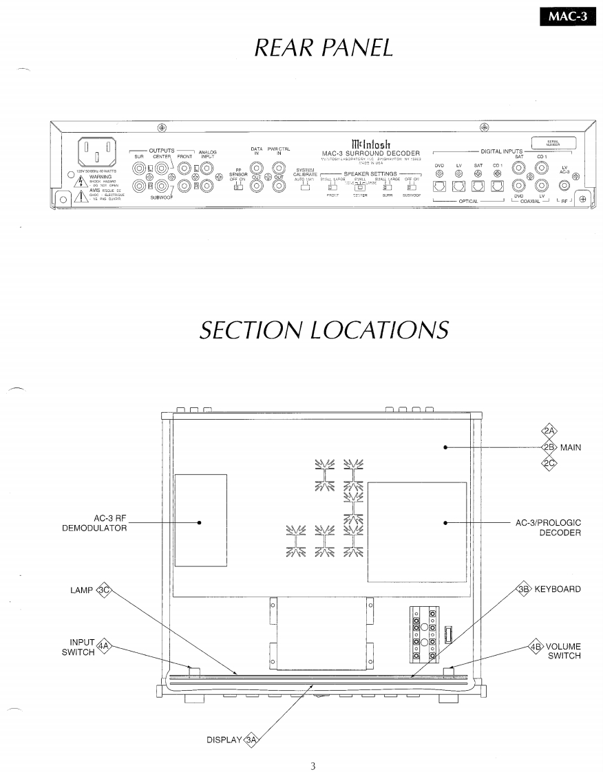是《C-3SURROUND DECODER▣回IIclnfosh田MAC-3 SURROUNO DECODER27四出的uLATE34TRE-EO0网CONTENTSPerformance Specifications2Notes...............................Rear Panel.....3Section Locations3Block Diagram……4Interconnection Diagram .............…5-6Main Schematic and PCB........................7-12Display,Keyboard,Lamp Schematics and PCBs.....13-14Input,Volume Switch and pcB...15Parts List.…15-16Exploded View and Parts List....17-18Repacking Instructions ............19ItlnfoshSERVICE MANUAL