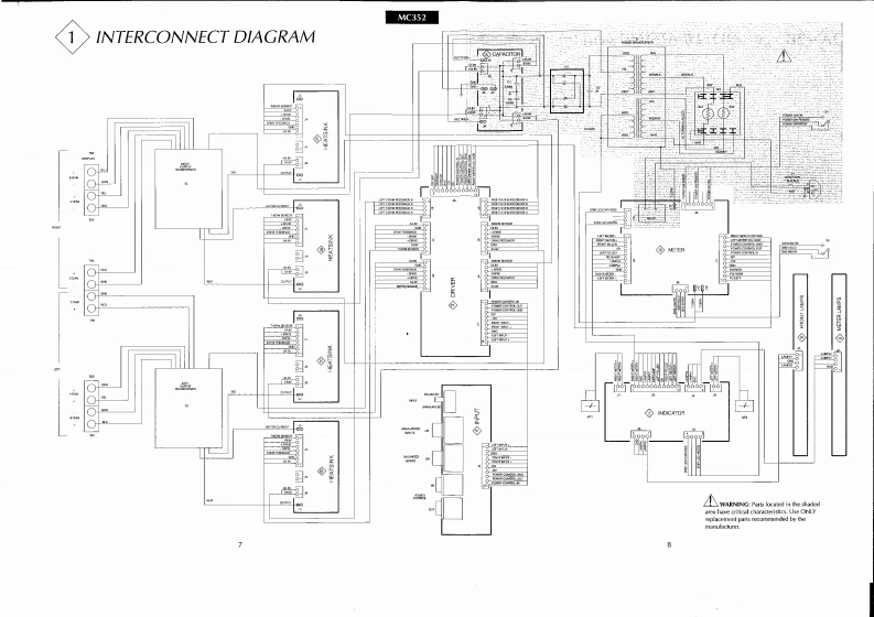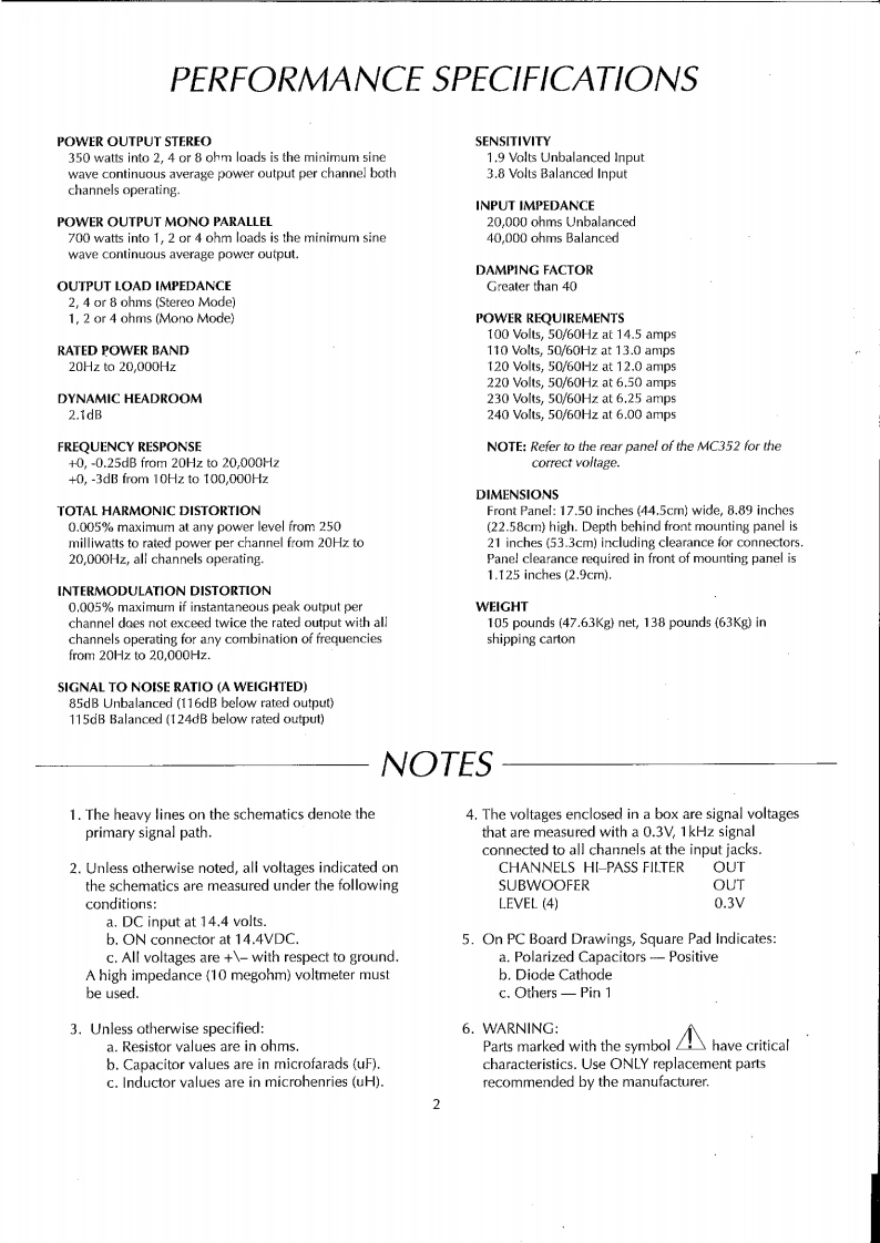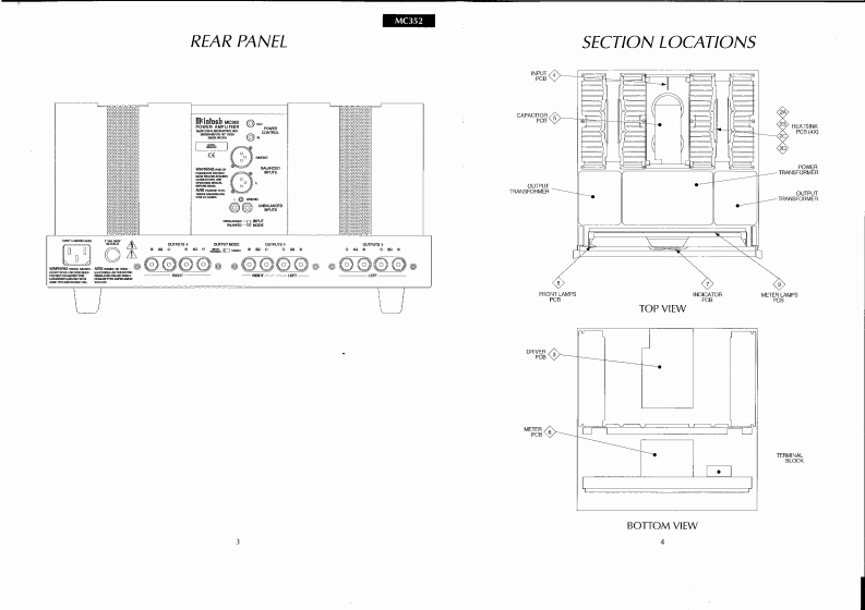 AC352POWER AMPLIFIER3,5.35.3535353503.550403080100品35.3539353502504000和0t=POWER QUTPUTPOWER GUTPUTPCWERmtlnioshMC352 POWER AMPLIFIERCONTENTSPerformance Specifications.2Input Schematic and PCB.14-15...2Capacitor Schematic and PCB......16Rear Panel......................3Meter Schematic and PCB..17-19Section Locations.4Indicator Schematic and PCB20Block Diagram............................5-6Lamp Schematics and PCBs.21-22Interconnection Diagram ....7-8Parts List…23-25Heatsink Schematic and PCB..9-10Exploded View and Parts List...26-28Driver Schematic and PCB.11-13Repacking Instructions29ItlntoshSERVICE MANUAL