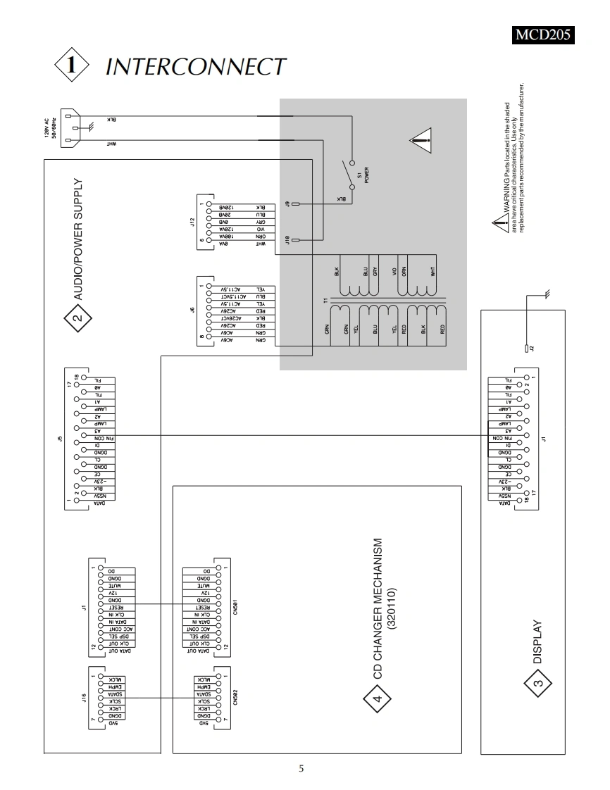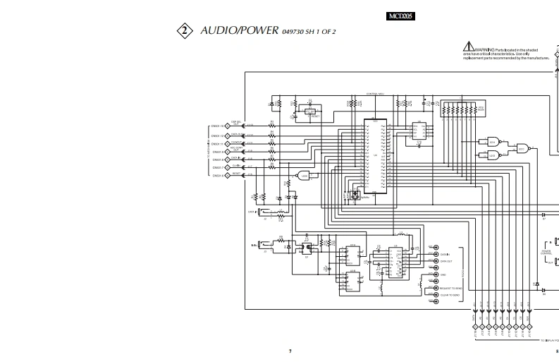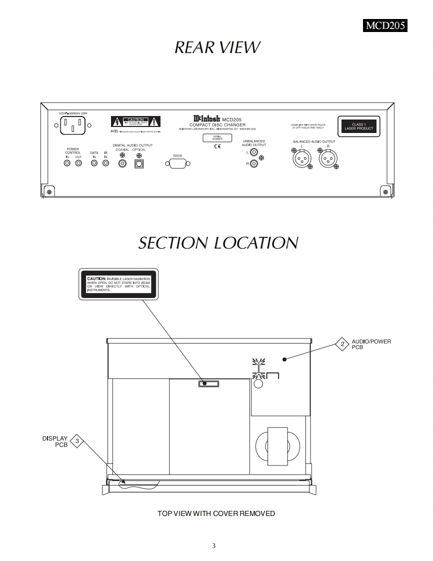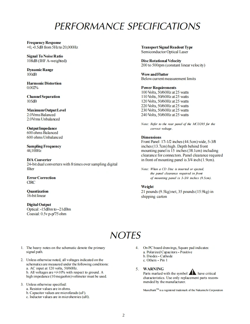 MCD205COMPACT DISCCHANGERIclnfoshMucicBowkSyawMCD205 COMPACT DISC CHANGERPLAY2.99“遥疆1啦CONTENTSPerformance Specifications2Audio/Power Schematic and PCB..7.12Notes………Display Schematic and PCB13-16Rear View and Section Location.Parts List17-18Block DiagramExploded View and Parts Lists.......19.20Interconnection Diagram ..5Repacking Instructions......21lclntoshSERVICE MANUAL